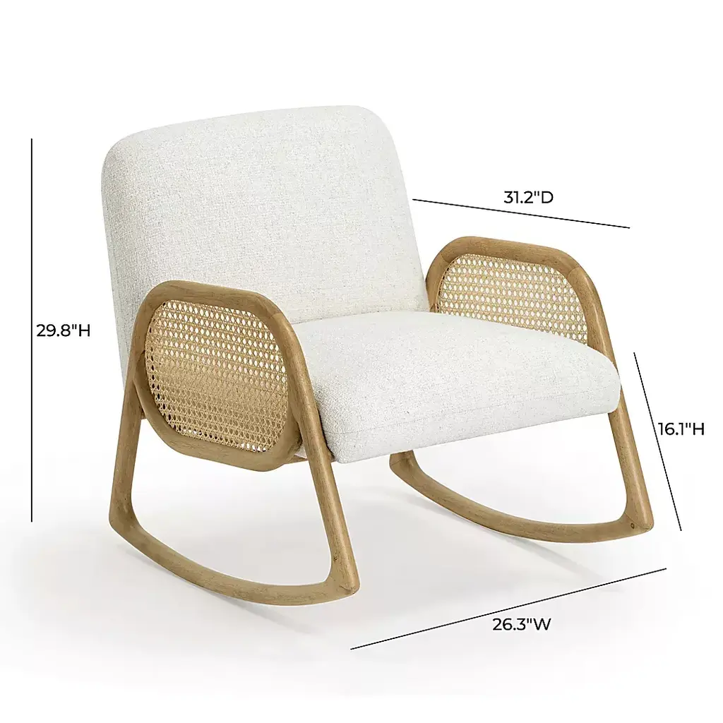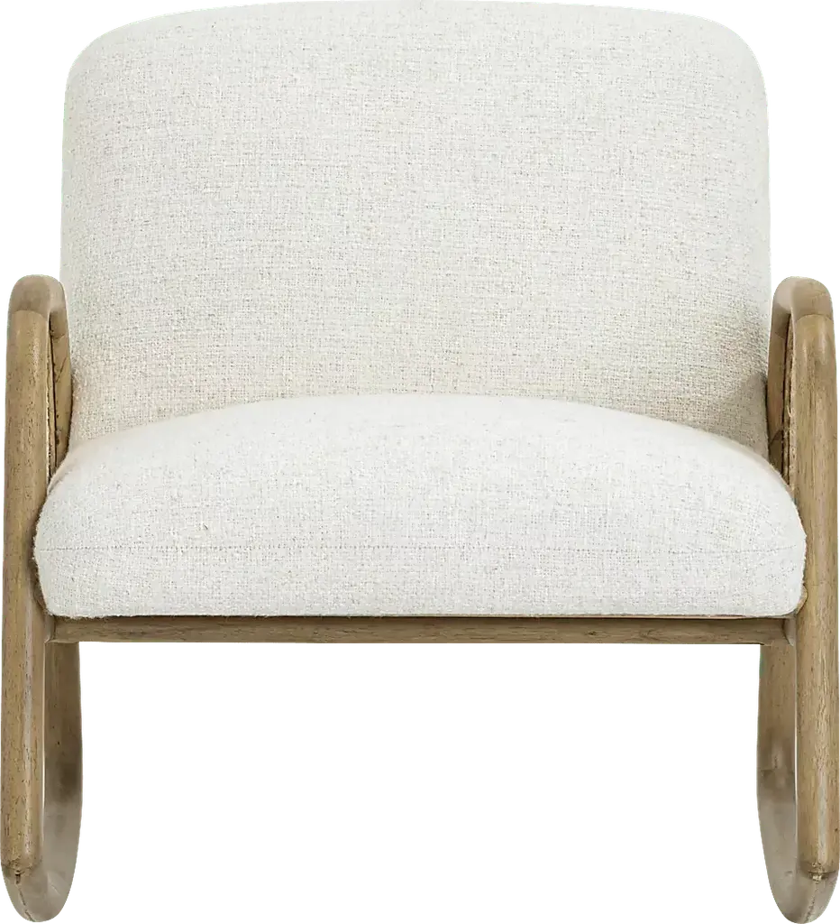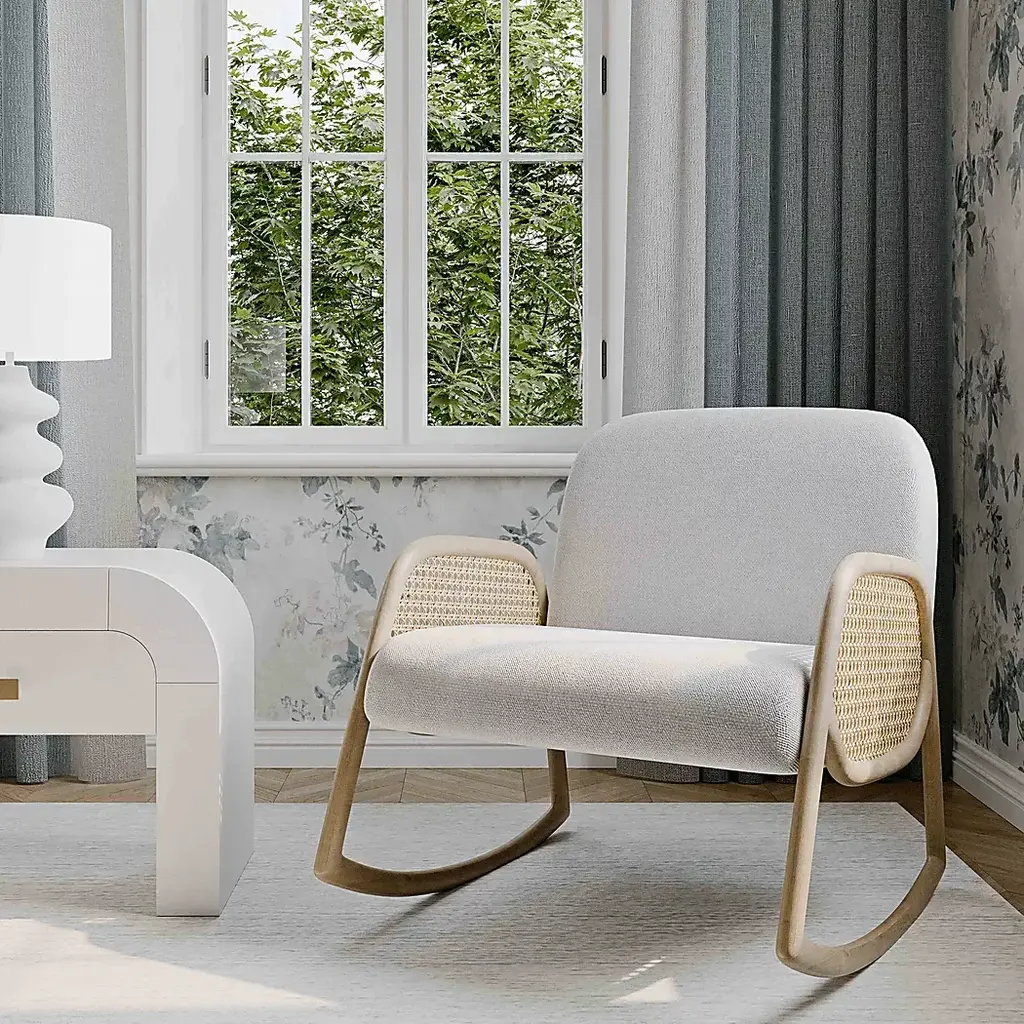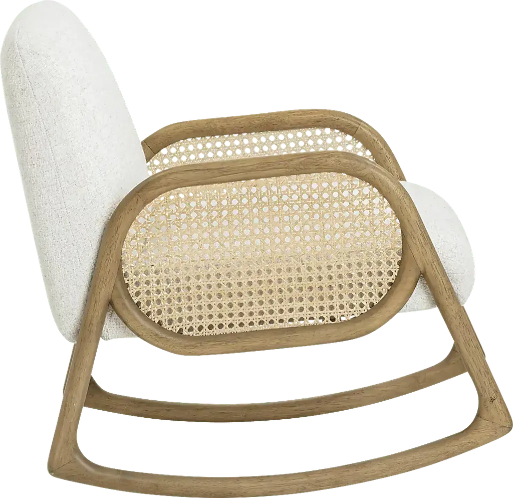 A fresh spin on a classic, the Antartsa cream accent chair stuns with cane details, a solid wood frame, and a smooth, natural rocking motion. Wrapped in easy to clean performance fabric with plush foam seating, it's the perfect blend of style and comfort. Customer assembly is required.