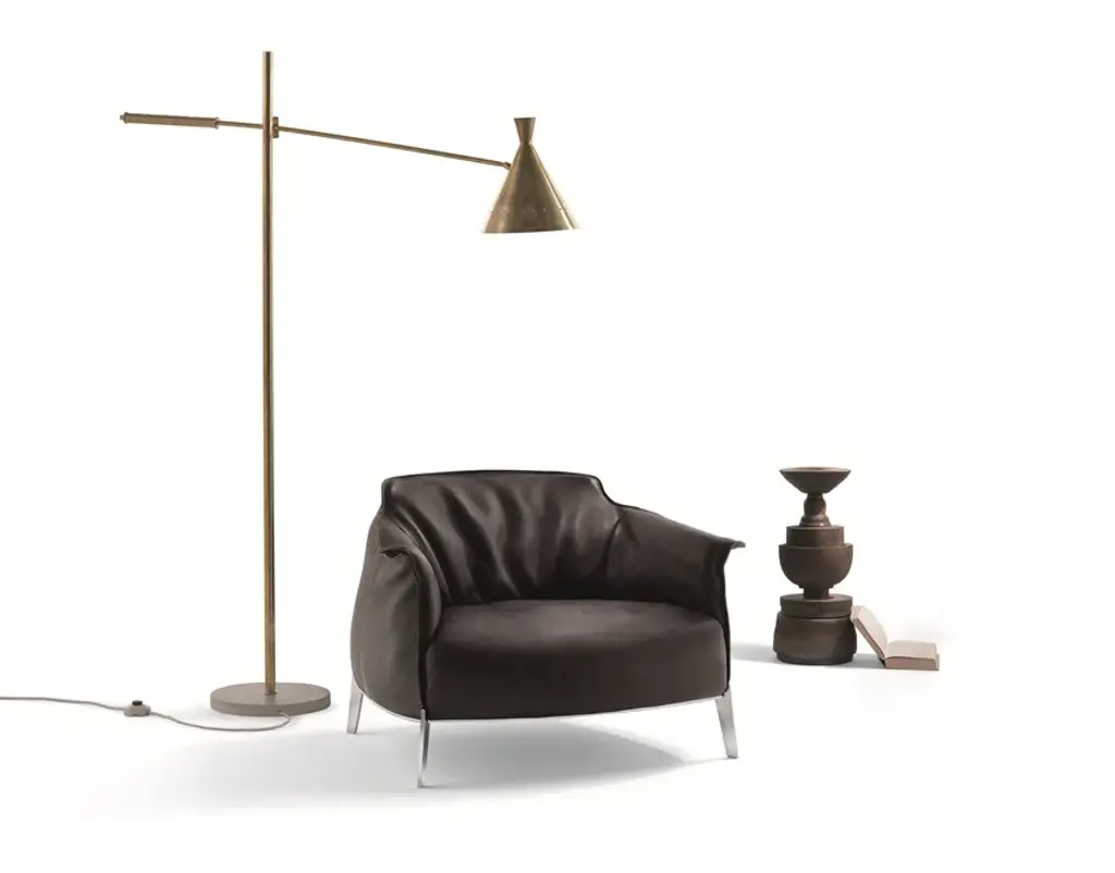 Jean-Marie Massaud has designed the Archibald Gran Comfort with a completely new interpretation of the Archibald project, of which it offers a refined and informal version.The central element is the large seat cushion: a luxurious and soft leather sack with abundant goosedown padding forms a contrast with the architectural style of the steel chair frame. The four feet, also made in steel, create an interesting visual counterpoint with the richness of the cushion. Extremely thin and light, they almost seem to be sketched in pencil.The quilted goose-down baffle padding of the seat and backrest enhances the softness of the armchair. The overall sensation is of different elements naturally combined, creating a seat ofintentionally generous and welcoming proportions.The removable upholstery is available exclusively in the new Pelle Frau® Safari leather, decidedly thicker and more substantial with a much more evident grain compared to the other leathers in the Poltrona Frau collection. Its textured appearance perfectly enhances the great elegance of the Archibald Gran Comfort. The trim is embellished by raw cut leather, hand-painted and painstakingly finished with contrasting stitching , like luxury leather goods.The steel frame and feet have the Ruthenium finish, while the suspension of the beech seat is provided by elastic straps that continue along the outer edge of the steel-framed backrest offering an added element of comfort.