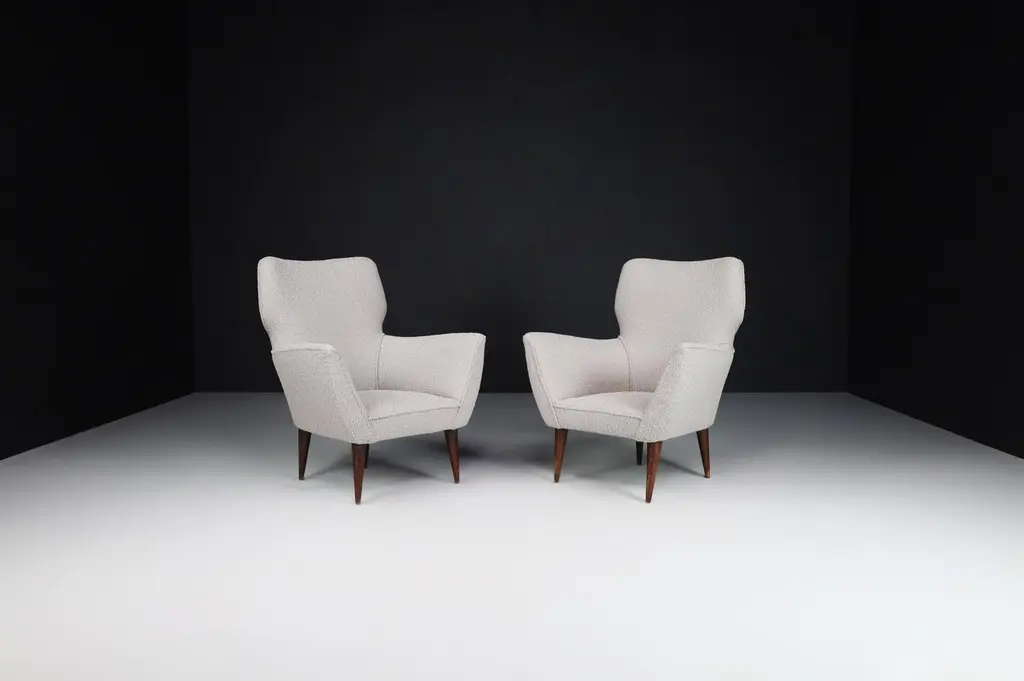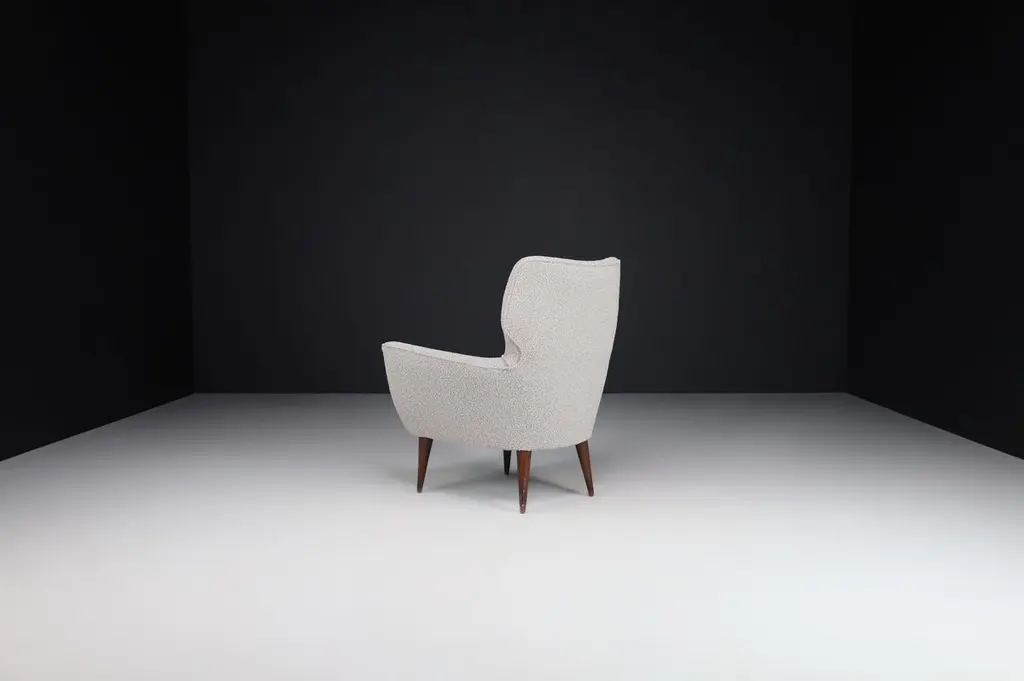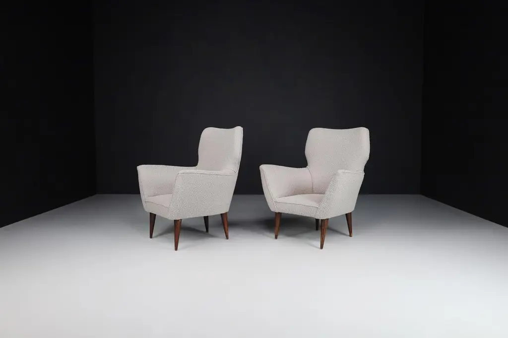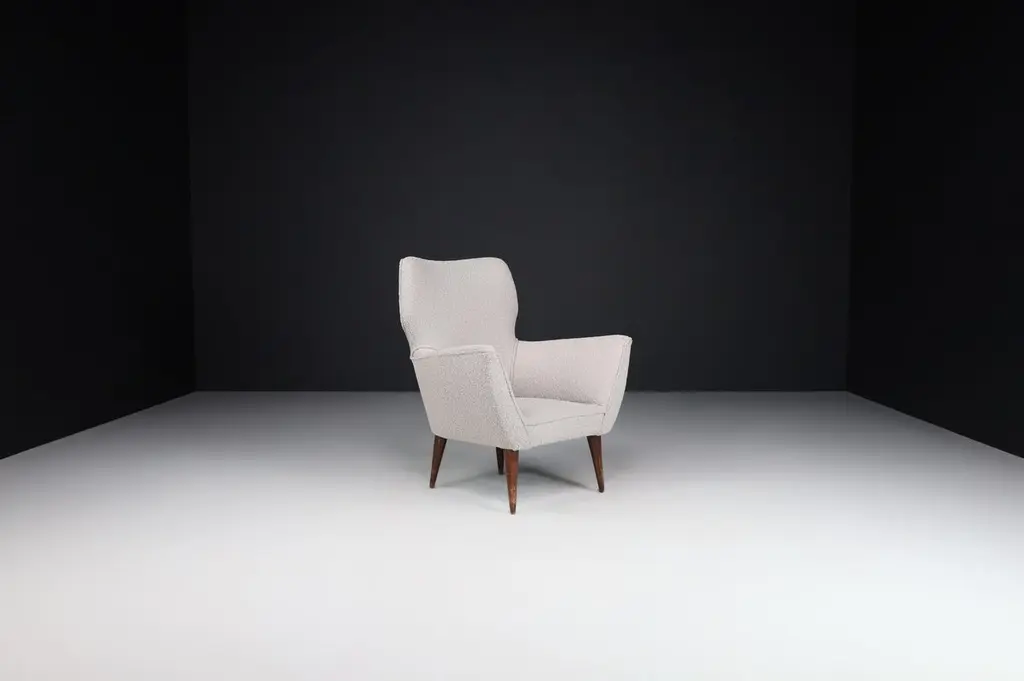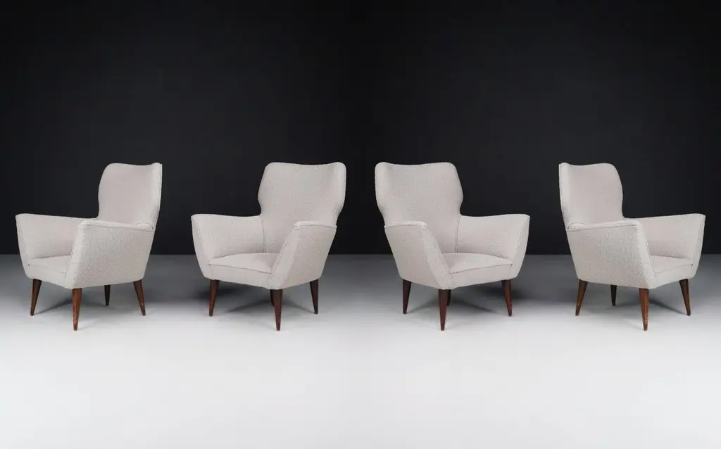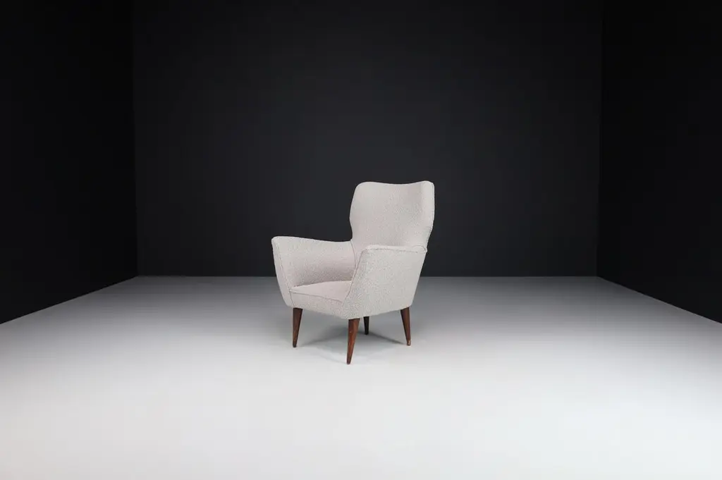 Armchairs with Tapered Wooden Legs in the style of Gio Ponti, Italy, in the 1950s. Large set armchairs with tapered wooden legs in new upholstery in the style of Gio Ponti designed and produced in the 1950s in characteristic Italian style. Thanks to their elegant backrests and seating, these armchairs get a characteristic, visually compelling shape. The delicate tapered legs are executed in wood that lifts the seat from the ground. These chairs would be an eye-catching addition to any interior, such as the living room, family room, screening room, or office. It also perfectly fits hospitality or corporate areas like a boutique hotel lobby, cocktail bar, members club, or luxury loft.