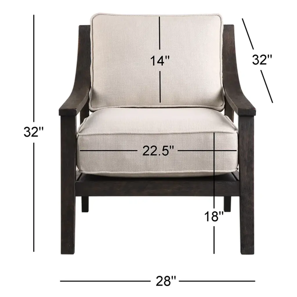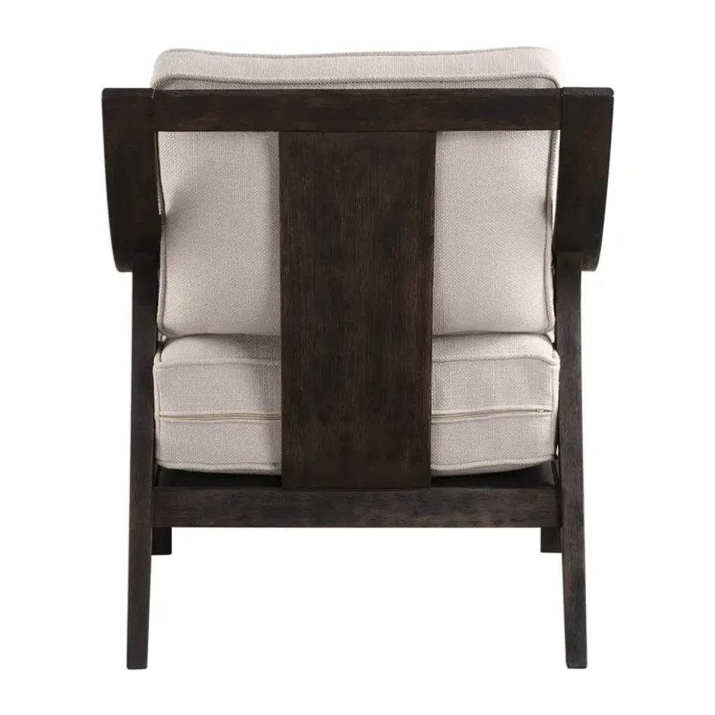 A casual combination with a modern take, this armchair features a dramatically curved rustic hardwood frame with exposed grain under a rich walnut finish. Welt trimmed comfortable box cushions are a neutral beige linen blended fabric.