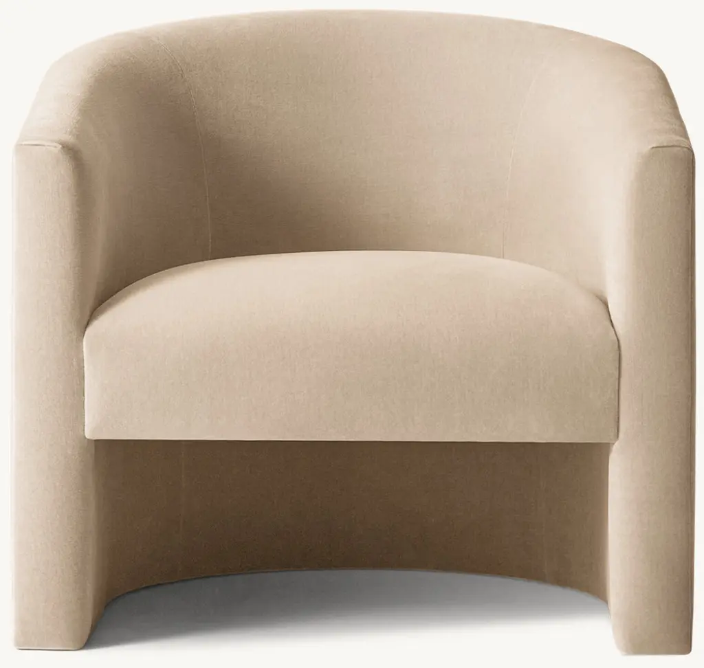 Inspired by the sculptural, kinetic shapes of the 1970s, our Arrondi chair by the Van Thiels is a mix of soft curves and straight lines. A fully upholstered barrel form segues to sharply angled armrests, while the seat seemingly floats in midair. The open scooped base creates an intriguing interplay of positive and negative space. ALSO AVAILABLE IN LEATHER