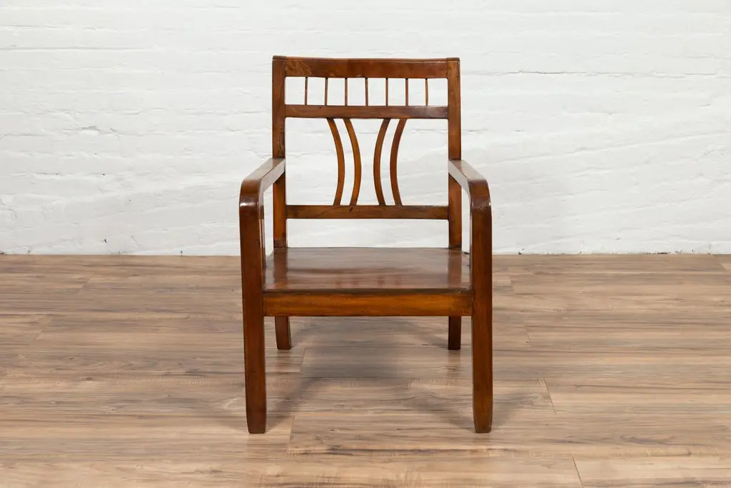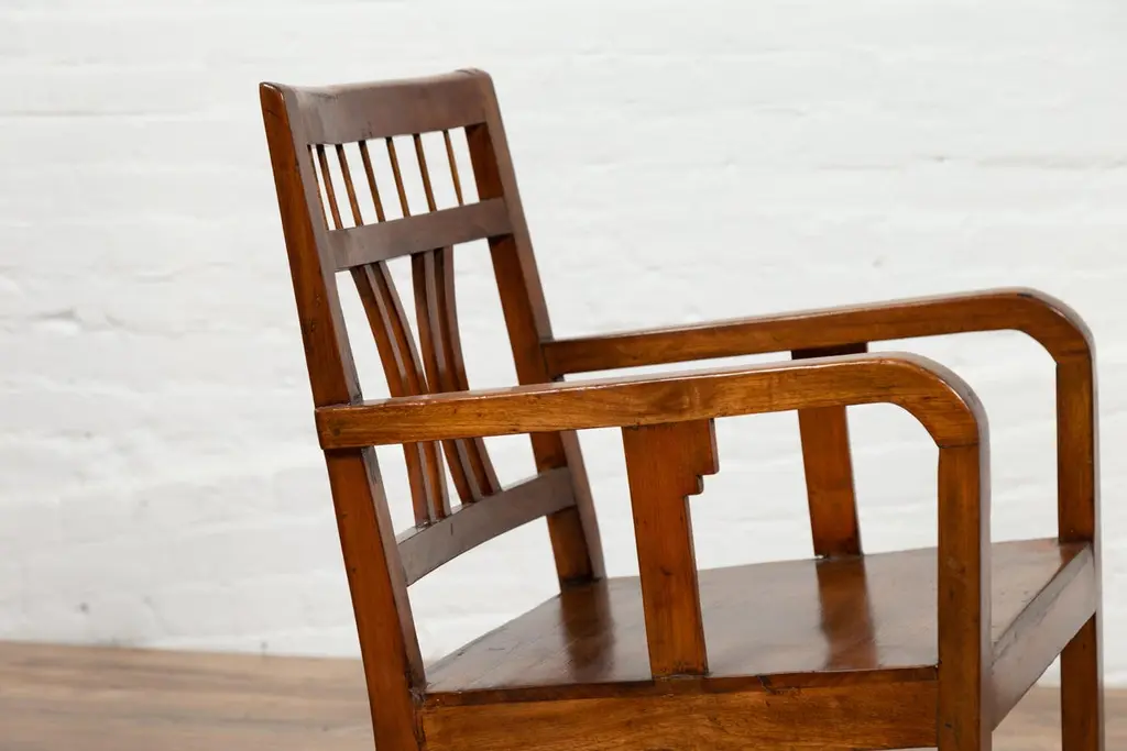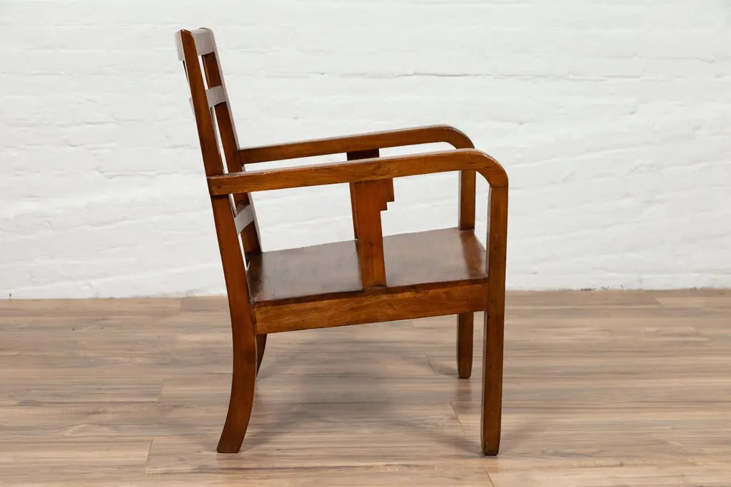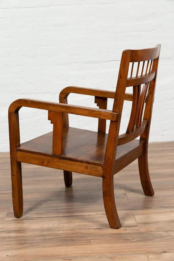 A Chinese vintage Art Deco style elmwood armchair from the mid-20th century, with pierced back and brown patina. Experience the elegant fusion of Art Deco design and traditional elmwood craftsmanship with this vintage armchair from the mid-20th century. This chair, with its pierced back, linear supports, and warm brown patina, beautifully captures the aesthetic sensibilities of the Art Deco period.The chair's defining feature is its slightly slanted pierced back, adorned with straight slats and delicately curving motifs that exemplify the geometric elegance of Art Deco style. This artistic backrest flows seamlessly into the hind saber-shaped legs, creating a cohesive and graceful silhouette. The rectangular seat, offering comfort and support, is flanked by two curving open arms, accented with linear supports that reinforce the chair's Art Deco character.Resting on straight frontal legs, the chair exudes stability and symmetry. The warm brown patina of the elmwood adds a sense of depth and history, highlighting the wood's natural beauty and the chair's vintage charm.In a modern home, this Art Deco style elmwood armchair serves as a stylish and versatile addition. It can be placed in a bedroom, office, or living room, where its unique design and historical appeal can be appreciated. The chair's clean lines and classic patina make it suitable for various interior styles, adding a touch of mid-20th-century elegance and the allure of Art Deco design to your space. Whether used for seating or as a decorative element, this armchair brings a blend of artistic design and traditional craftsmanship into your home.