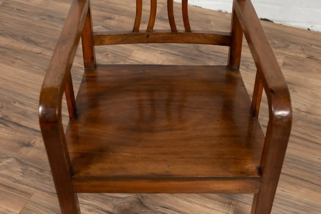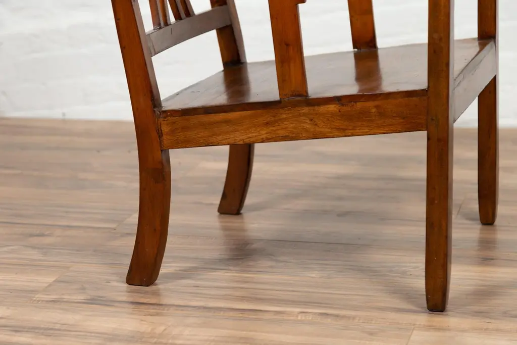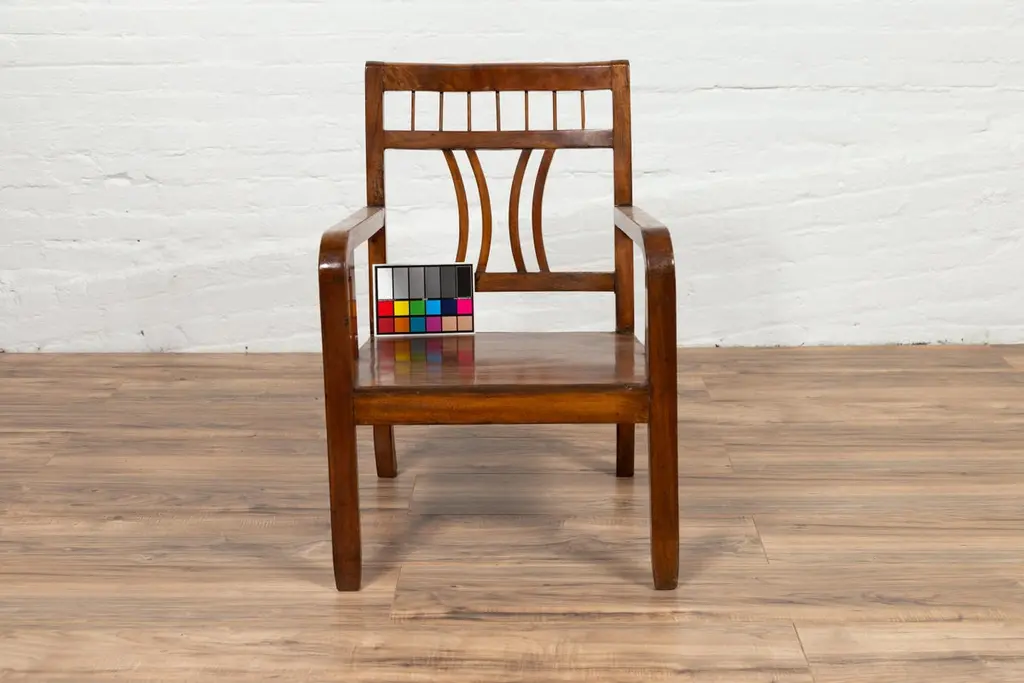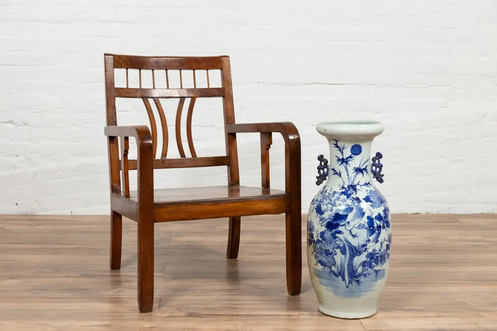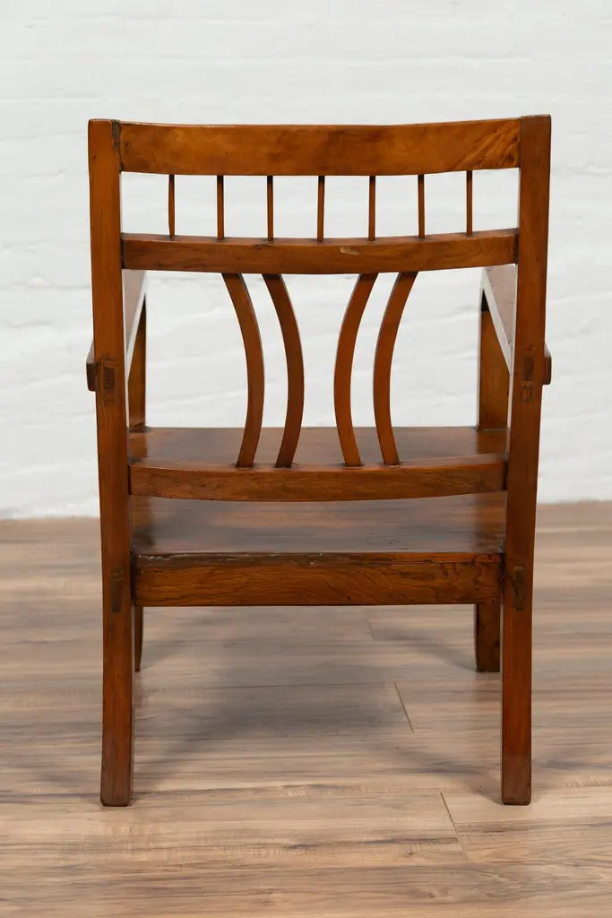 A Chinese vintage Art Deco style elmwood armchair from the mid-20th century, with pierced back and brown patina. Experience the elegant fusion of Art Deco design and traditional elmwood craftsmanship with this vintage armchair from the mid-20th century. This chair, with its pierced back, linear supports, and warm brown patina, beautifully captures the aesthetic sensibilities of the Art Deco period.The chair's defining feature is its slightly slanted pierced back, adorned with straight slats and delicately curving motifs that exemplify the geometric elegance of Art Deco style. This artistic backrest flows seamlessly into the hind saber-shaped legs, creating a cohesive and graceful silhouette. The rectangular seat, offering comfort and support, is flanked by two curving open arms, accented with linear supports that reinforce the chair's Art Deco character.Resting on straight frontal legs, the chair exudes stability and symmetry. The warm brown patina of the elmwood adds a sense of depth and history, highlighting the wood's natural beauty and the chair's vintage charm.In a modern home, this Art Deco style elmwood armchair serves as a stylish and versatile addition. It can be placed in a bedroom, office, or living room, where its unique design and historical appeal can be appreciated. The chair's clean lines and classic patina make it suitable for various interior styles, adding a touch of mid-20th-century elegance and the allure of Art Deco design to your space. Whether used for seating or as a decorative element, this armchair brings a blend of artistic design and traditional craftsmanship into your home.