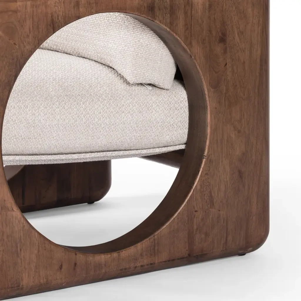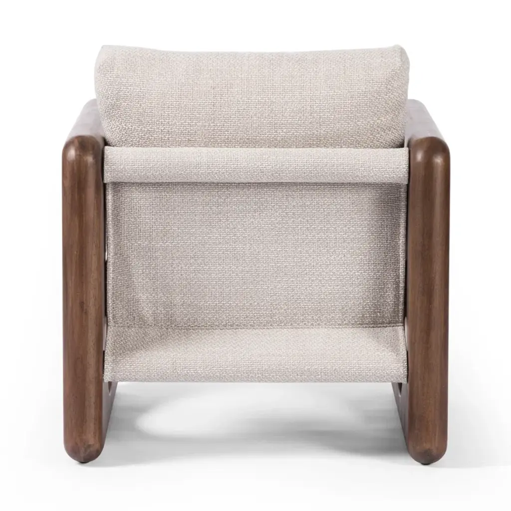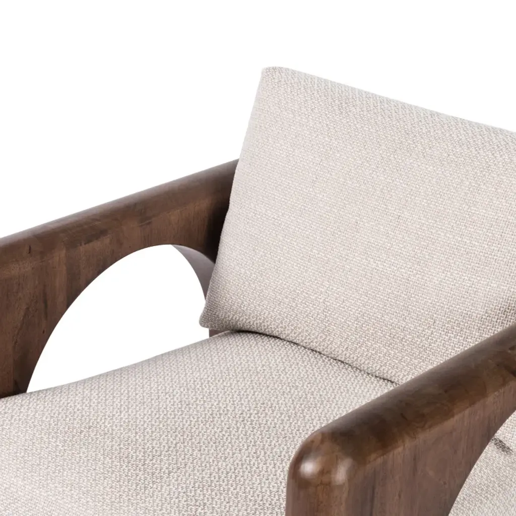 Contrasting shapes come together to form a modern yet vintage-inspired armchair. Solid parawood frame features large circular cutouts and is smoothed and rounded on all sides for extra movement. Sling chair construction is topped with loose feather-blend cushions covered in a heavily textured performance fabric. Performance fabrics are specially created to withstand spills, stains, high traffic, and wear, ensuring long-term comfort and unmatched durability.