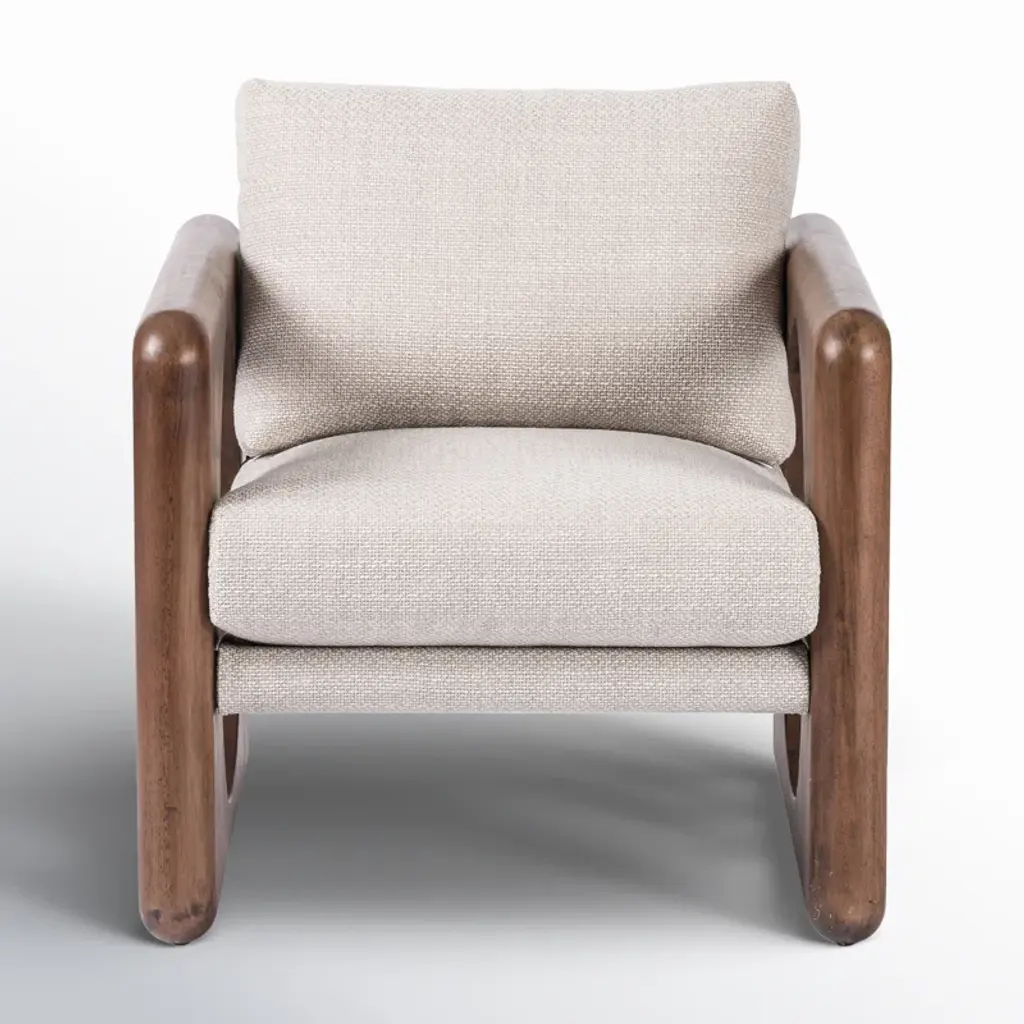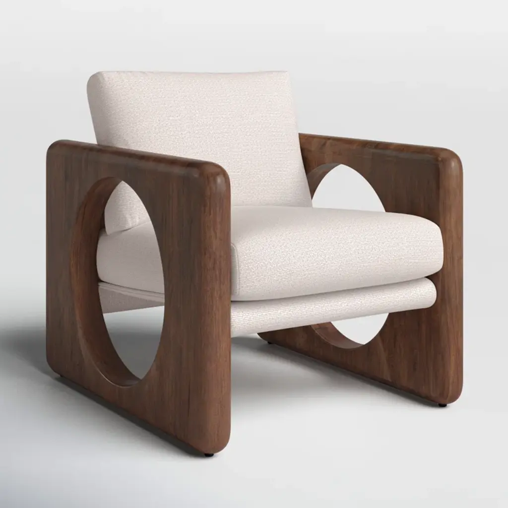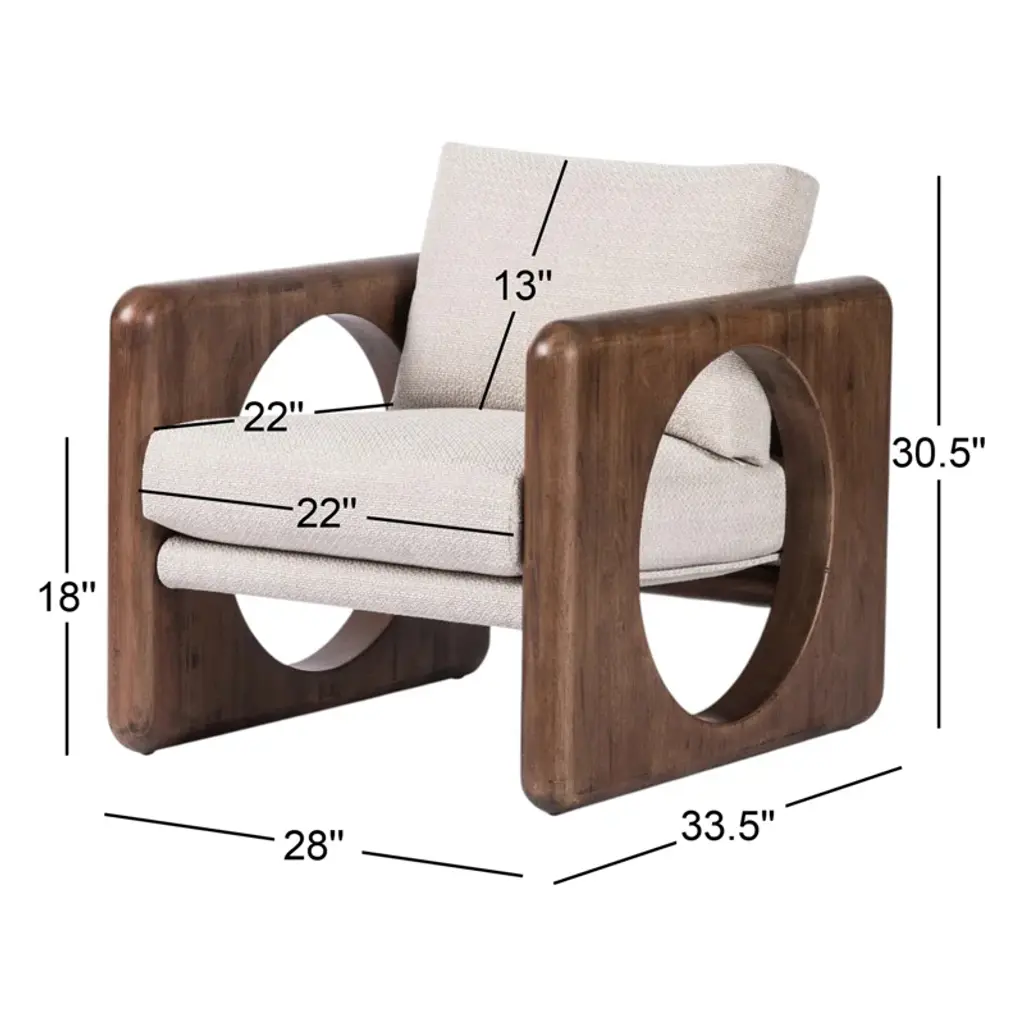 Contrasting shapes come together to form a modern yet vintage-inspired armchair. Solid parawood frame features large circular cutouts and is smoothed and rounded on all sides for extra movement. Sling chair construction is topped with loose feather-blend cushions covered in a heavily textured performance fabric. Performance fabrics are specially created to withstand spills, stains, high traffic, and wear, ensuring long-term comfort and unmatched durability.