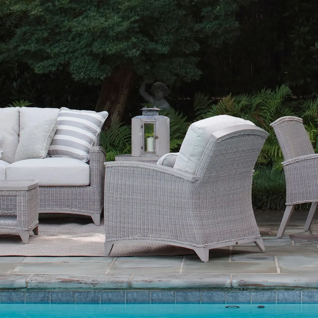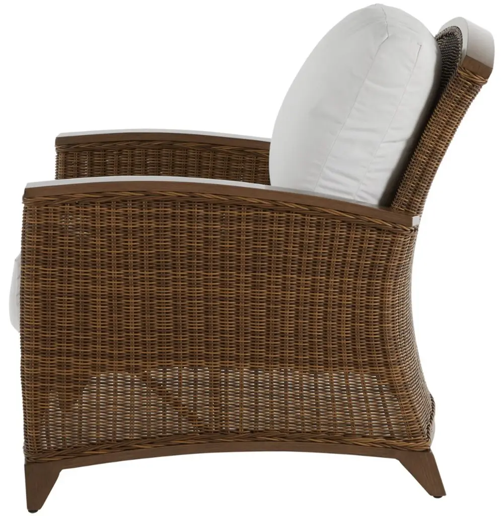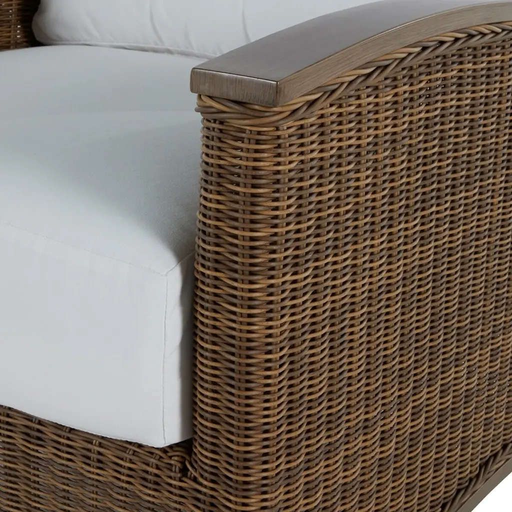 The Astoria Woven Lounge Chair features ultra-UV resistant resin wicker handwoven over a durable aluminum frame. Its powder-coated finish enhances weather resistance and aesthetic appeal. The design offers comfort with high back support and armrests, complemented by a plush cushion. Perfect for outdoor settings, it combines timeless elegance with modern durability.