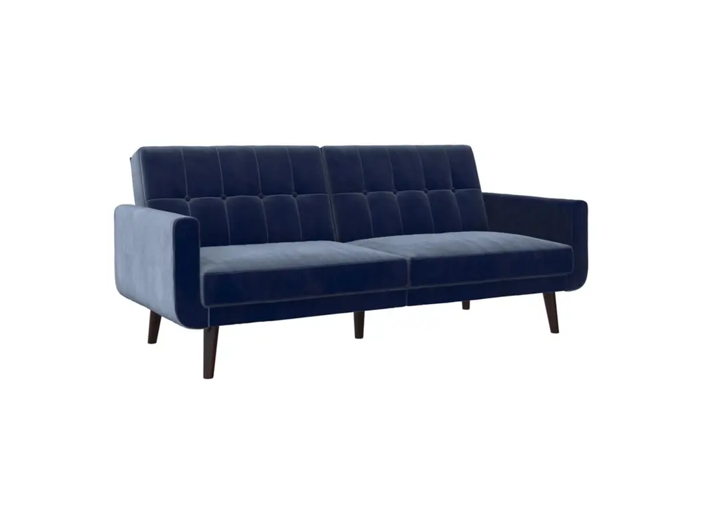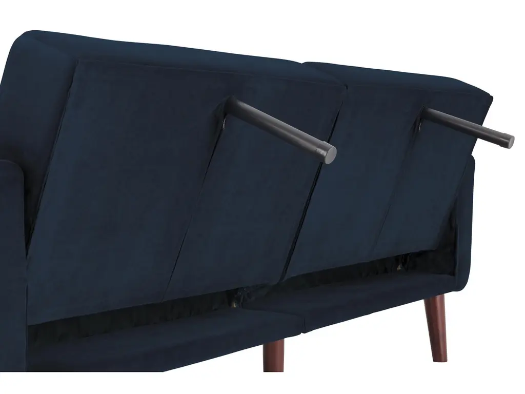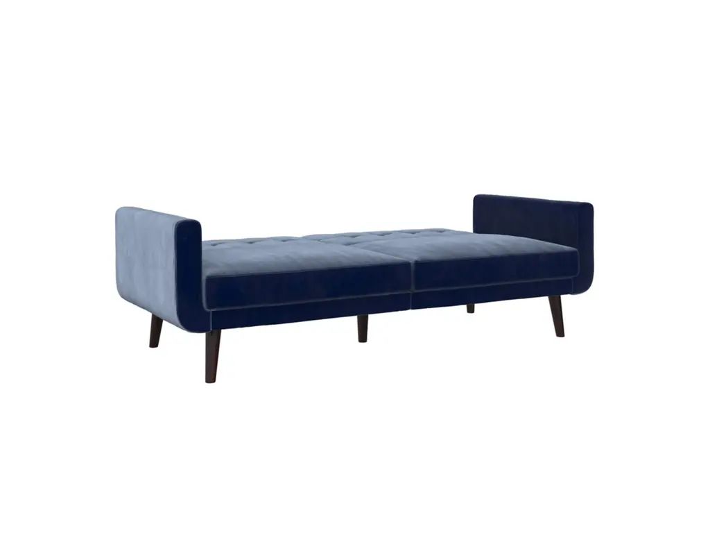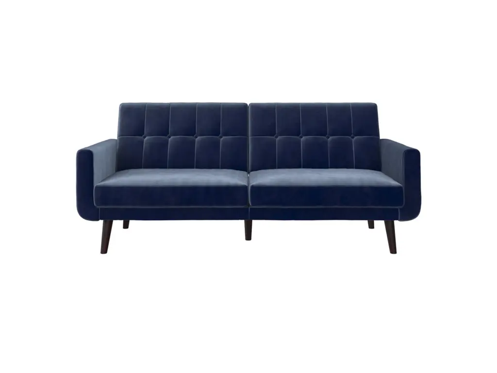 Go back in time with the stylish Atwater Living Nova Modern Futon. This mid-century-styled sofa bed is a modern twist on a classic look, boasting bold lines, tapered wood legs and an irresistible velvet upholstery available in your choice of blue or grey. Set it in your living room as an eye-catching centerpiece, or add it as a pop of exciting style and color in your home office. This functional futon can be used in a lounging position, which is perfect for reading or watching your favourite movie, or it can be reclined all the way back for a sleep area that can accommodate up to two guests. The Nova Modern Velvet Futon is a fashionable way to add some extra sleeping space to your home! Want to extend this stunning look? Pair this modern futon with the matching Nova chair to create a special space you'll want to spend your time in. Can support up to 600 lbs. in maximum weight and ships in one box. Little assembly required to make this furniture setup easy and fast. The Nova Futon is guaranteed to bring plenty of interest to your space with its unique design!