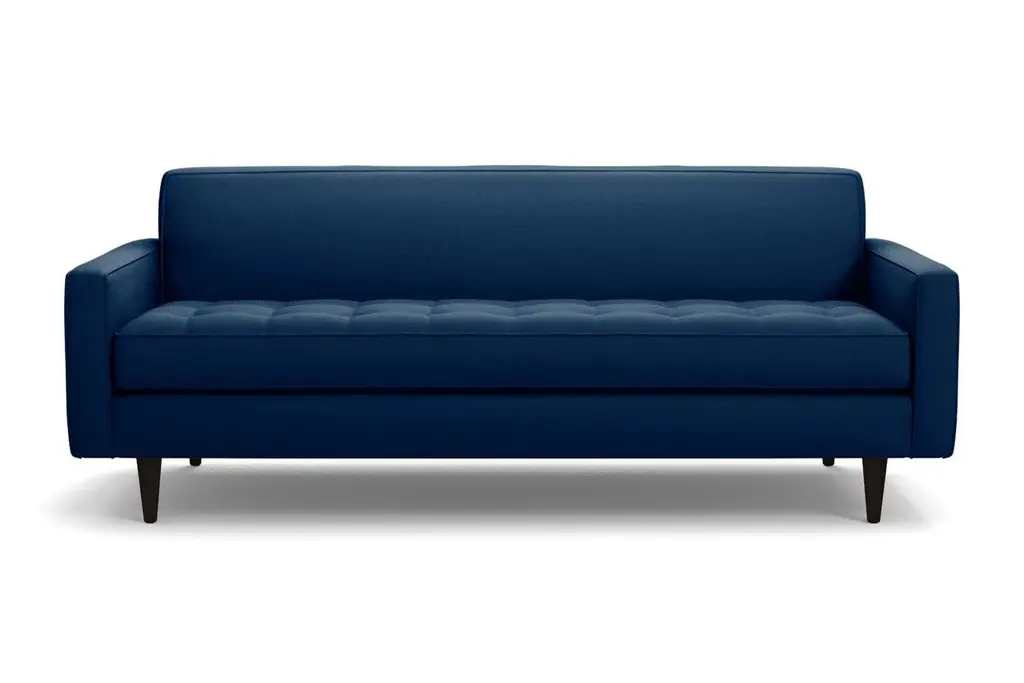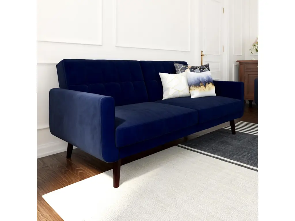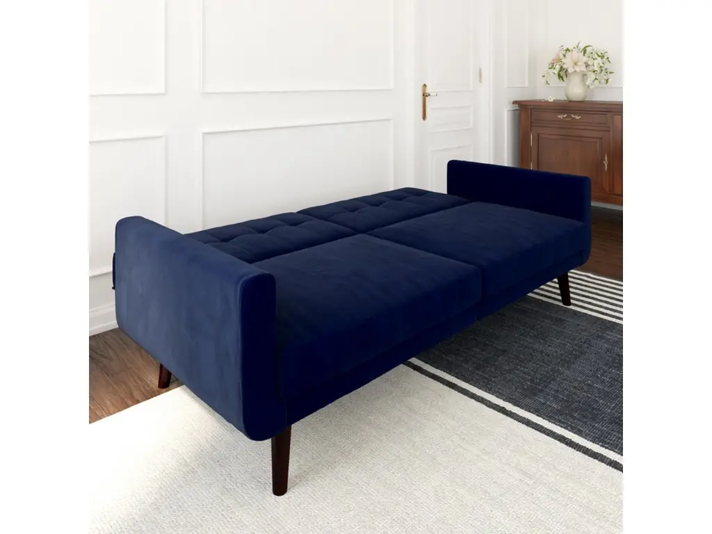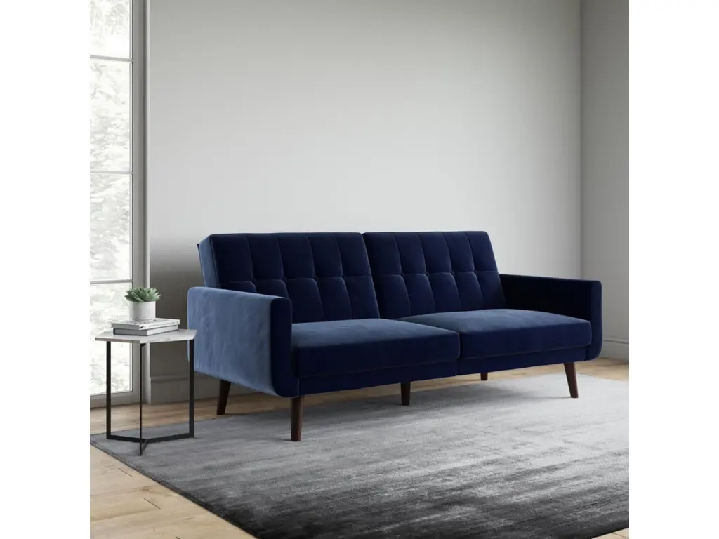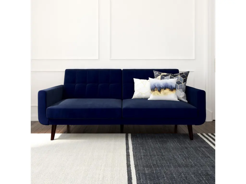 Go back in time with the stylish Atwater Living Nova Modern Futon. This mid-century-styled sofa bed is a modern twist on a classic look, boasting bold lines, tapered wood legs and an irresistible velvet upholstery available in your choice of blue or grey. Set it in your living room as an eye-catching centerpiece, or add it as a pop of exciting style and color in your home office. This functional futon can be used in a lounging position, which is perfect for reading or watching your favourite movie, or it can be reclined all the way back for a sleep area that can accommodate up to two guests. The Nova Modern Velvet Futon is a fashionable way to add some extra sleeping space to your home! Want to extend this stunning look? Pair this modern futon with the matching Nova chair to create a special space you'll want to spend your time in. Can support up to 600 lbs. in maximum weight and ships in one box. Little assembly required to make this furniture setup easy and fast. The Nova Futon is guaranteed to bring plenty of interest to your space with its unique design!
