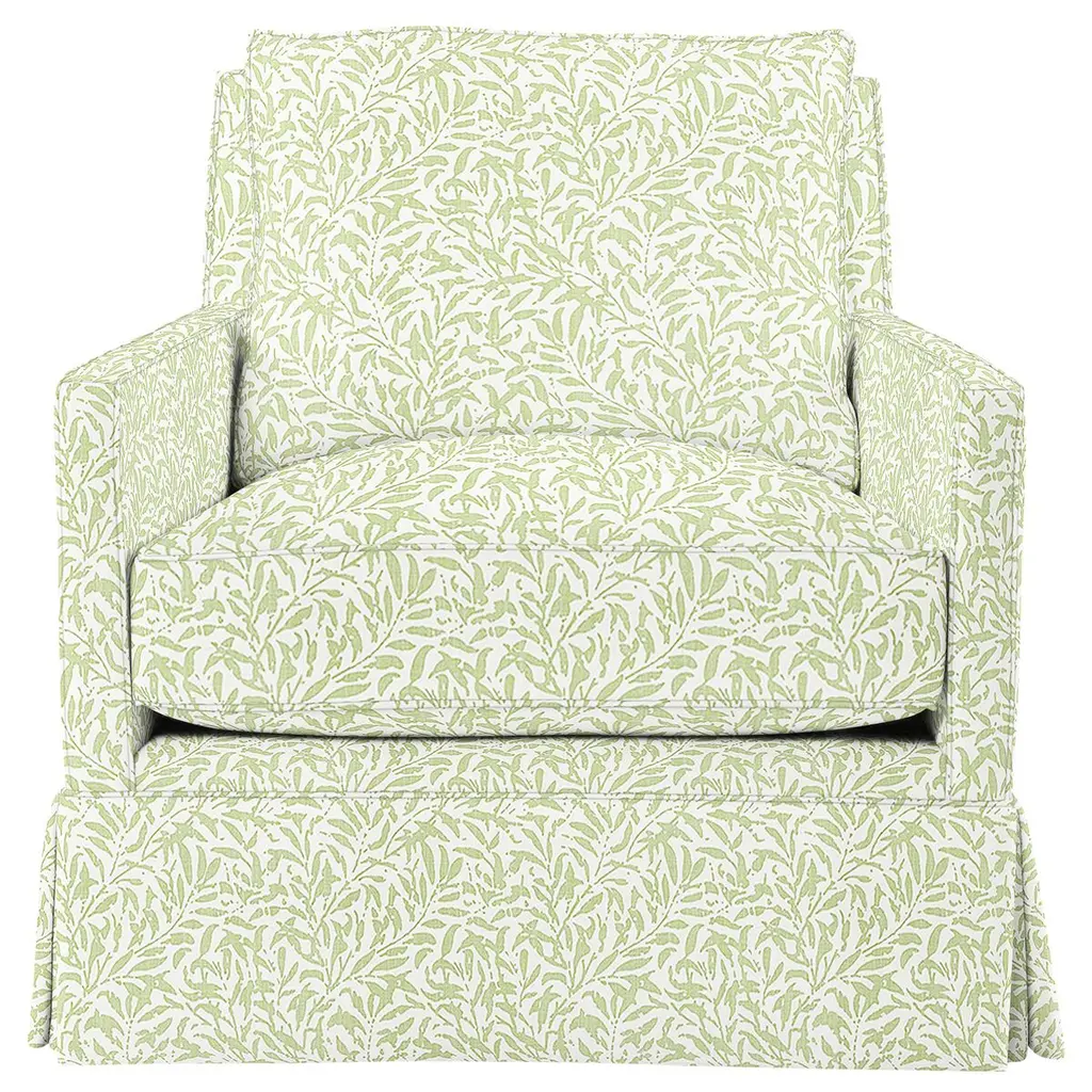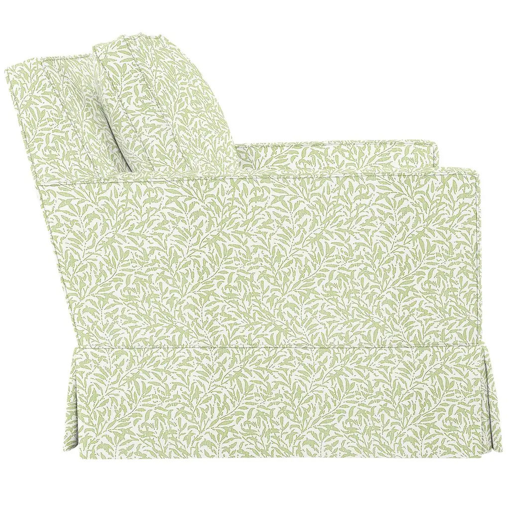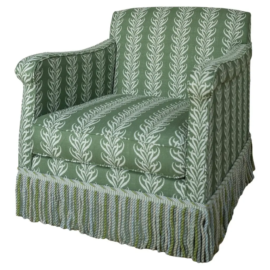 Exclusive to One Kings Lane: This cozy club chair brings a clean, tailored feel to the room with its classic dressmaker skirt. The upholstery fabric made of cotton features a botanical pattern in a neutral color palette. Constructed of an engineered hardwood-laminate frame, eight-way hand-tied suspension system, and a spring foam cushion with down-proof ticking ensure long-lasting comfort and support. Each piece is handcrafted by skilled artisans in High Point, NC and offers a lifetime warranty on the frame and suspension system and a limited lifetime warranty on the seat cushion.