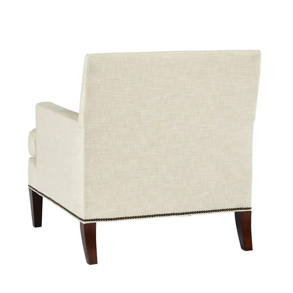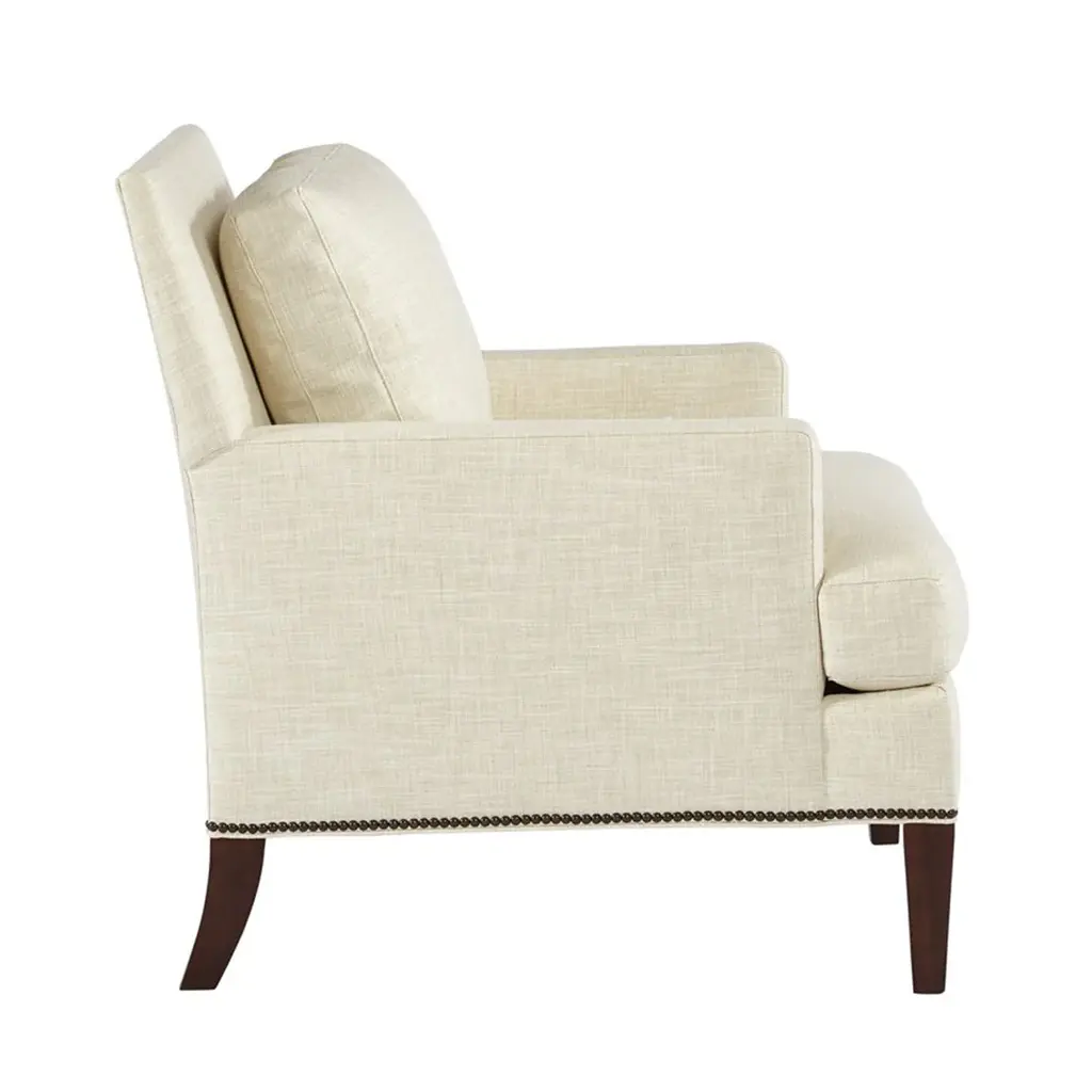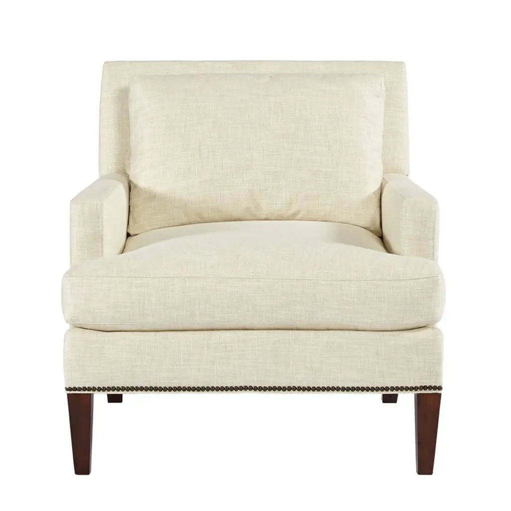 This elegant Audrey Chair features a comfortable boxy shape with wood tapered legs for a touch of sophistication. The nail trim detailing adds a classic touch, making it a perfect addition to any living room or study. The Audrey Chair is available in various finishes and fabrics to suit your personal style and home decor. Elevate your space with this timeless piece that seamlessly blends comfort and style. The Audrey collection also includes a sofa and a loveseat (sold separately). Ships In 8-10 Weeks One loose back pillow One seat cushion As Shown Fabric: Crystal Natural As Shown Finish: Antique Walnut If you choose to purchase COM, once you have placed your order a customer service rep will contact you regarding where to send your fabric. Please note that current lead time is 17-19 weeks once your fabric arrives at the factory, and if unused fabric is under 1.5 yards, it cannot be sent back to you.This product can be special ordered in additional fabrics, leathers, finishes, and cushion fillings. Click here to email us for for additional information about special ordering.This image is for illustrative purposes only. The colors shown are accurate within the constraints of lighting, photography, and the color accuracy of your screen.