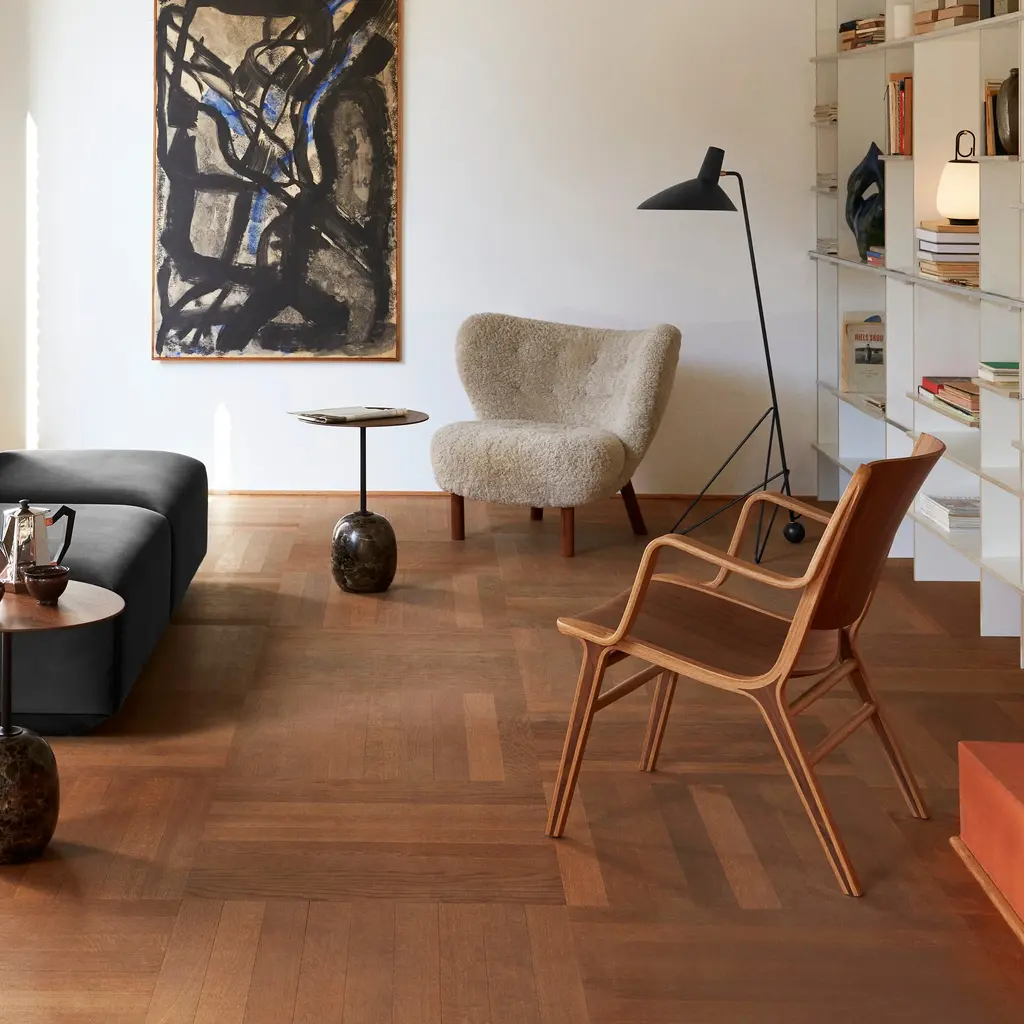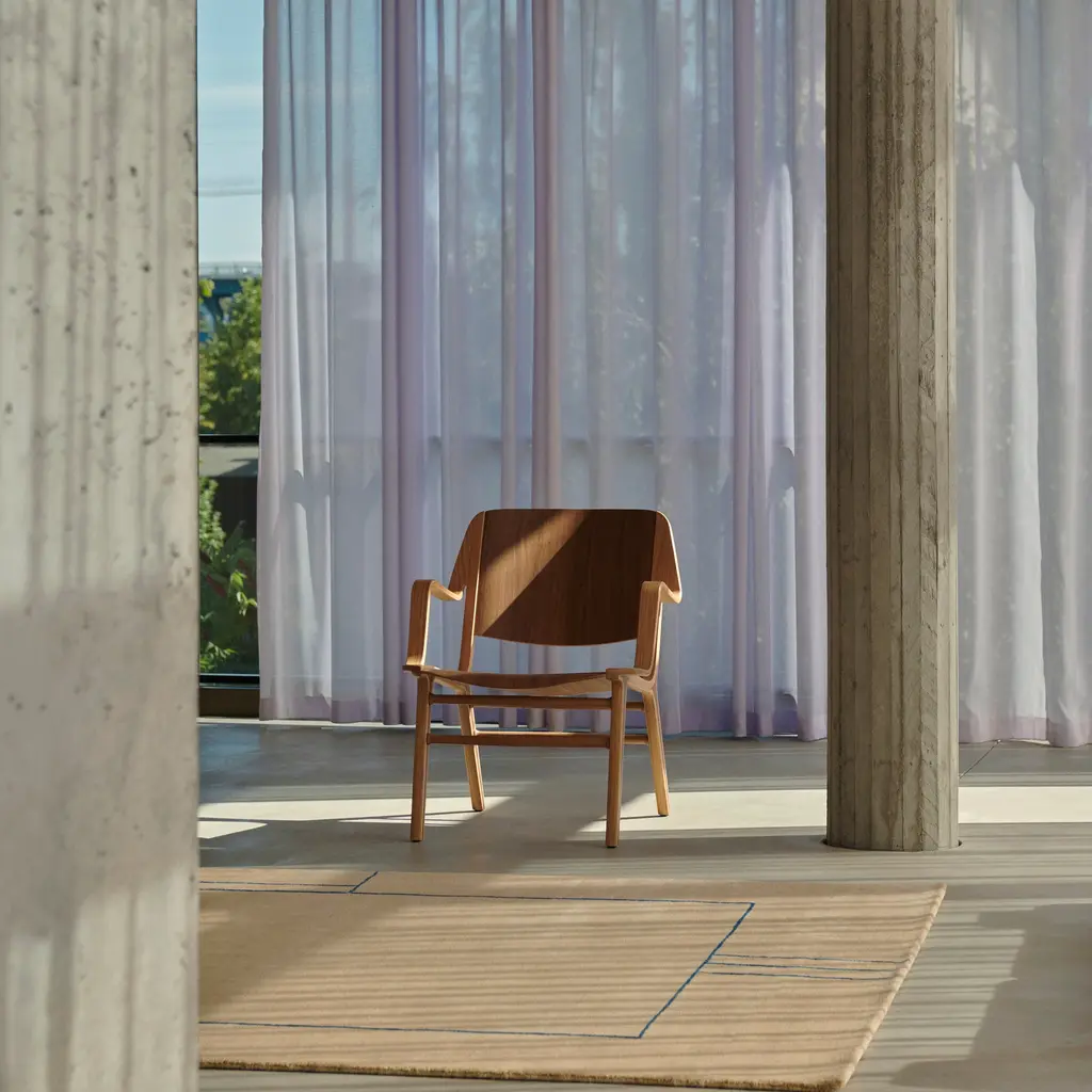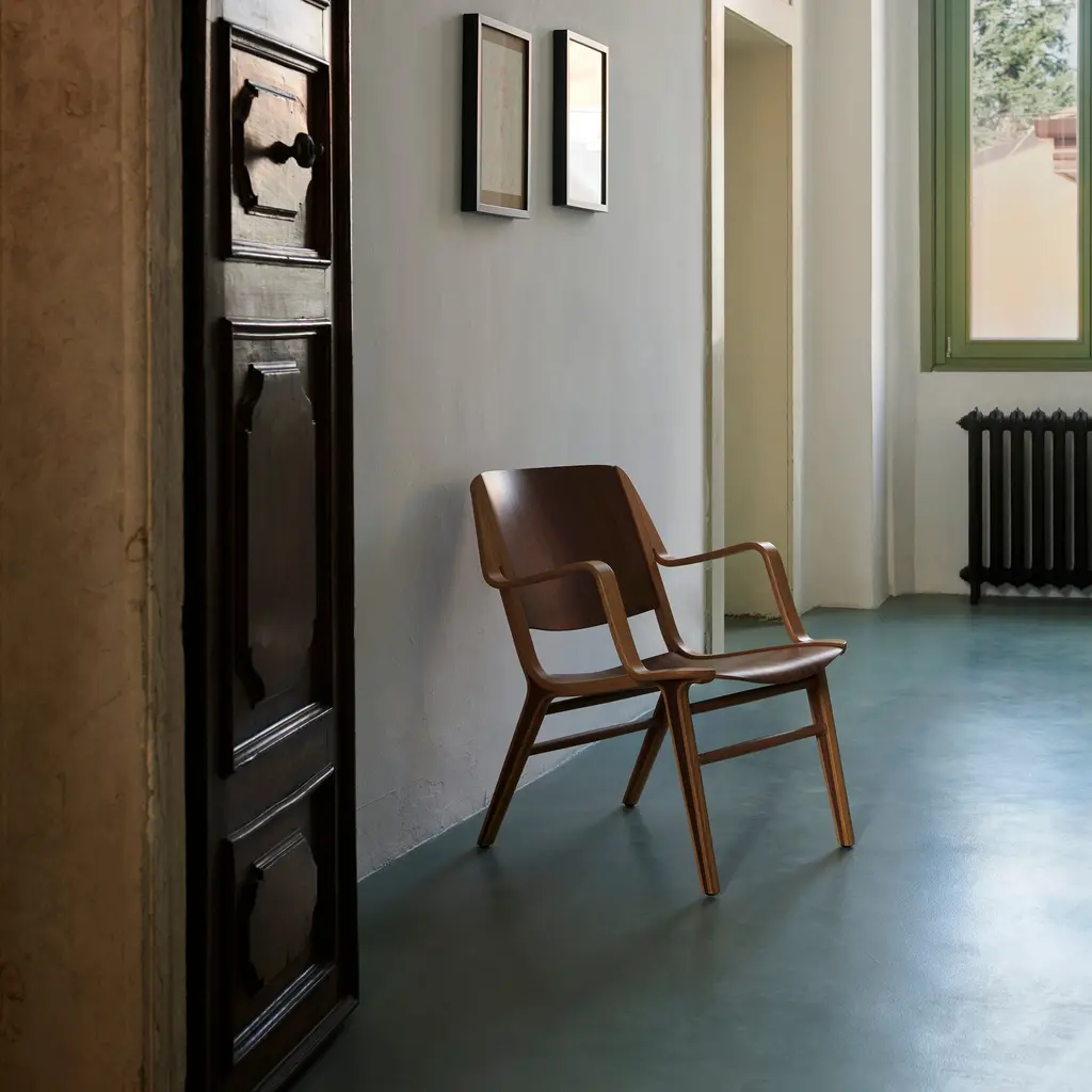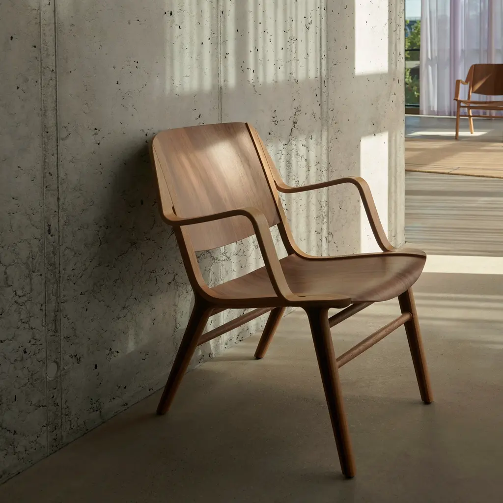 A prime example of mid-century Danish design, created by the renowned duo Hvidt & Mølgaard, this chair is celebrated for its pioneering use of 3D-shaped plywood, showcasing a continuous curve that enhances both its aesthetic appeal and ergonomic comfort. The armrests and frame seamlessly mirror each other, a testament to the designers' training in Danish cabinetry. Available in various finishes including lacquered oak and walnut.
