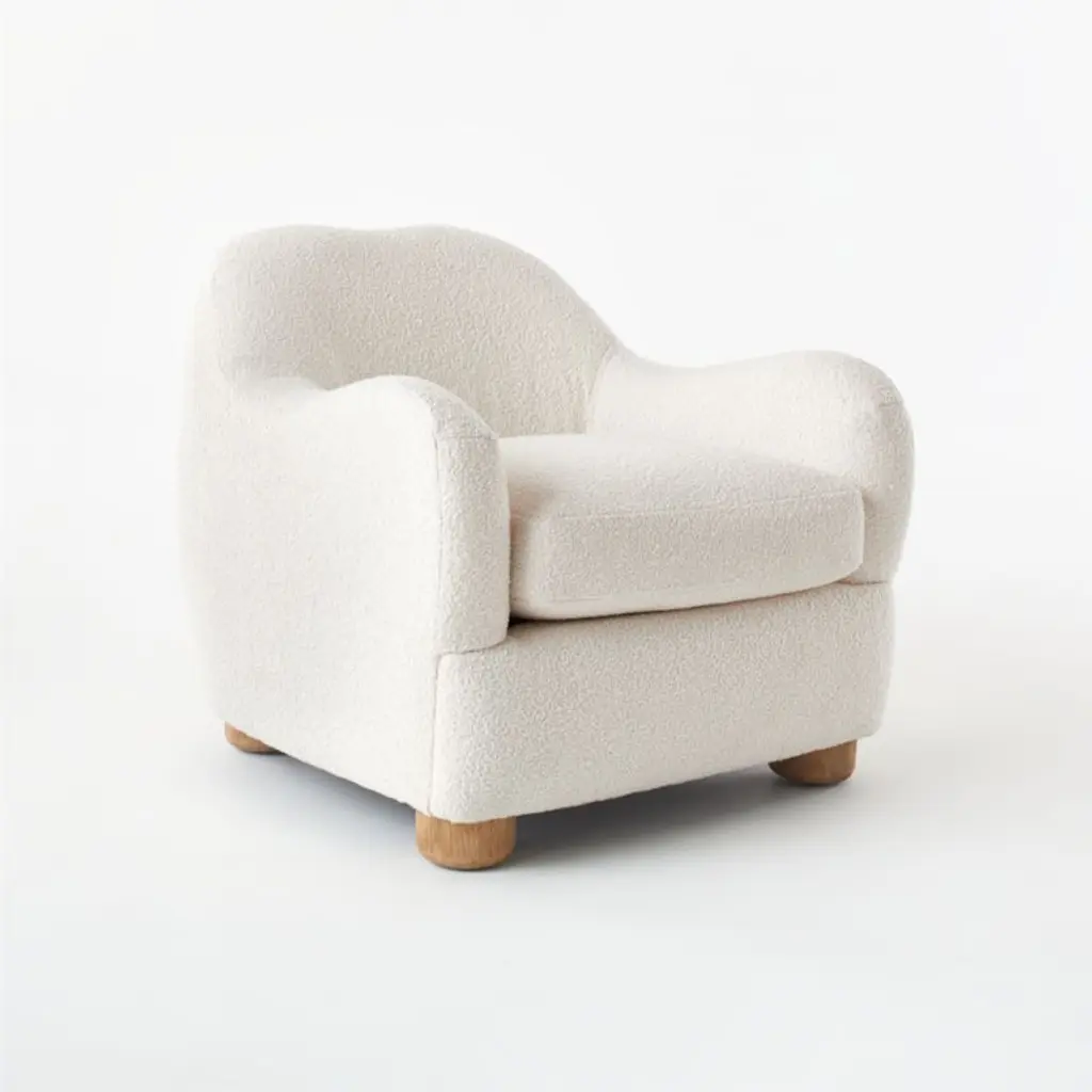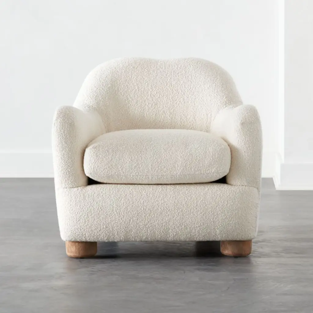 Boucle takes on cream-colored hues in loungeable chair designed by Ross Cassidy. Bubbly and oversized in shape, with an FSC -certified wood frame and rounded legs made of solid bleached oak. CB2 exclusive.