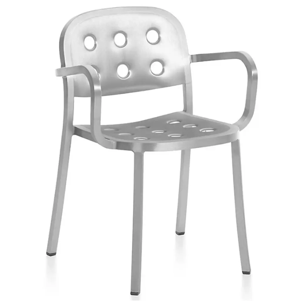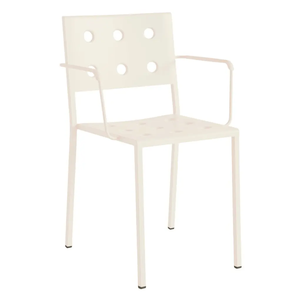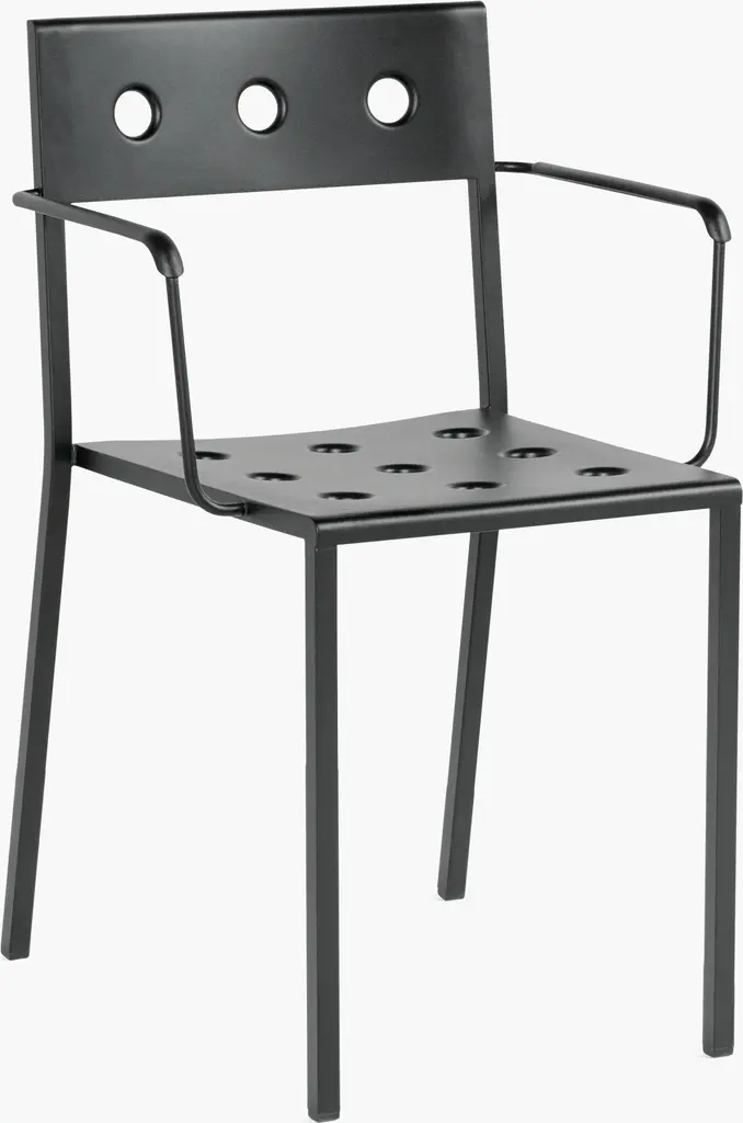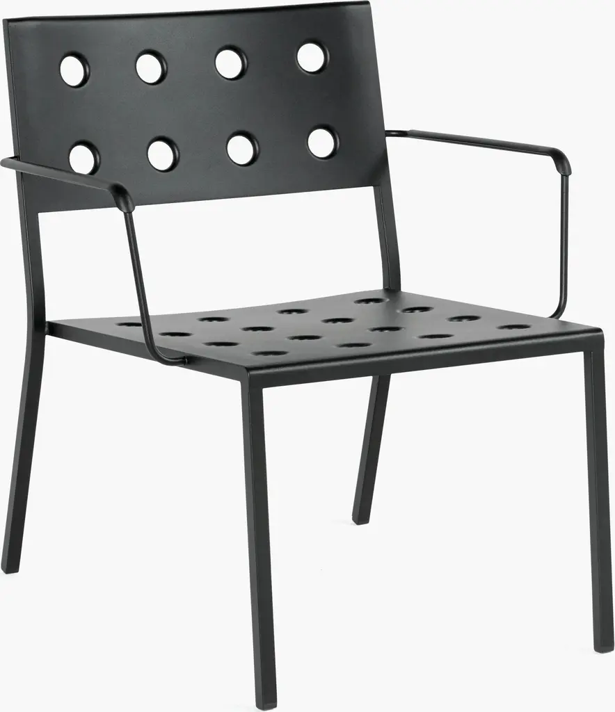 Balcony outdoor seating and tables are designed for HAY by Ronan and Erwan Bouroullec. Made of durable steel, the square design is softened by circular cutouts, which serve the functional purpose of strengthening the shell. The holes also provide airflow to help keep you comfortable on hot days, and allow for drainage so that the chair can dry quickly after it rains. Each piece is powder-coated with an outdoor primer for optimal resilience and durability. Made in China.