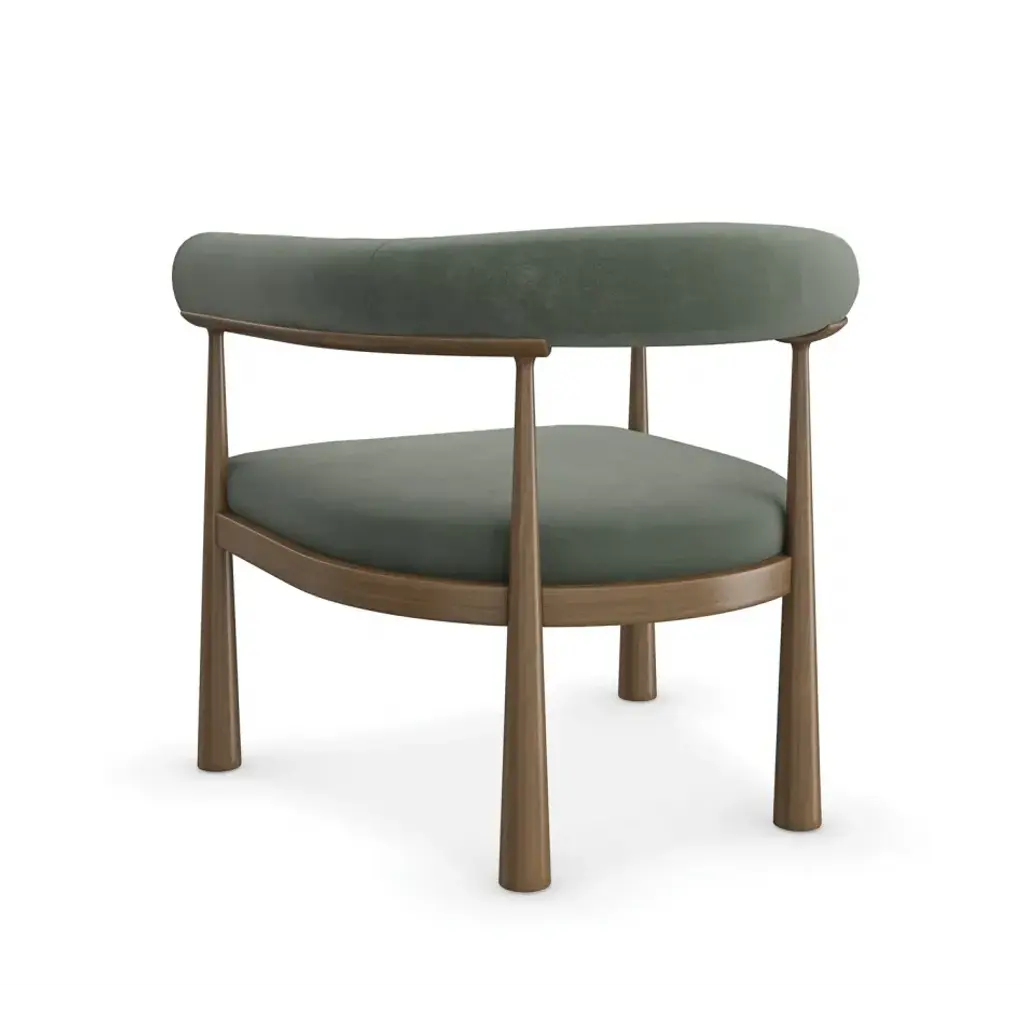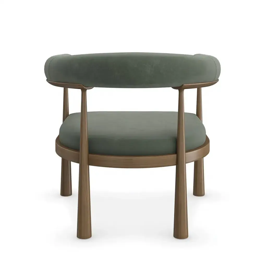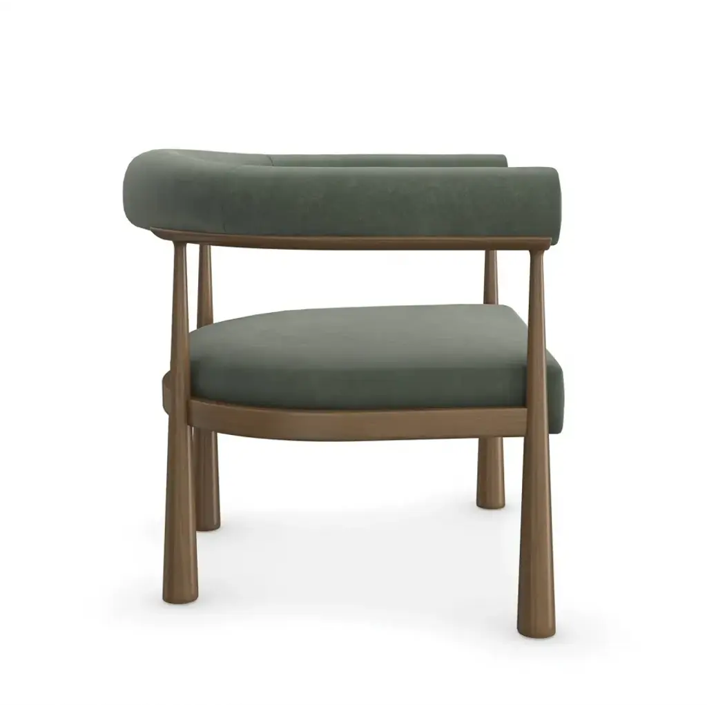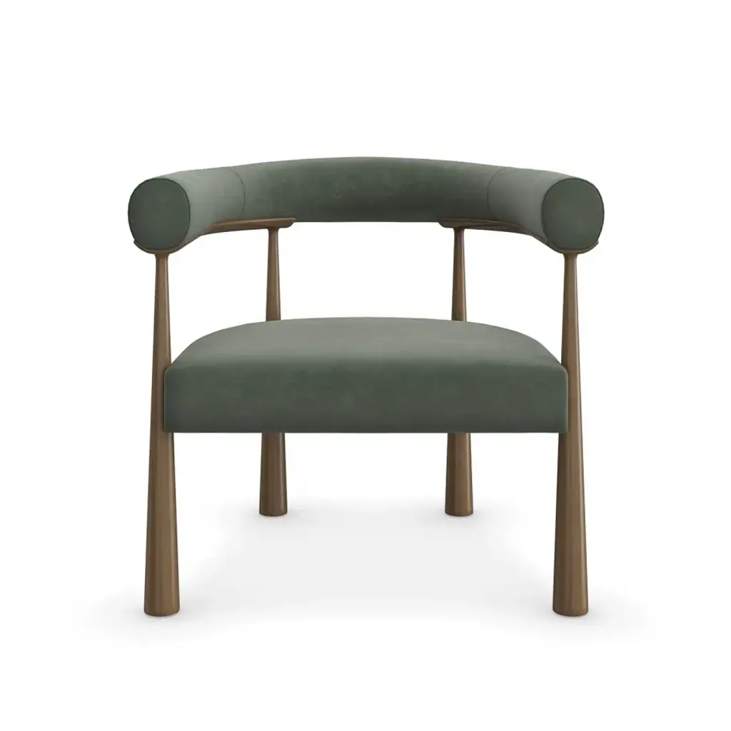 A standout in any space, this curved club chair features a rounded bolster back and arms for lounging comfortably. Its exposed wood frame and tapered legs lend a mid century modern detail, warmly complemented by a sage green mohair-velvet. Style in pairs to create a chic conversation area in the living room or bedroom.