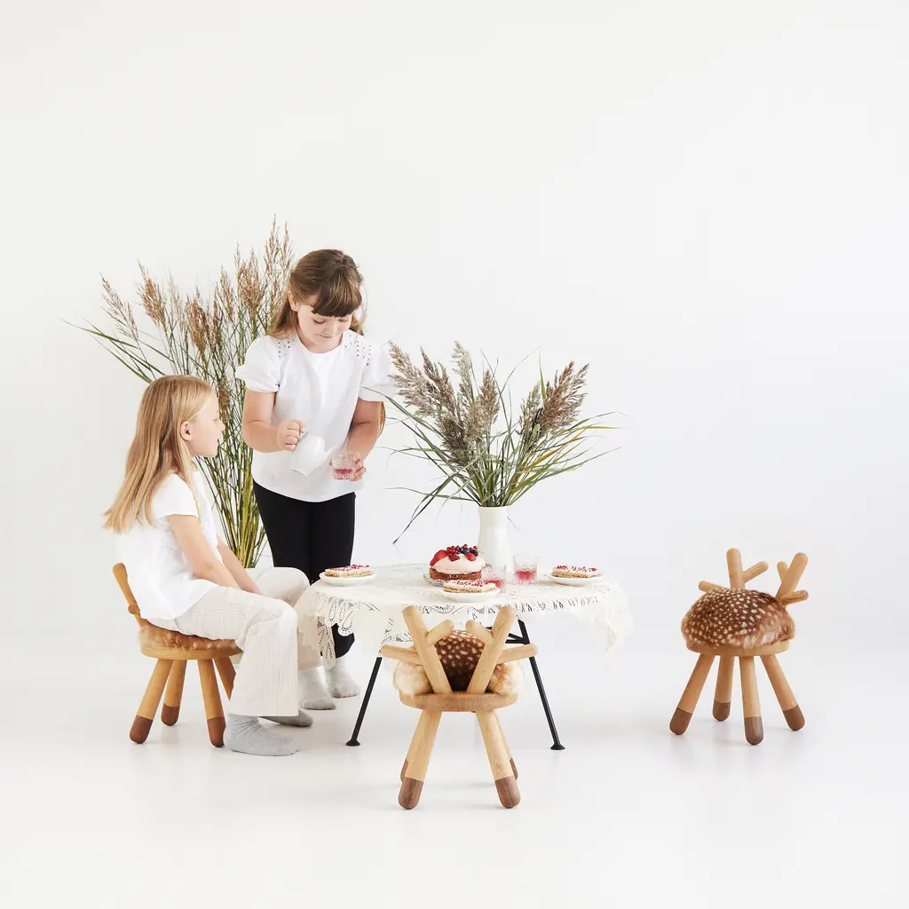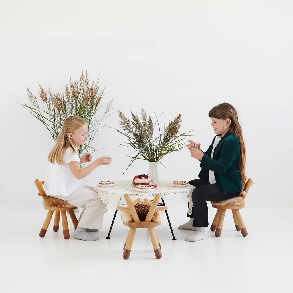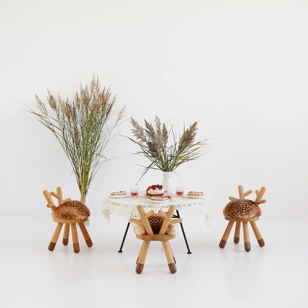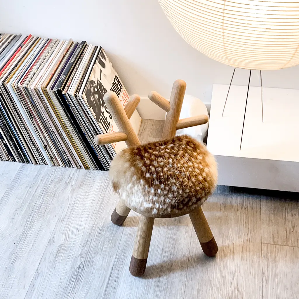 Designed by Japanese artist Takeshi Sawada for Danish brand EO, the Bambi Chair brings warmth and imagination to children’s spaces. Made from solid European oak and American walnut, it features a faux-fur seat patterned like a young deer and a curved backrest shaped like antlers. The Bambi Chair is sized for little ones but designed with care and character. It’s sturdy, sculptural, and quietly charming—equally fitting by a low table or as a standalone accent in a thoughtfully designed room.