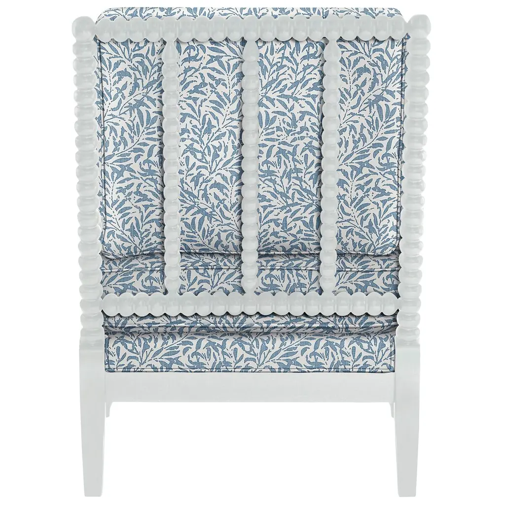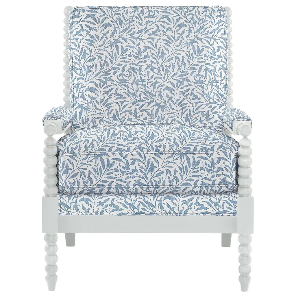 Exclusive to One Kings Lane: This classic accent chair features spindles throughout the design with upholstered top arm panels. It is upholstered in a botanical print featuring a soft blue color palette. Constructed of solid hard wood, Pirell Webbed suspension system, and a spring foam cushion wrapped in polyester fibers with down-proof ticking ensure long-lasting comfort and support. Each piece is handcrafted by skilled artisans in High Point, NC and offers a lifetime warranty on the frame and suspension system and a limited lifetime warranty on the seat cushion.