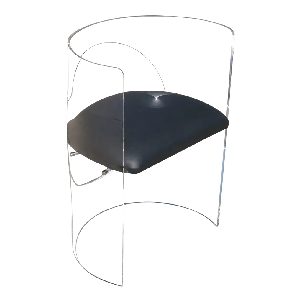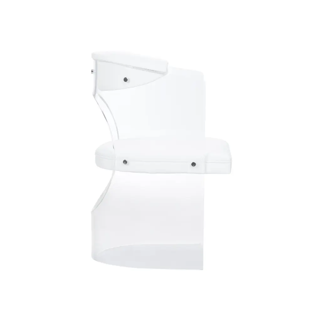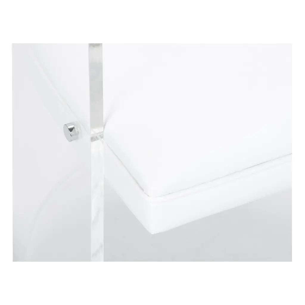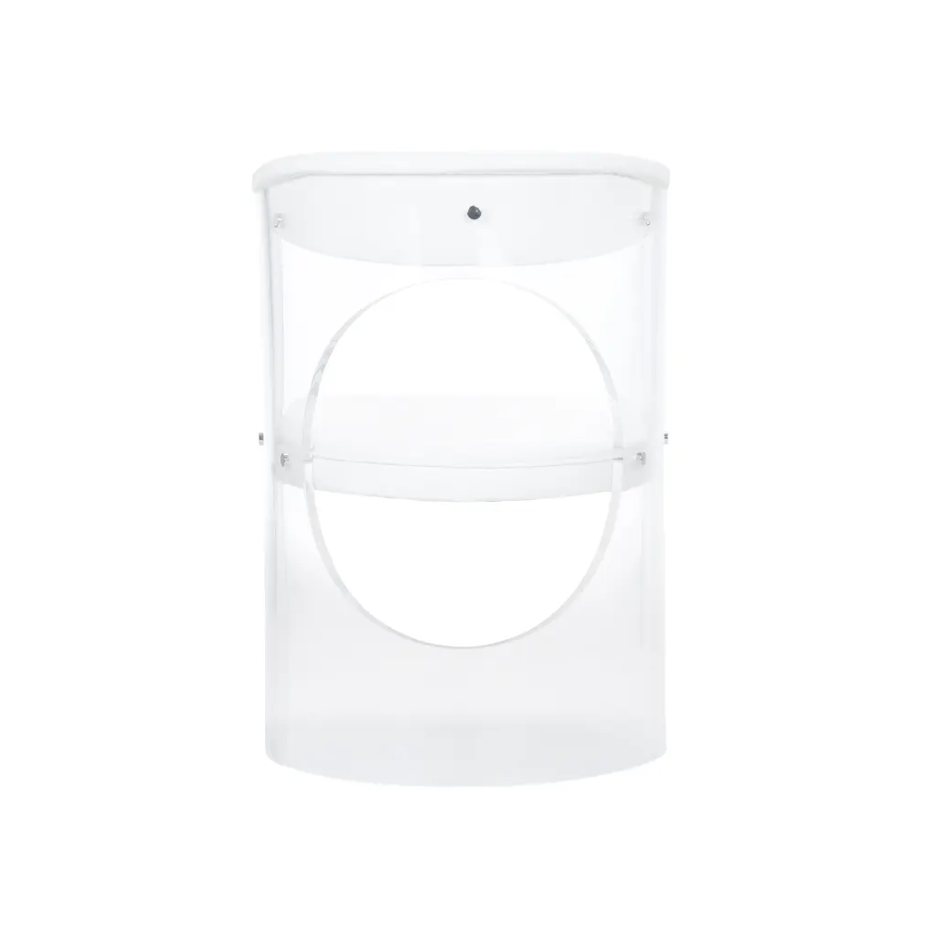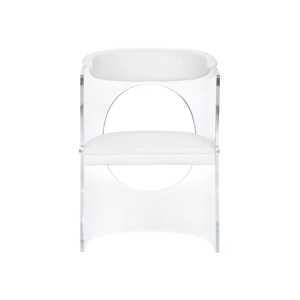 Make a bold statement in your contemporary home or office with baran barrell back acrylic chair. This chic accent chair features a clear acyrlic frame with a curved shape and circle cutout. The soft, white faux leather adds comfort to the design and blends with any existing decor.