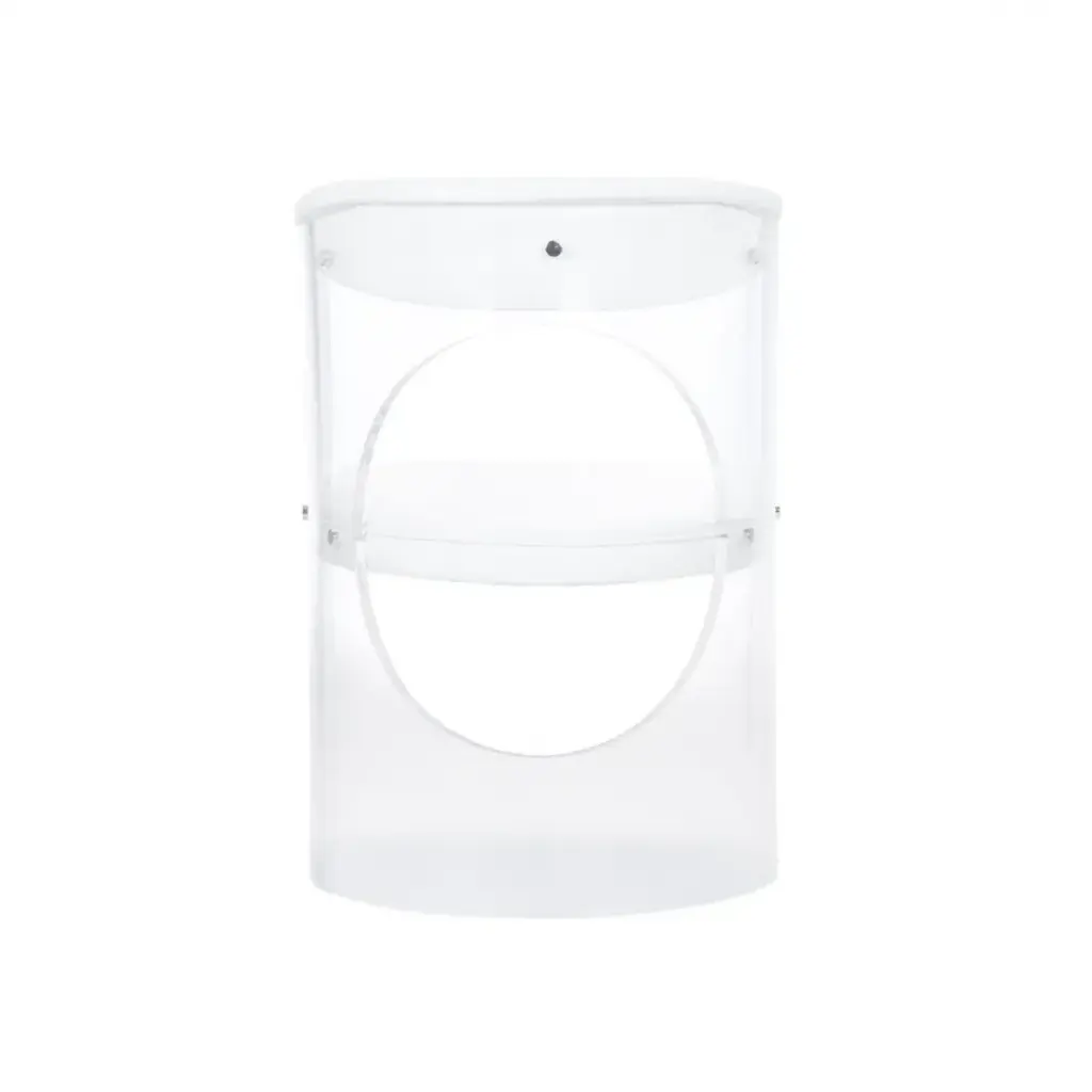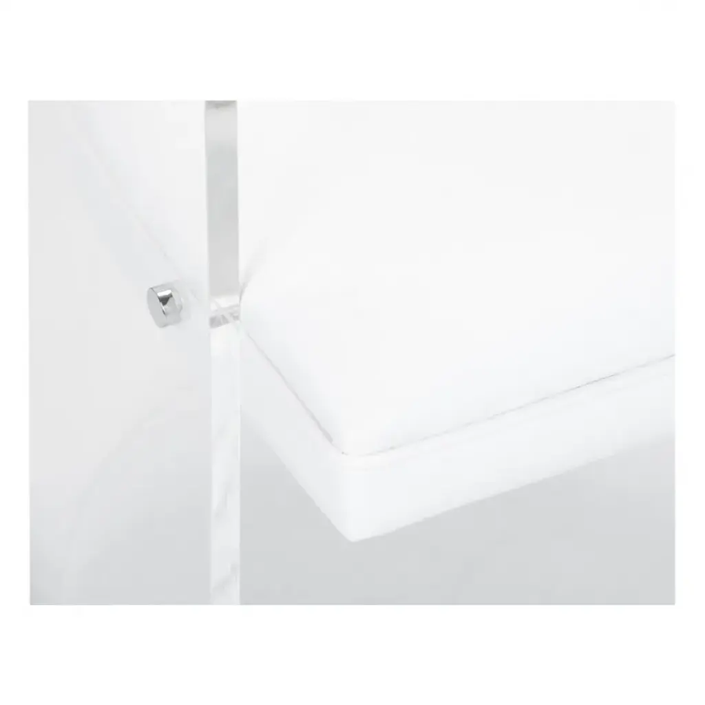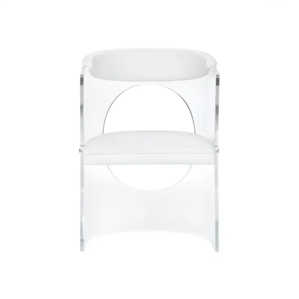 MAKE A BOLD STATEMENT IN YOUR CONTEMPORARY HOME OR OFFICE WITH BARAN BARRELL BACK ACRYLIC CHAIR. THIS CHIC ACCENT CHAIR FEATURES A CLEAR ACYRLIC FRAME WITH A CURVED SHAPE AND CIRCLE CUTOUT. THE SOFT, WHITE FAUX LEATHER ADDS COMFORT TO THE DESIGN AND BLENDS WITH ANY EXISTING DECOR.