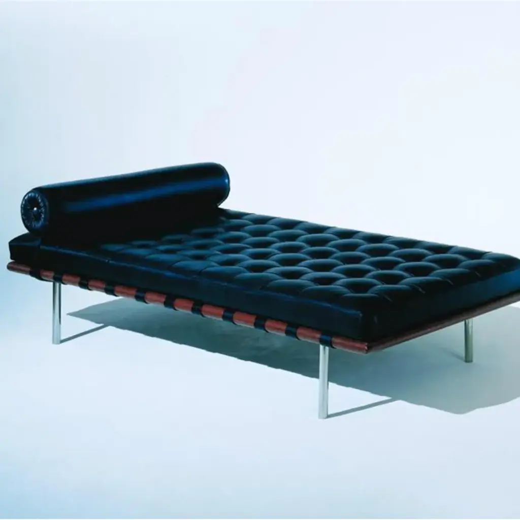 Designed in 1930, the Barcelona Day Bed shares the same simple elegance as the iconic lounge chair of the same name. Mies van der Rohe's command of line and material in all medium, from architecture to furniture, helped define the modern vocabulary.FEATURESA signature KnollStudio design, produced to Mies' original specifications.Exclusive manufacturing and sales rights were accorded to Knoll by the designer in 1953.The KnollStudio logo and the signature of Mies van der Rohe are stamped into the base of each day bed.CONSTRUCTIONHardwood frame with protective, clear lacquer finish.The legs are constructed of tubular steel with polished stainless steel finish.72 individual leather panels are cut, hand-welted and hand-tufted, and panels and buttons are crafted from a single hide.FINISHESAvailable in a wide range of Spinneybeck leathers. This product is available with foam that meets requirements for BS5852.AWARDSMuseum of Modern Art Award, 1977.