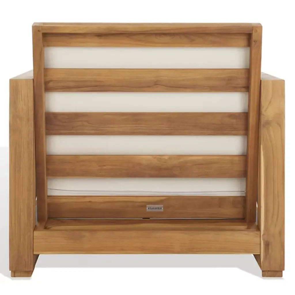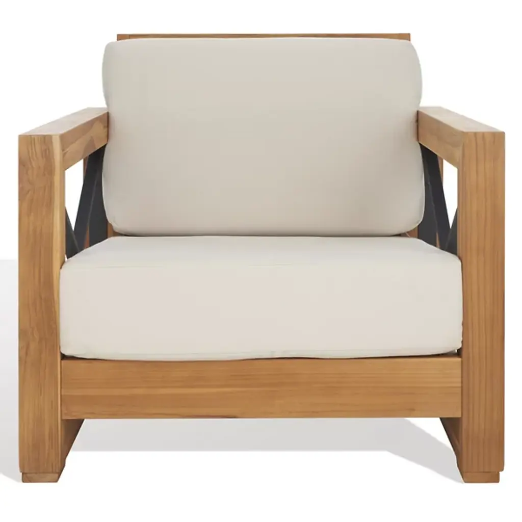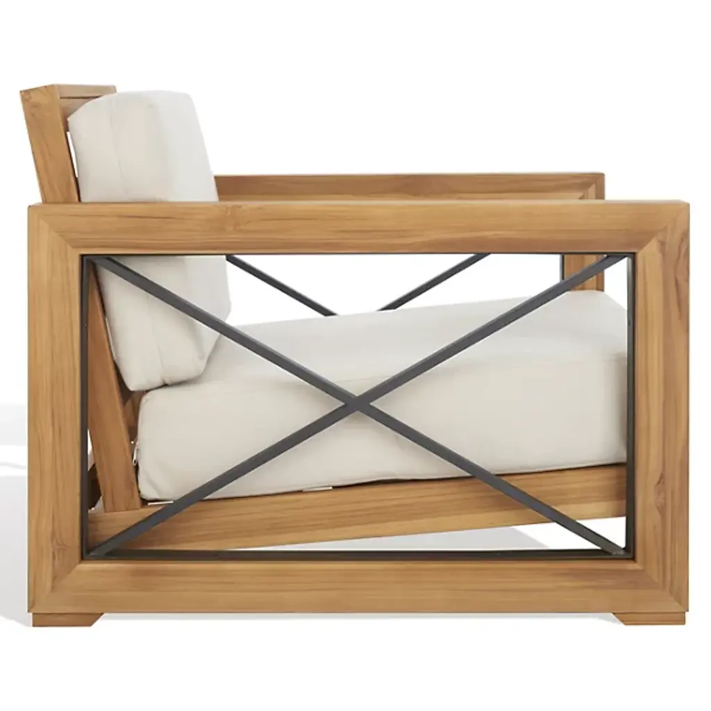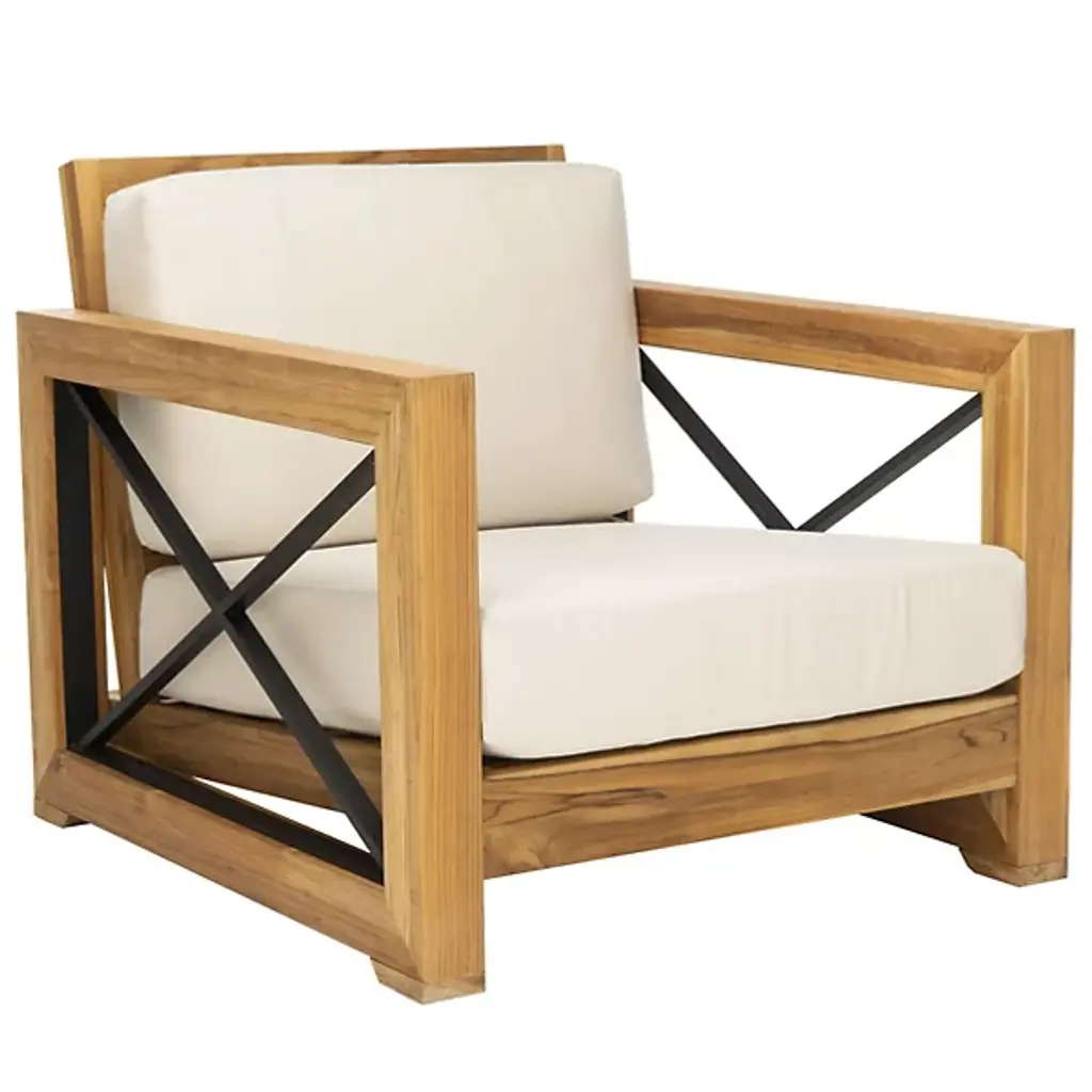 The Bardia Outdoor Brazilian Club Lounge Chair from Alder & Ore brings structural innovation to outdoor seating. Metal cross-bracing adds strength and distinctive style to the substantial teak frame. The deep-set design encourages various seating positions, from proper posture to casual lounging. Weather-resistant cushions filled with multiple foam layers ensure lasting comfort. The exposed framework creates engaging sight lines while promoting airflow. Strategic metal reinforcements guarantee stability without compromising the chair's refined appearance. This lounge piece proves outdoor furniture can excel in both performance and design.
