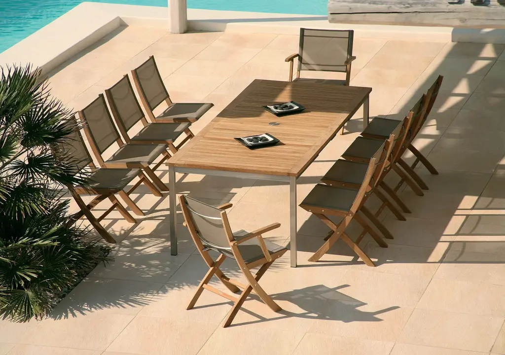 The Horizon is a stylish, well proportioned, contemporary designed folding side chair with maximum comfort. Features a sling seat and backrest using a teak frame. Fittings are made with .316 marine grade stainless steel throughout. Simple and clean are the characteristics of the Horizon Collection. The pieces in this collection are so versatile that they can be mixed with pieces from other collections. Casual and elegant, the Horizon Collection will impress you with its style and simple features.Please Note: Fabrics, canopies, cushions, covers, special order sling colors, and special order finishes are considered customized and may have longer lead times. These items cannot be cancelled, returned, or exchanged.