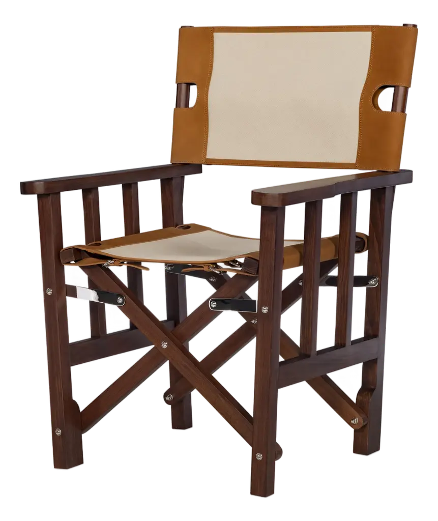 This design is a luxe evolution of a classic director chair, standing out for its nautical references - as the ropes enveloping the armrests - and fine tailored details as the leather accenting the legs' tips. Ideal to complement boats or pool areas, it features a water-repellent, beige fabric for the seat and backrest. It is offered in other color options, please contact the Concierge.