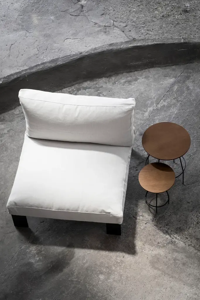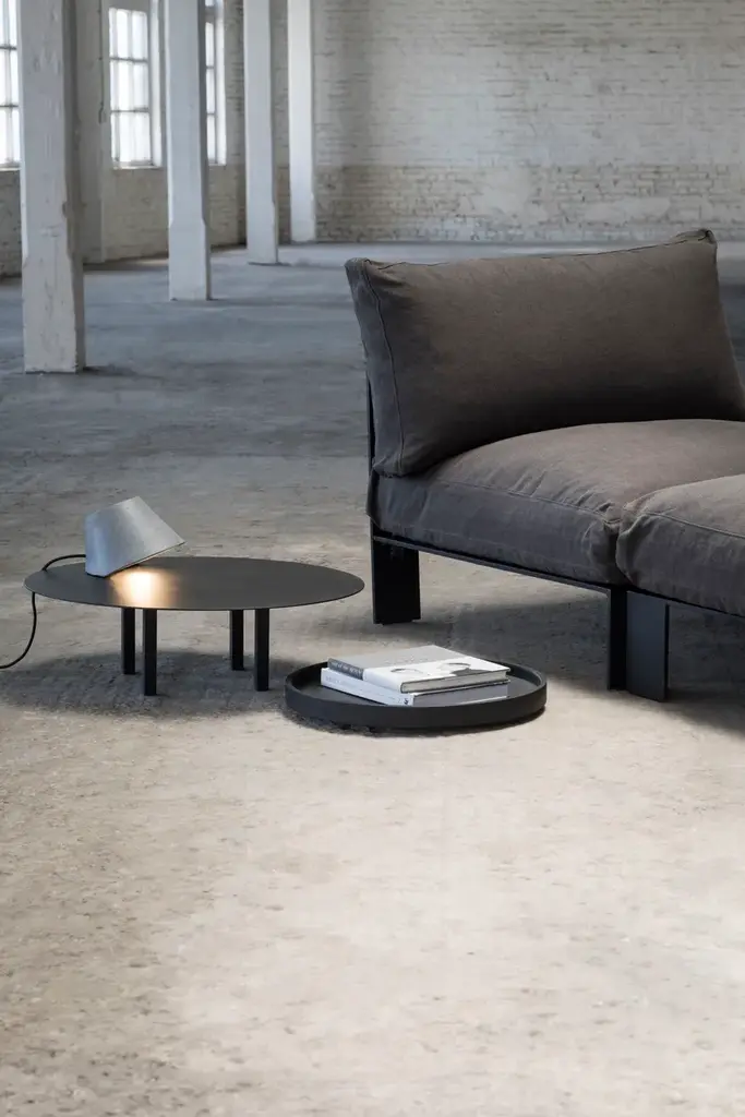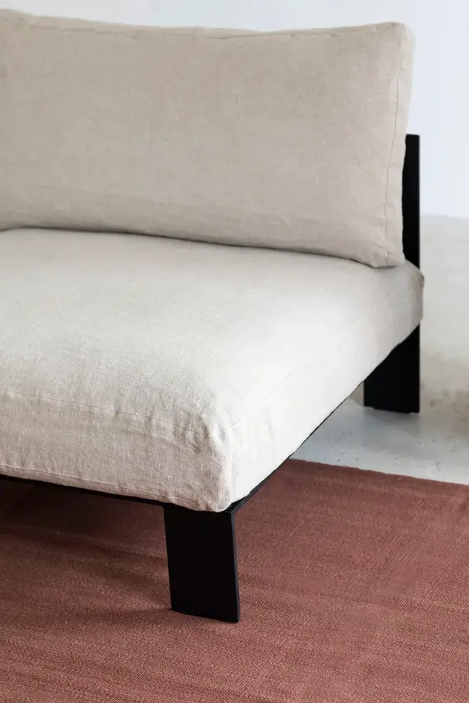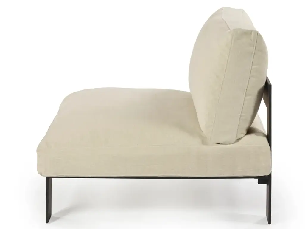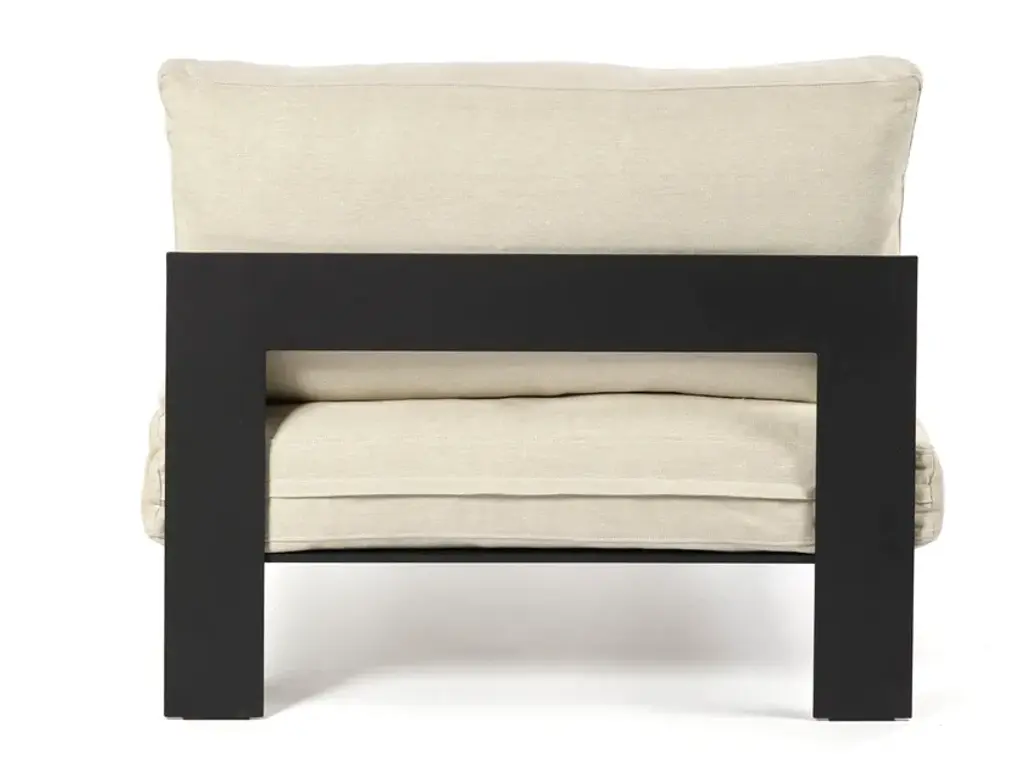 Bench 1-seater is an armchair upholstered in fabric and with a black painted steel structure.The upholstery fabrics for the indoor/outdoor sofas and cushions of the Bea Mombaers collection are produced by a Belgian weaving mill with a long-standing history. The mill has been weaving quality fabrics for prominent national and international customers for five generations already.The Bea Mombaers for Serax sofa collection consists of a one-seater, a two-seater, a three-seater and an ottoman in the same size as the one-seater. All models are produced in black aluminum for better maneuverability and equipped with soft cushions in an indoor and outdoor version. By combining and configuring the different elements, you can create your own seating island without any restrictions.Bea Mombaers: "The idea to launch a line of lounge sofas grew very organically. I was looking for an utterly sober sofa with an invisible framework for the B&B. It had to look like a floating seat element with only cushions, in which the frame would completely disappear. Eventually, I ended up ordering a customised prototype for my size. The result was a low one-seater of 90 by 90 centimetres with a heavy metal frame and extra thick cushions in a weather-resistant material. I love taking indoor life outdoors and vice versa. The Bea Mombaers for Serax sofa collection includes a two-seater, a three-seater and a footstool in the same size as the one-seater. All models are produced in black aluminium for better manoeuvrability and equipped with soft, light fawn-coloured cushions for indoor and outdoor. By combining and configuring the various elements, you can create your own seating isle without restrictions."