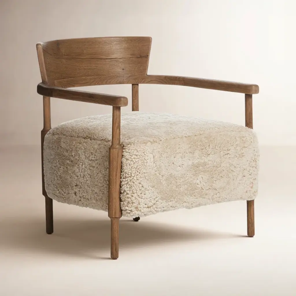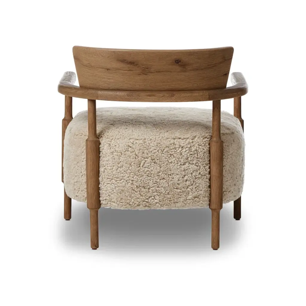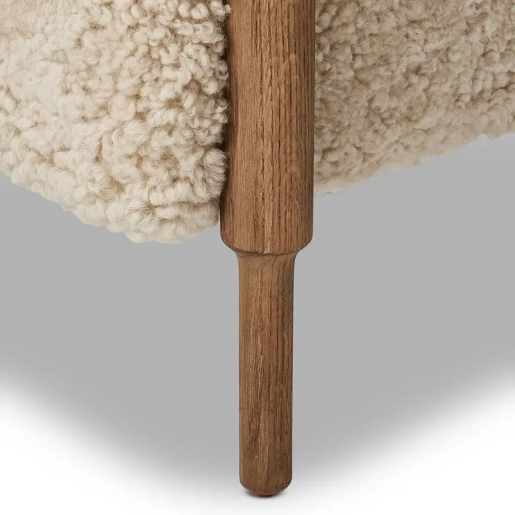 A design collaboration by Amber Lewis and Four Hands. A new classic is created by blending the look and charm of traditional woodworking with thick cushion seating. The frame of the chair is crafted from solid oak and features gently turned dowel legs, plus arm rails that wrap around the back in a perfect U shape. Covered in 100% natural shearling.