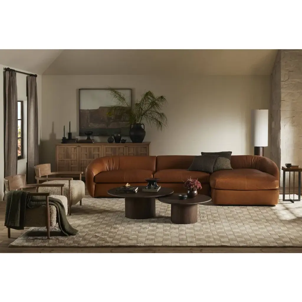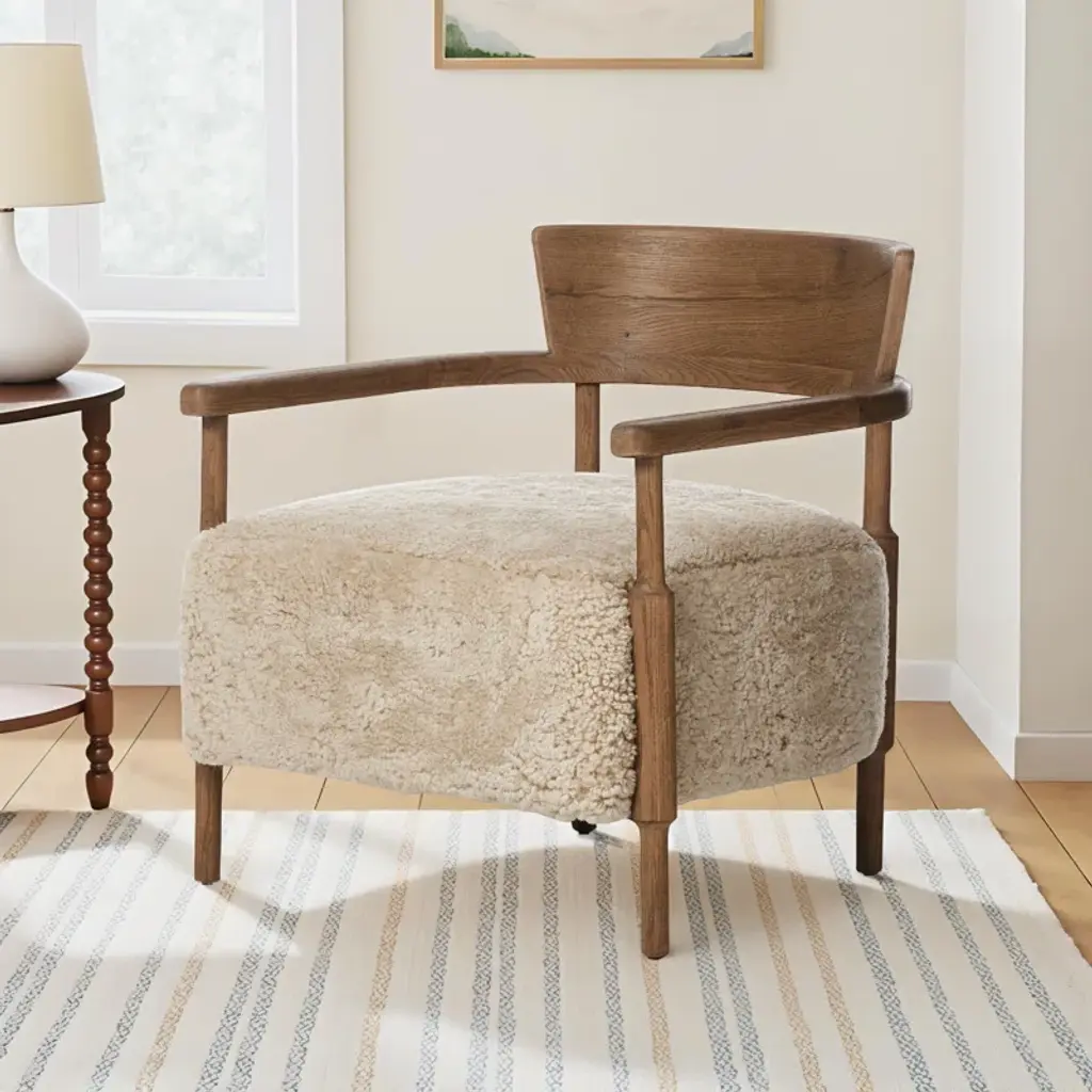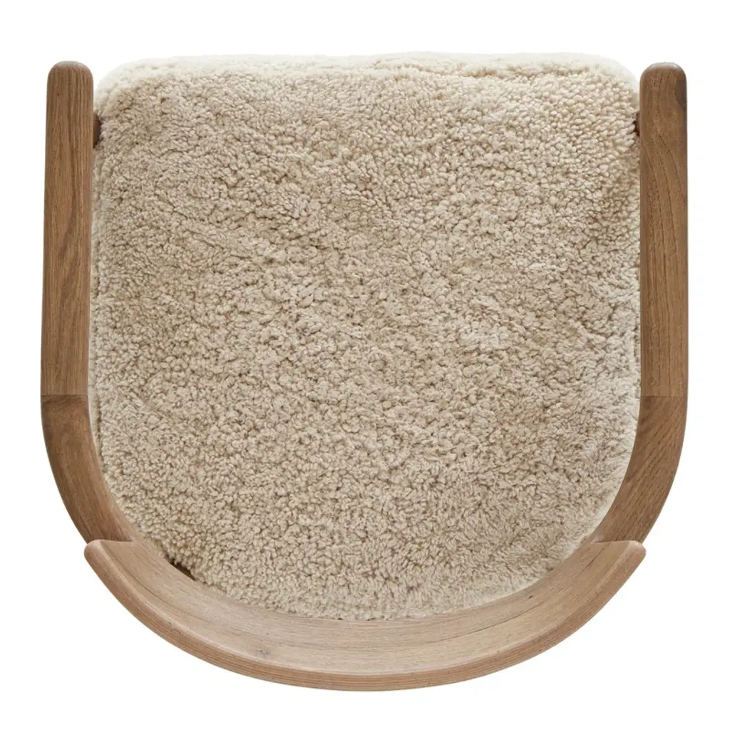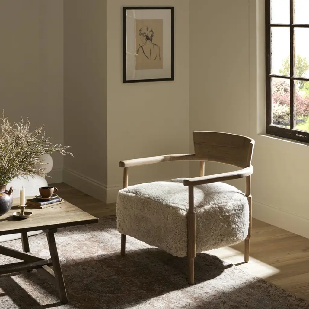 A design collaboration by Amber Lewis and Four Hands. A new classic is created by blending the look and charm of traditional woodworking with thick cushion seating. The frame of the chair is crafted from solid oak and features gently turned dowel legs, plus arm rails that wrap around the back in a perfect U shape. Covered in 100% natural shearling.