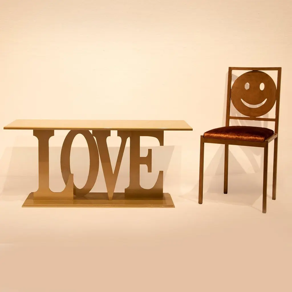 Imperfect Love Collection features chairs, coffee tables, consoles created by Giulia Ligresti characterized by a distinct, typographic design. Made by hand by skilled Italian craftsmen, this console features an iron frame with brushed gold-painted finish showcasing a four-letter-block base spelling out the word "LOVE". This console comes also in black makes a unique accent piece in a contemporary foyer or living room where it will bring a playful statement. Due to the handcrafted nature, reproductions may show slight differences from the item shown.