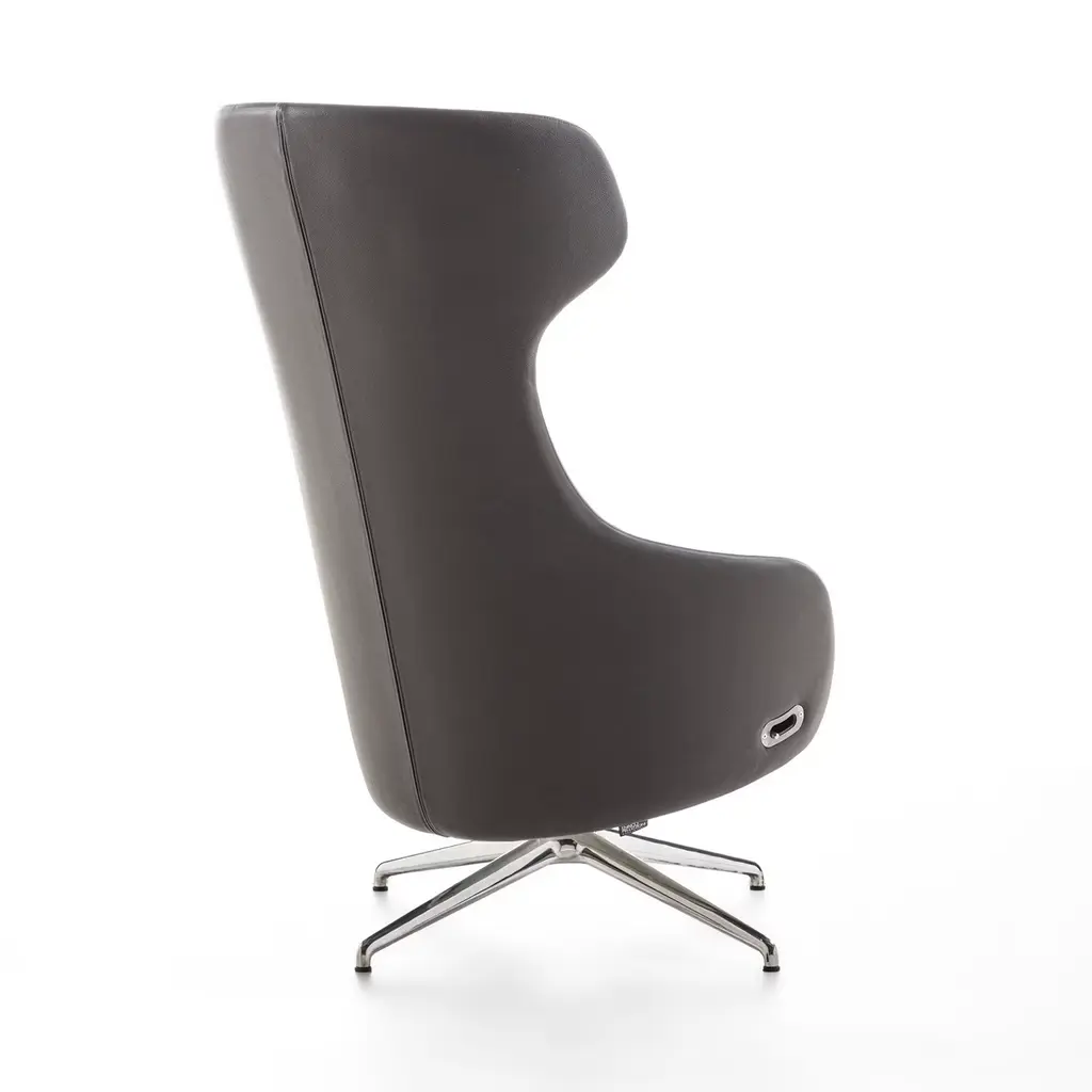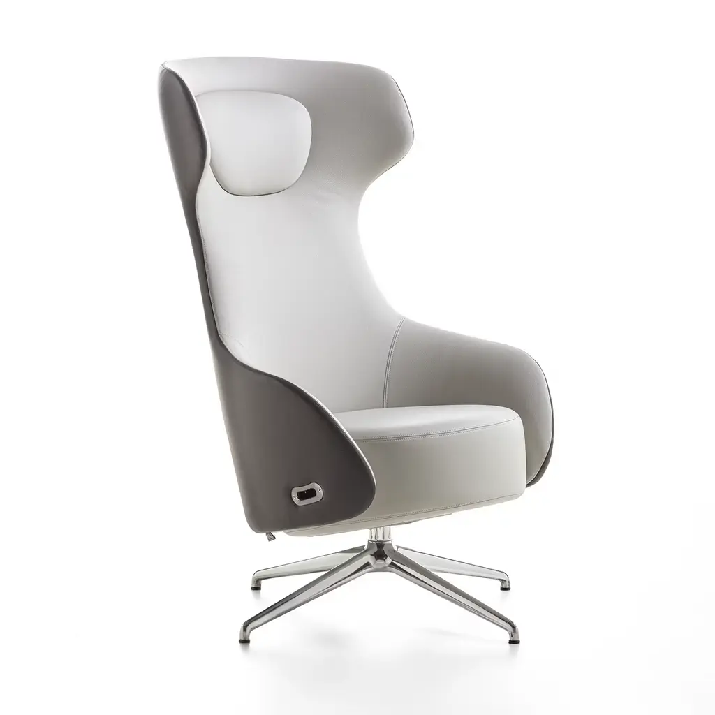 Swivel relax armchair with synchro mechanism. Internal metal frame, polyurethane foam padding, integrated headrest, and seat cushion, covered in leather, faux leather, or felt. 4-spoke base in polished chrome or painted. Swivel and tilt mechanism. All the components are available in other colors.