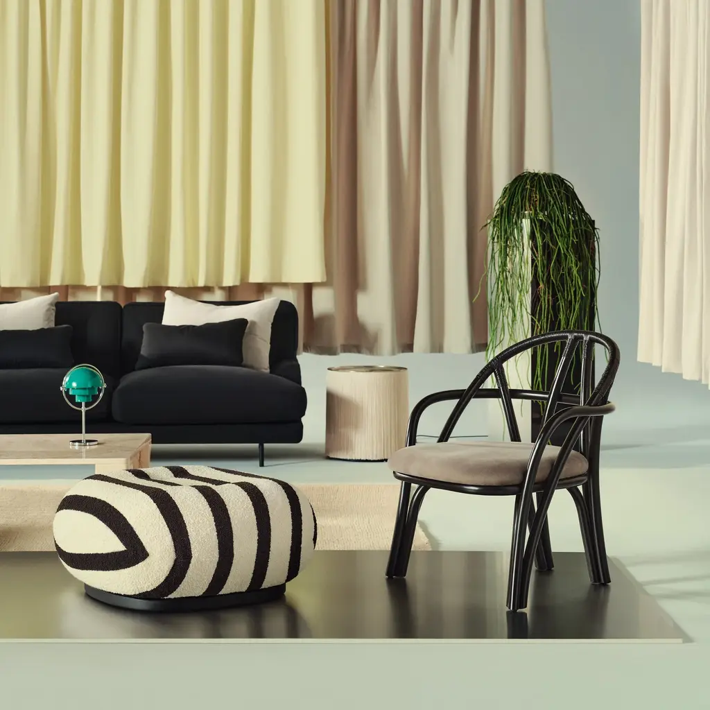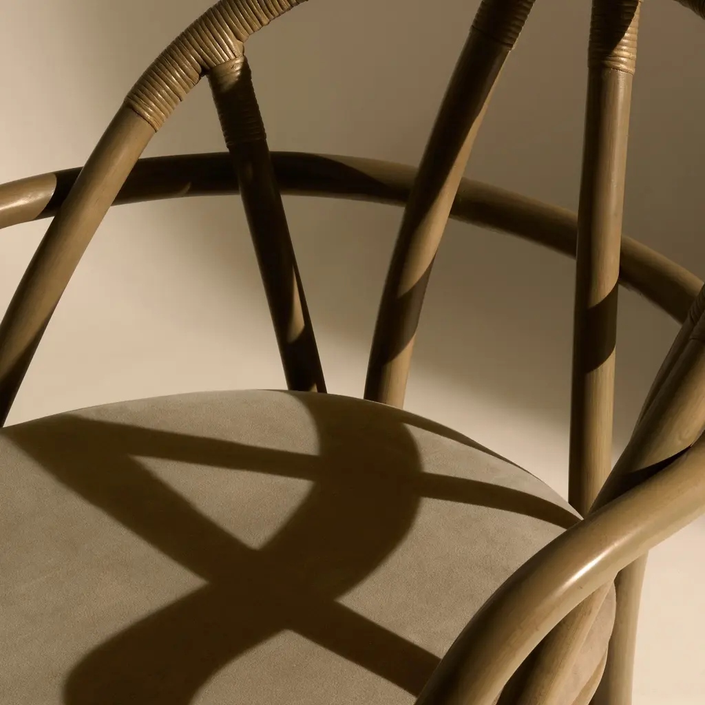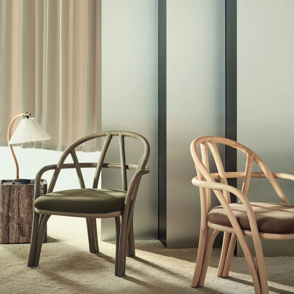 The Bistra Lounge Chair from Gubi, designed by AMDL Circle, reinterprets the classic bistro chair through a sculptural lens. Crafted from steam-bent rattan, its minimalist form showcases a gracefully curved backrest and armrests, supported by a distinctive double-fork base. This design not only emphasizes the beauty of natural materials but also introduces a sense of organic growth, making it a timeless addition to any modern interior. Highlights