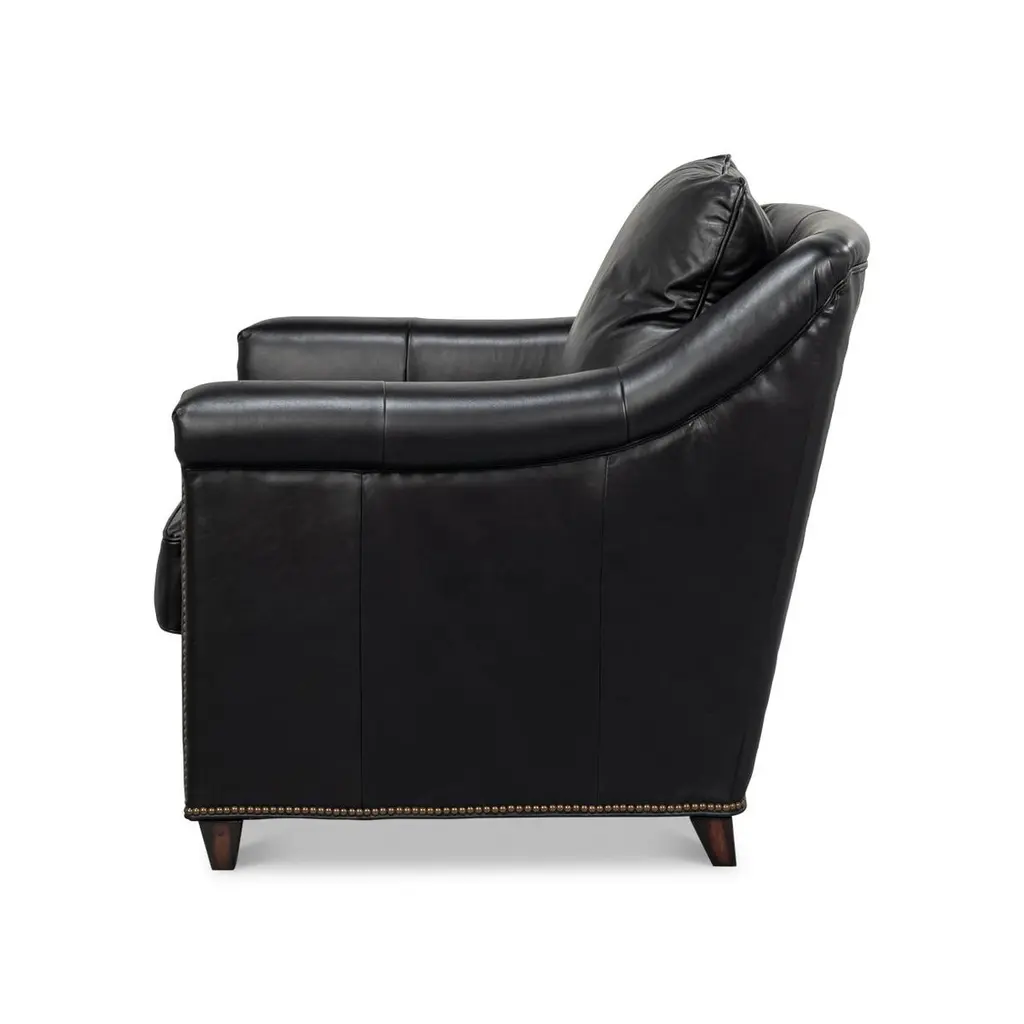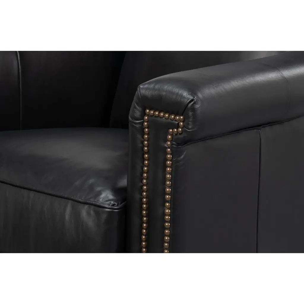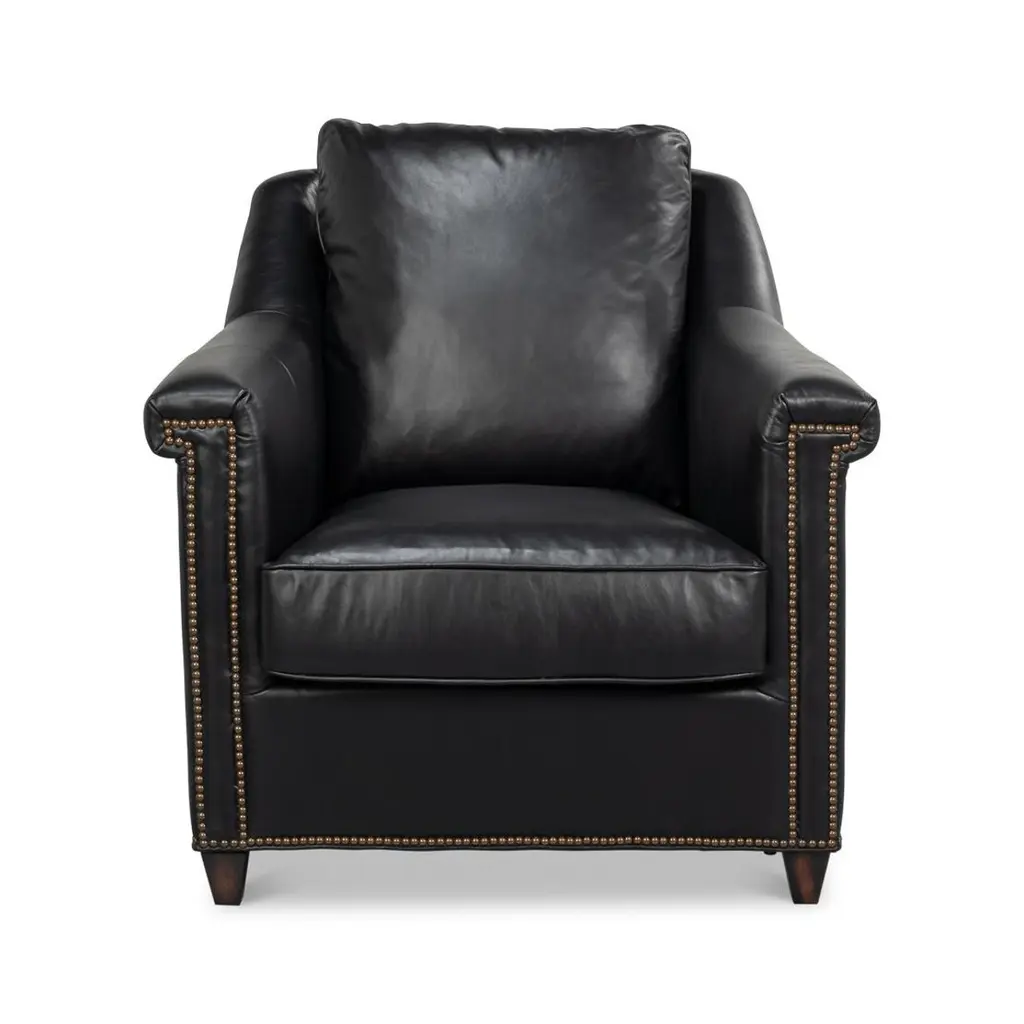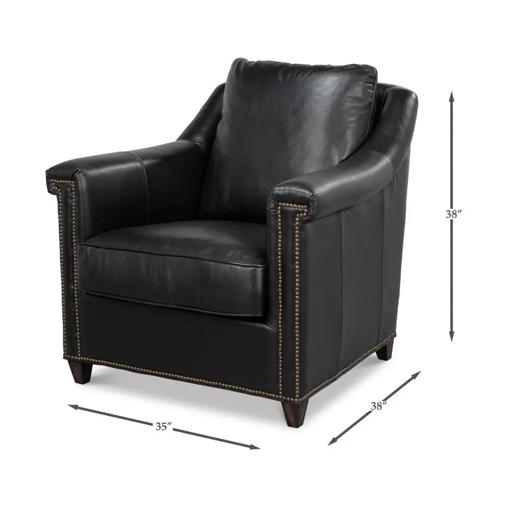 Upholstered in rich Onyx Black leather, this chair is designed to make a statement. Its contrasting oak wood frame adds a touch of classic charm, while the nailhead trim along the edges provides refined detailing and sophistication.Ideal for living rooms, studies, or lounges, this versatile accent chair combines plush seating with an elegant silhouette. Whether used in pairs as a focal point or as part of a curated decor, the chair adds warmth and style to any room.Dimensions: 35" W x 38" D x 38" HSeat - 18"Arms - 27"