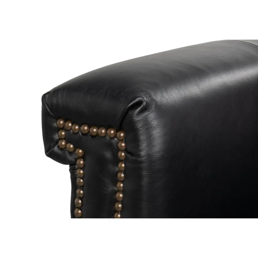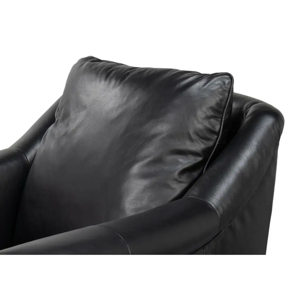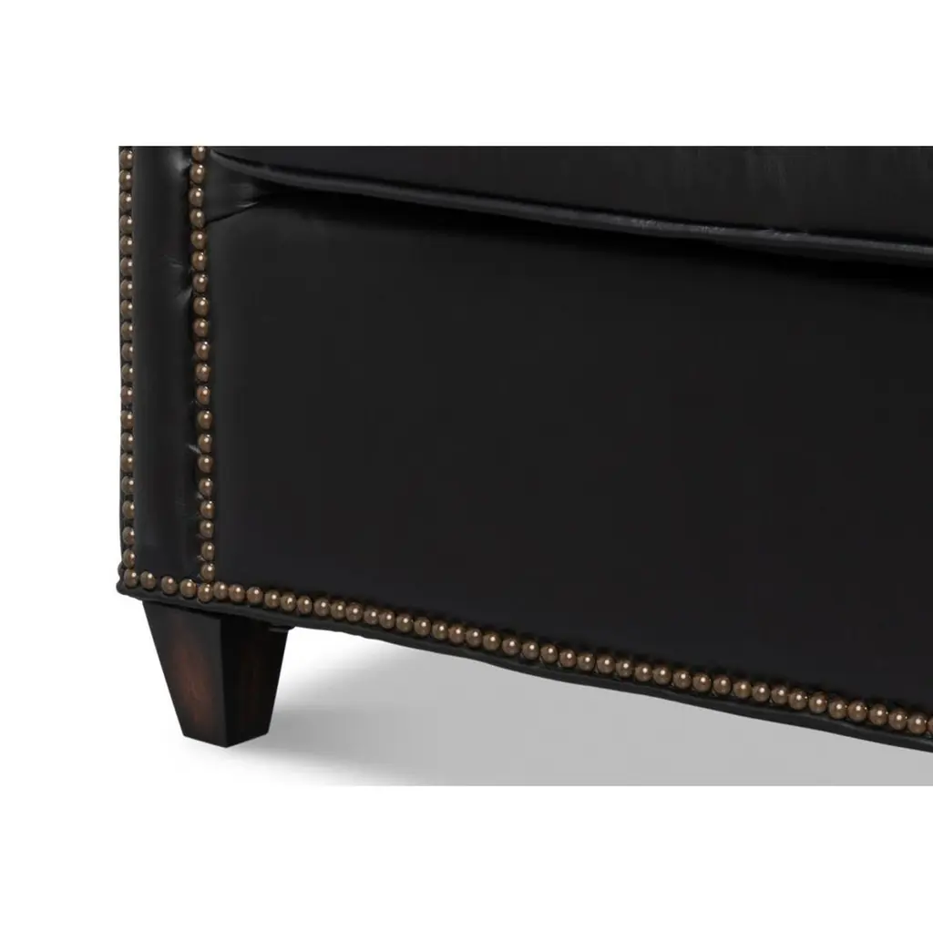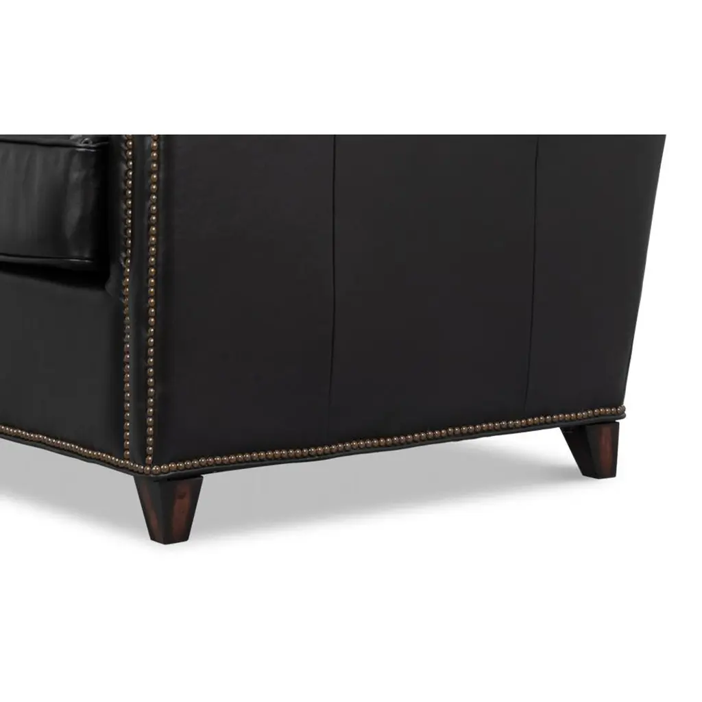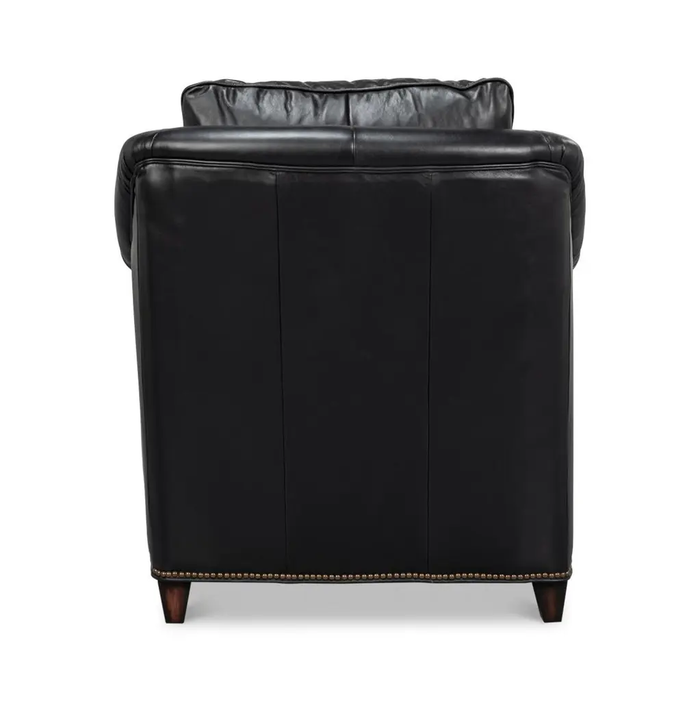 Upholstered in rich Onyx Black leather, this chair is designed to make a statement. Its contrasting oak wood frame adds a touch of classic charm, while the nailhead trim along the edges provides refined detailing and sophistication.Ideal for living rooms, studies, or lounges, this versatile accent chair combines plush seating with an elegant silhouette. Whether used in pairs as a focal point or as part of a curated decor, the chair adds warmth and style to any room.Dimensions: 35" W x 38" D x 38" HSeat - 18"Arms - 27"