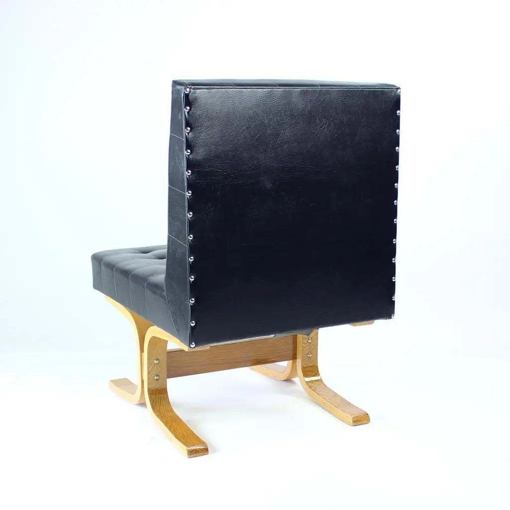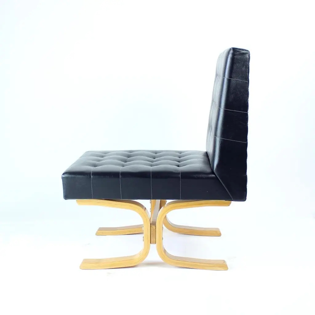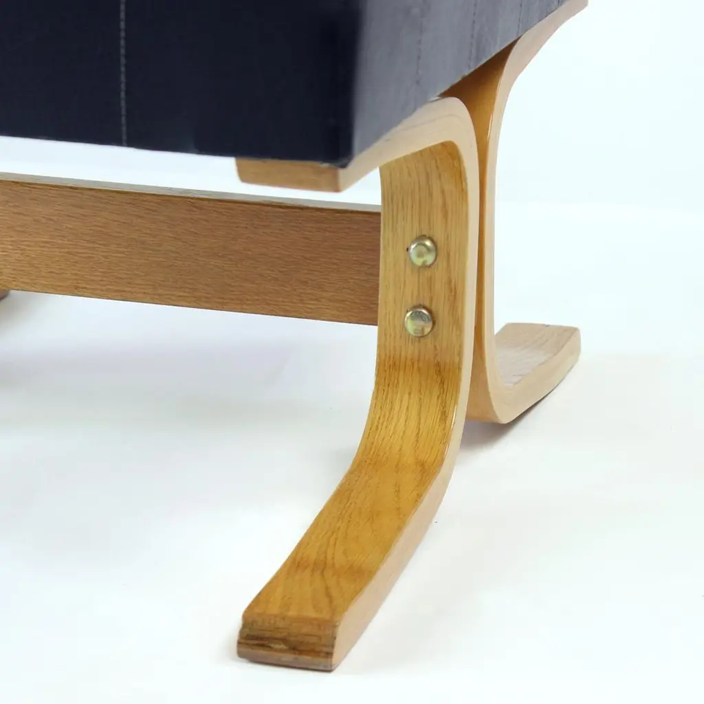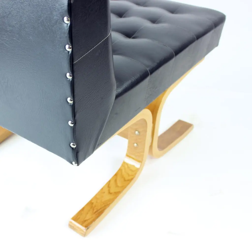 Beautiful, iconic lounge chair named Bratislava after a capital of Slovakia. This lounge chair was produced by Drevopodnik Holesov in 1960s and was designed by Jindrich Volak. The Holesov factory was known for its work with the dent woodlaminate which allows the construction to be strong, yet formed in interesting bent-wood constructions and shapes. This model was designed to be easy and simple with a beautiful bentwood base. The chair is original with some remaining label attached. The seat is in an original black leatherette with beautiful shape of squares on the seat and back. The base has been restored with new finish and varnish. The wood is restored to its original state. Beautiful lounge chair for any occassions with a clean and elegant design. Excellent condition of the chair. Two chairs available, price per chair.