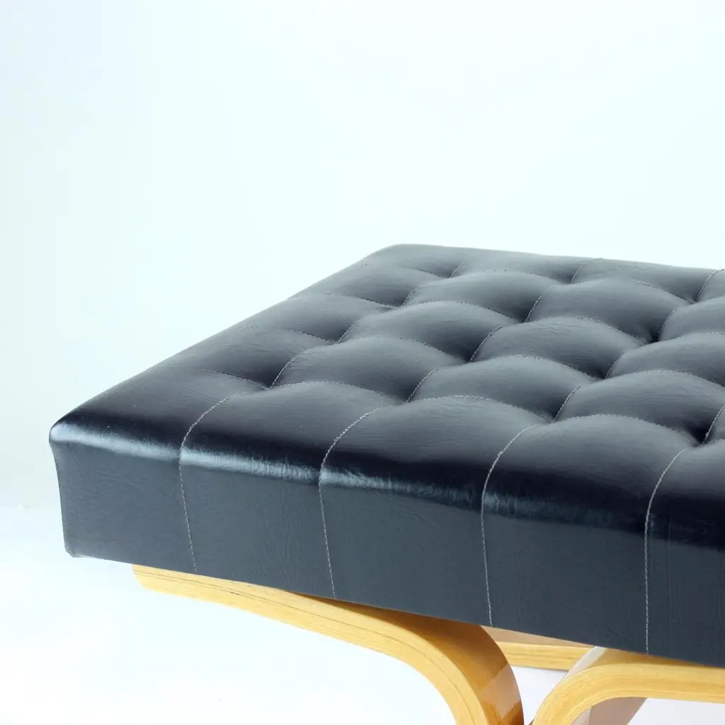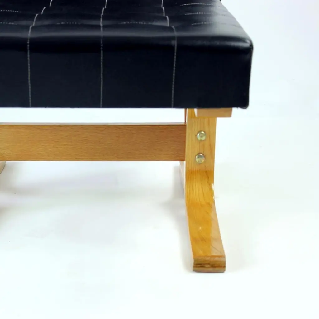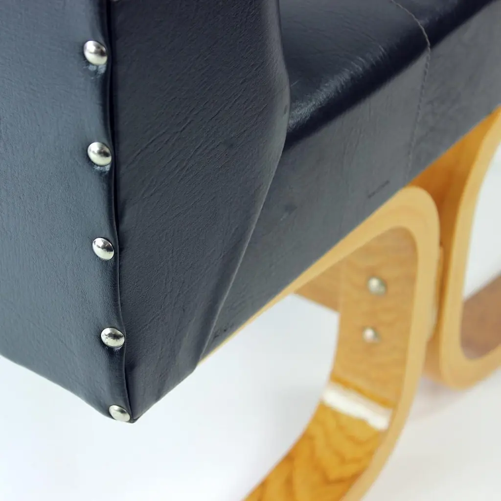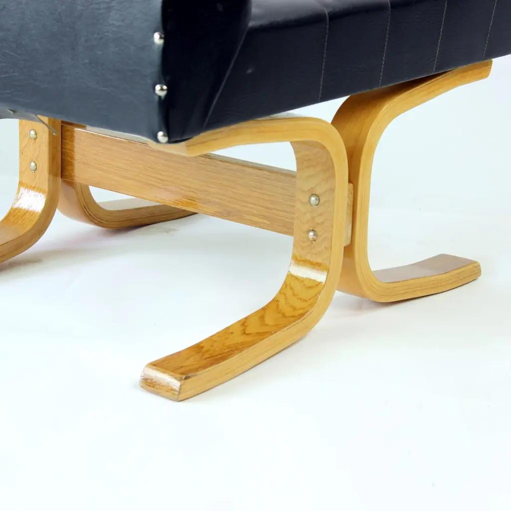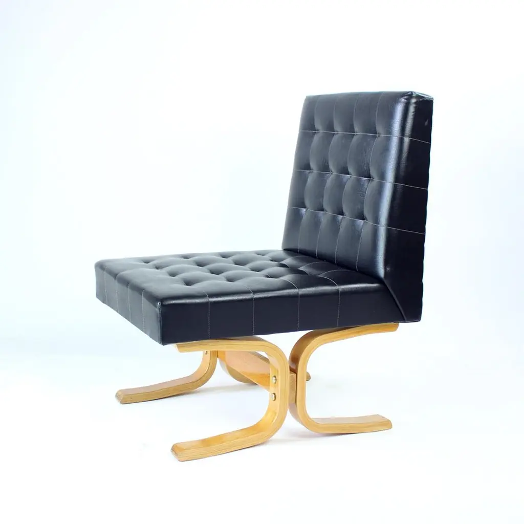 Beautiful, iconic lounge chair named Bratislava after a capital of Slovakia. This lounge chair was produced by Drevopodnik Holesov in 1960s and was designed by Jindrich Volak. The Holesov factory was known for its work with the dent woodlaminate which allows the construction to be strong, yet formed in interesting bent-wood constructions and shapes. This model was designed to be easy and simple with a beautiful bentwood base. The chair is original with some remaining label attached. The seat is in an original black leatherette with beautiful shape of squares on the seat and back. The base has been restored with new finish and varnish. The wood is restored to its original state. Beautiful lounge chair for any occassions with a clean and elegant design. Excellent condition of the chair. Two chairs available, price per chair.