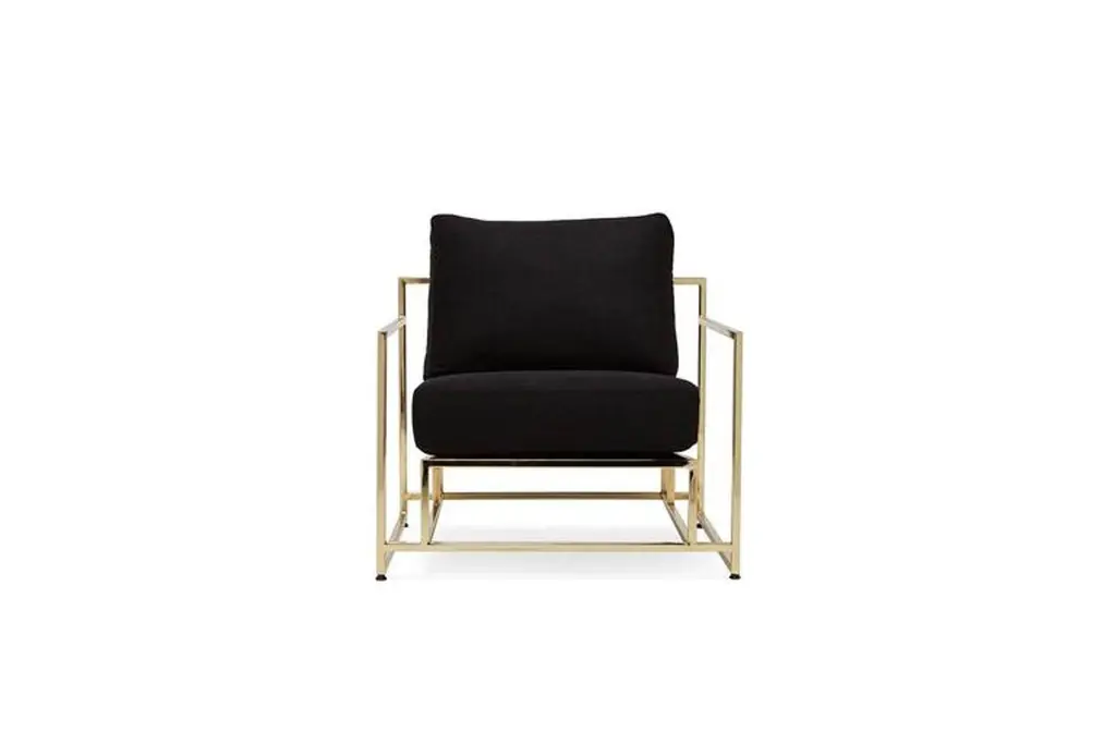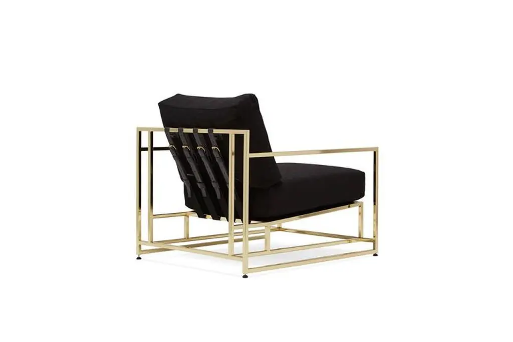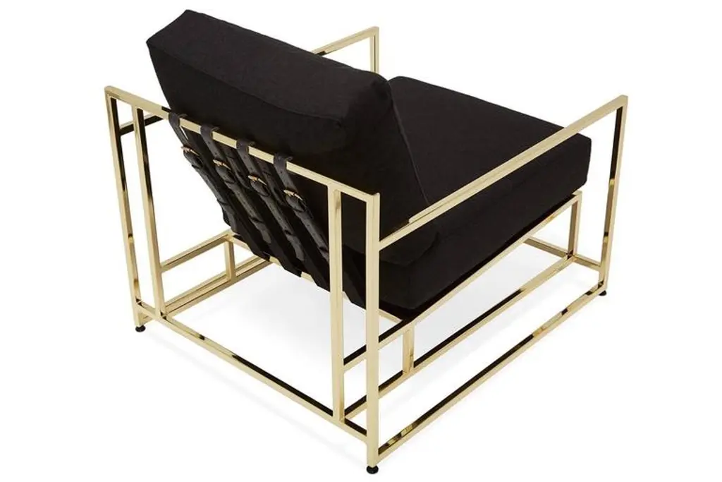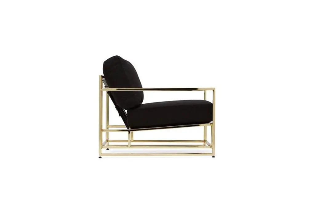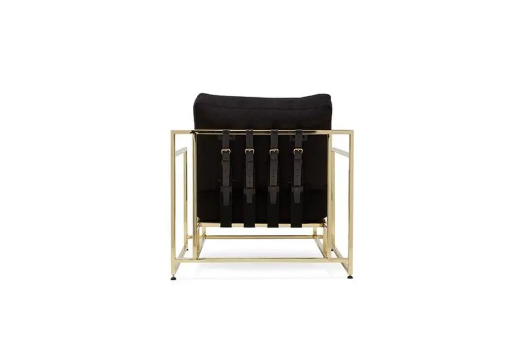 The Inheritance Armchair by Stephen Kenn is as comfortable as it is unique. The design features an exposed construction composed of three elements - a steel frame, plush upholstery, and supportive belts. The deep seating area is perfect for a relaxing lounge experience. This armchair comes with removable cushion covers to allow for easy cleaning should the need arise. Every Stephen Kenn piece is made to order through our Los Angeles studio in partnership with a number of small businesses and fabricators in the LA area. With this highly customizable armchair you can select from a wide range of finishes and materials to complement your home and lifestyle - please message us to see our Customization Guide with all available options.This version of our Inheritance Armchair is upholstered in black wool. The foam seat cushions have been wrapped in polyfiber for added softness and comfort. Sitting atop a polished brass steel plated frame, the armchair is strapped with support belts featuring black cotton webbing, black leather, and polished brass buckles.