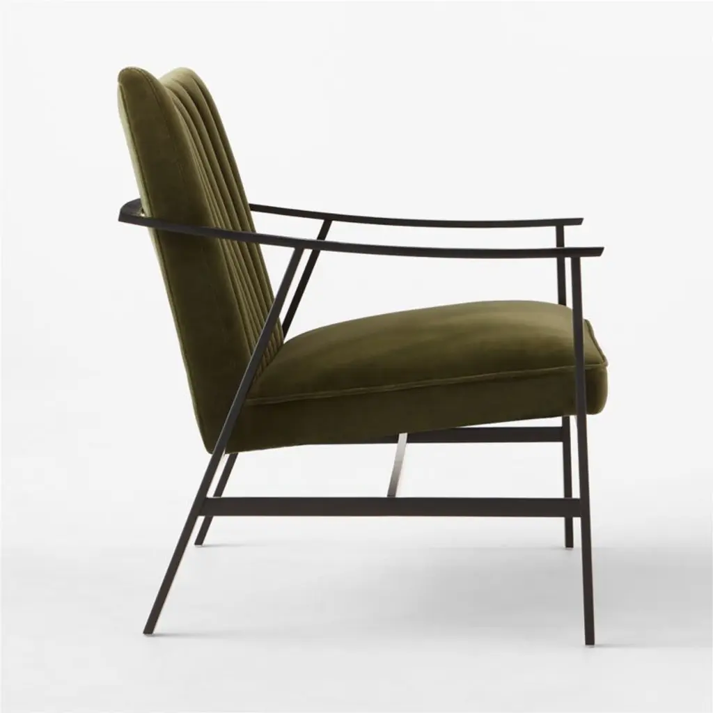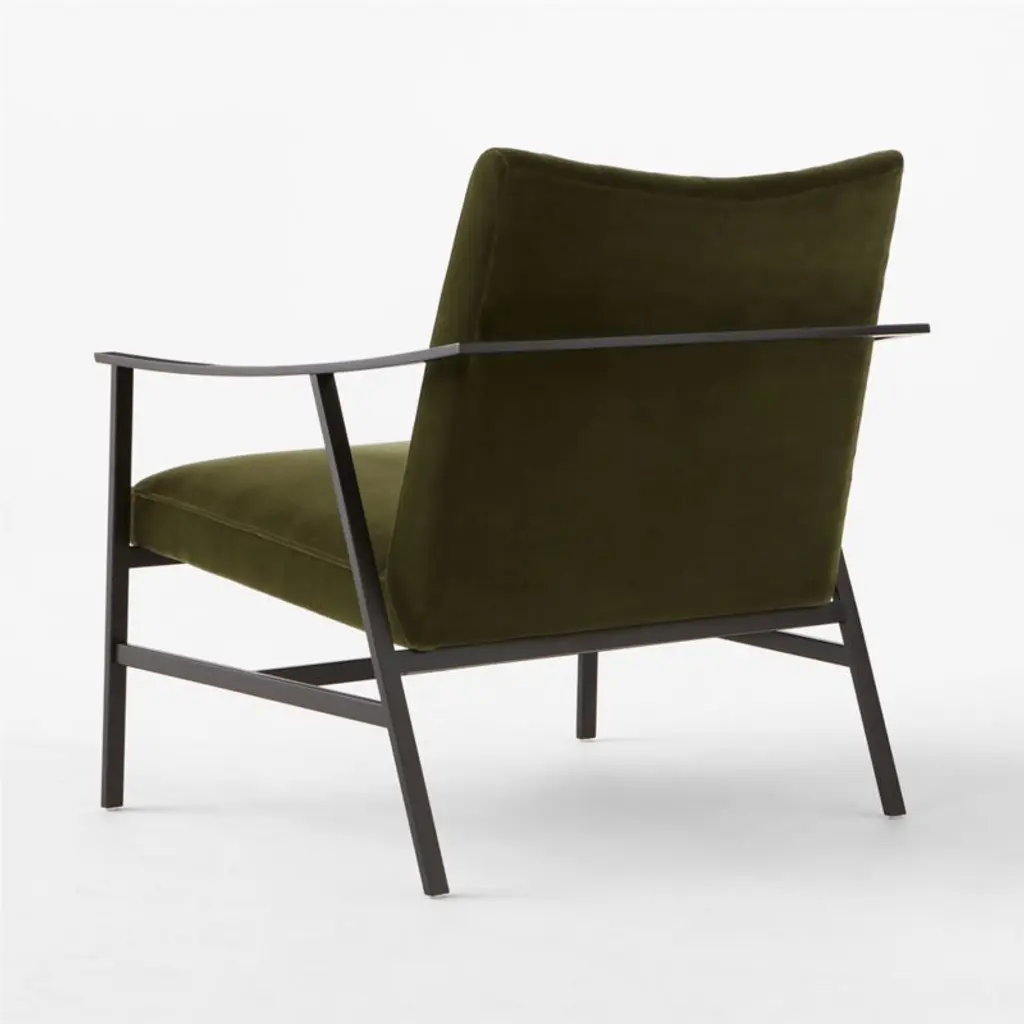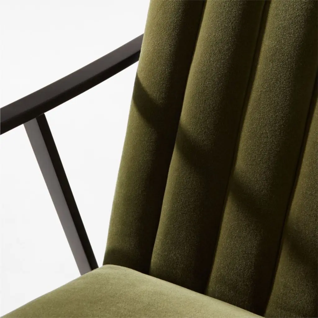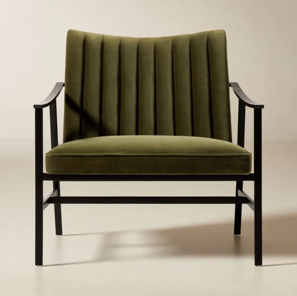 Introduced as office seating for the Blair Aluminum Furniture Company in the June 1961 issue of Interiors Magazine, green velvet chair by Paul McCobb reflects the refined restraint of his most iconic designs. Set atop blackened metal legs, the generously cushioned seat and back are wrapped in plush green velvet with a tailored channel tufting. CB2 exclusive.