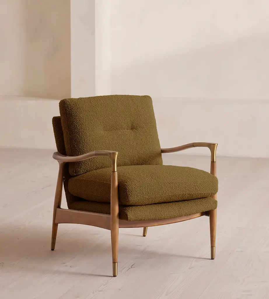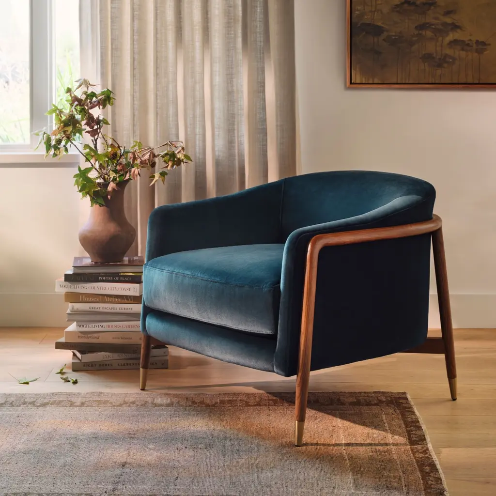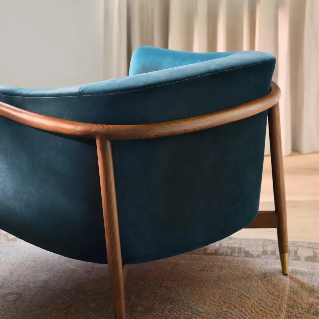 Soft modernity meets classic mid-century details in the Blake accent chair. Featuring a curved walnut wood frame, brass-capped legs, and a sloped arm, the Blake makes for an eye-catching statement piece in any space. Contract grade.