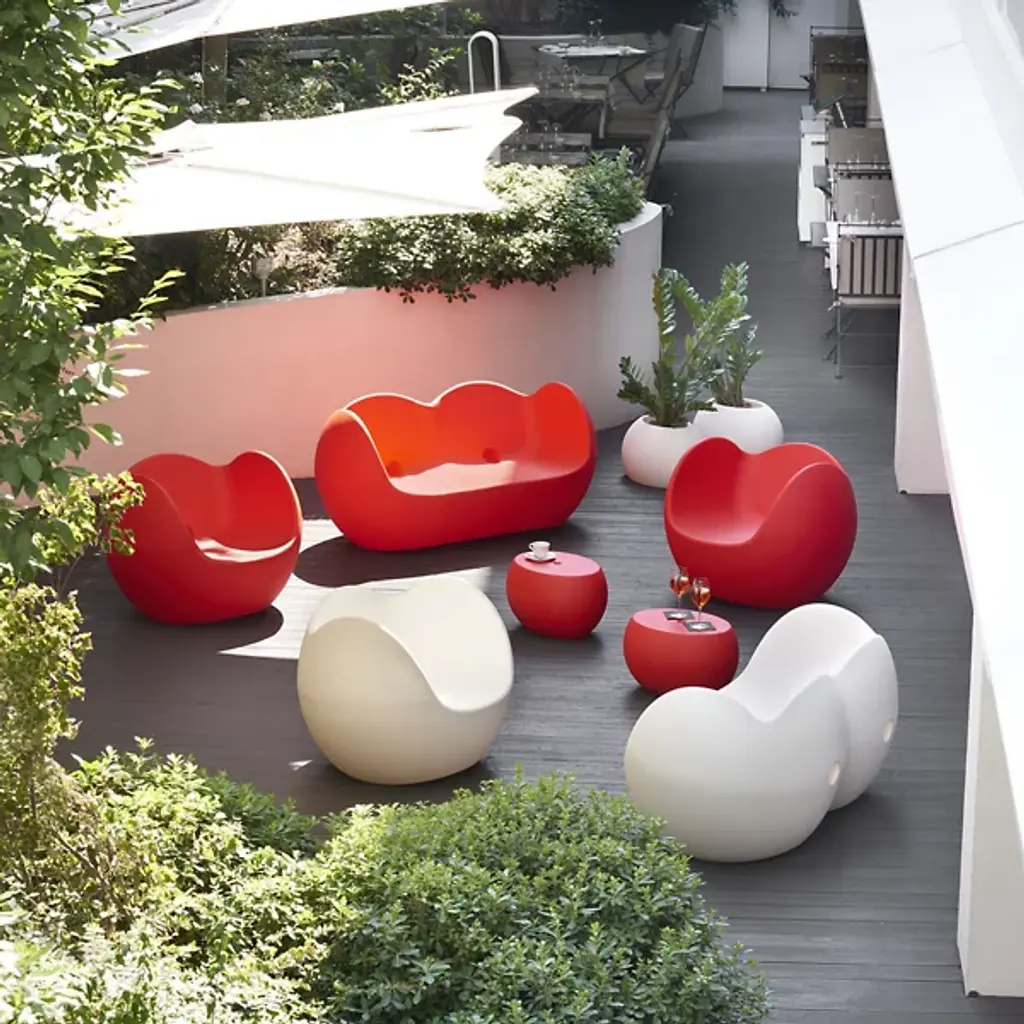 Presented by Slide and made in Italy, the Blos Lounge Chair is a mid-mod-inspired design from Karim Rashid. The contemporary look is amplified by the smooth, egg-like silhouette of the lacquer-finished polyethylene bodice. Made in Italy, the playful styling of this all-weather chair helps elevate the look and feel of entertaining and lounge areas. Suitable for display solo or can be arranged with other members of the Blos family.