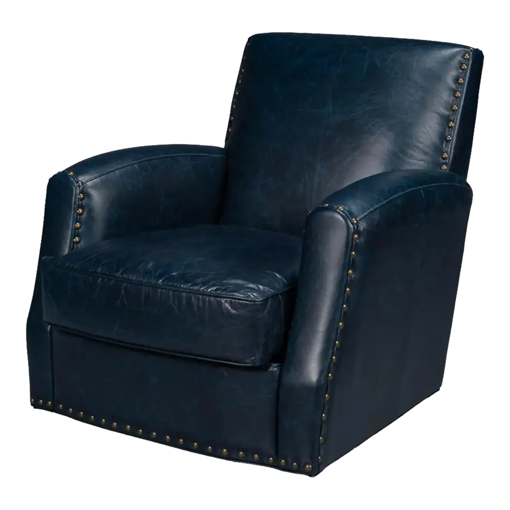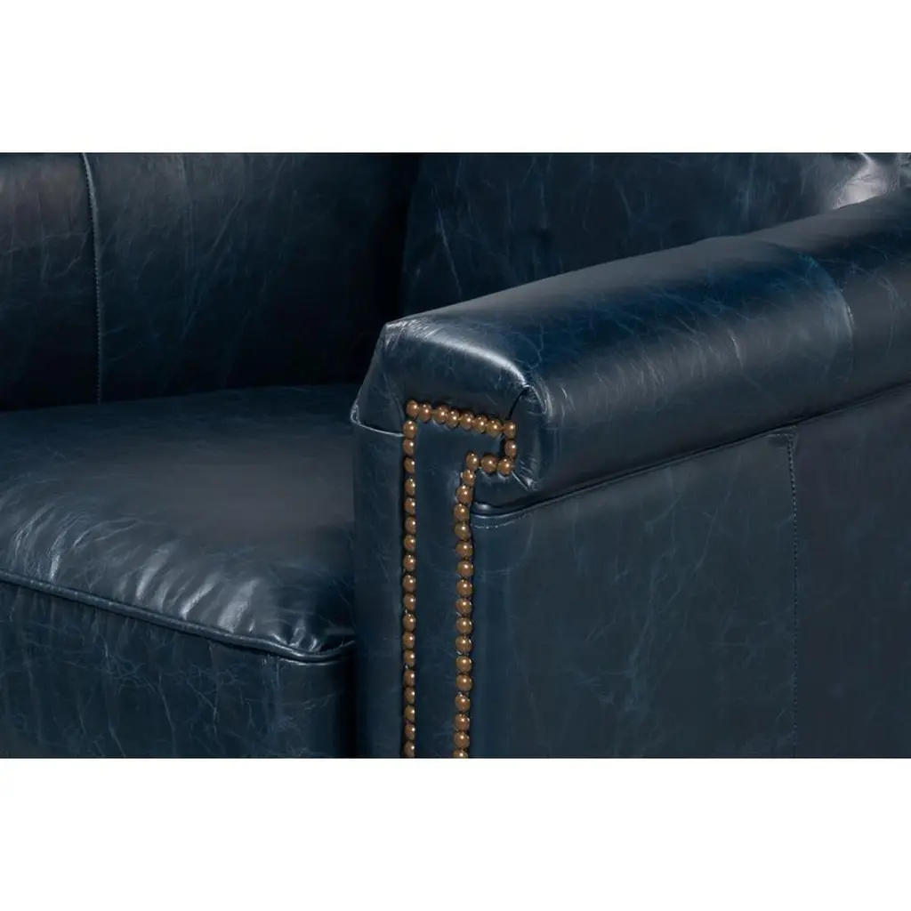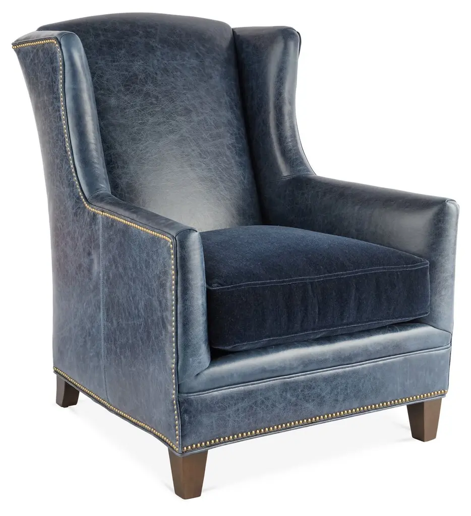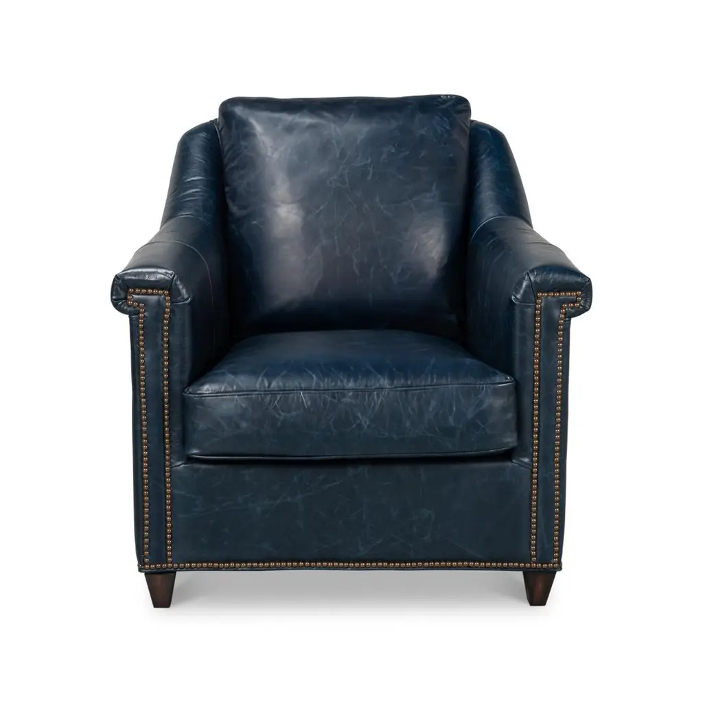 Upholstered in rich Chateau Blue leather, this chair is designed to make a statement. Its contrasting oak wood frame adds a touch of classic charm, while the nailhead trim along the edges provides refined detailing and sophistication.Ideal for living rooms, studies, or lounges, this versatile accent chair combines plush seating with an elegant silhouette. Whether used in pairs as a focal point or as part of a curated decor, the chair adds warmth and style to any room.Dimensions: 35" W x 38" D x 38" HSeat - 18"Arms - 27"