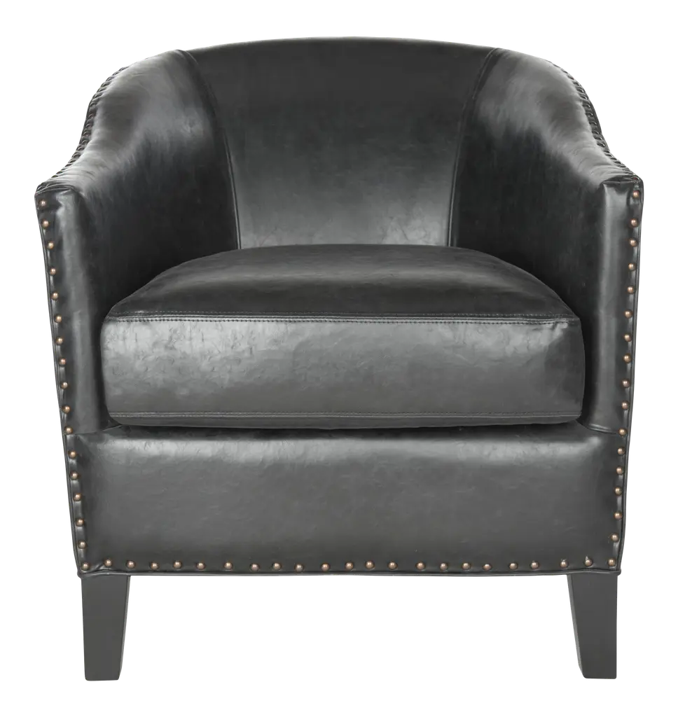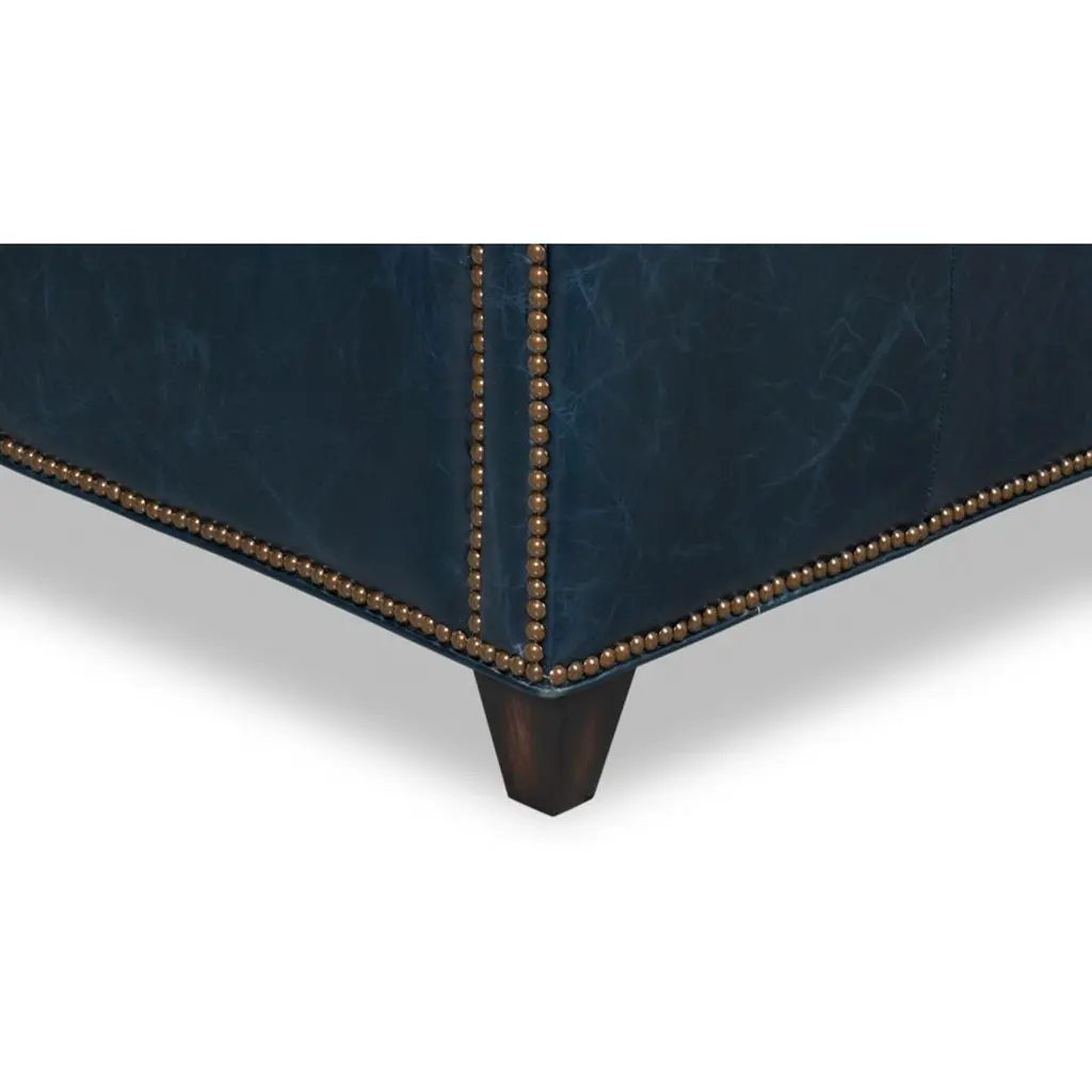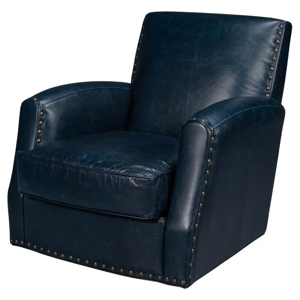 Upholstered in rich Chateau Blue leather, this chair is designed to make a statement. Its contrasting oak wood frame adds a touch of classic charm, while the nailhead trim along the edges provides refined detailing and sophistication.Ideal for living rooms, studies, or lounges, this versatile accent chair combines plush seating with an elegant silhouette. Whether used in pairs as a focal point or as part of a curated decor, the chair adds warmth and style to any room.Dimensions: 35" W x 38" D x 38" HSeat - 18"Arms - 27"