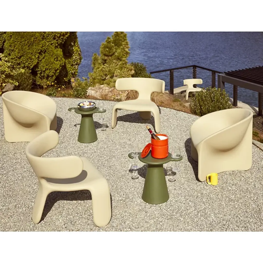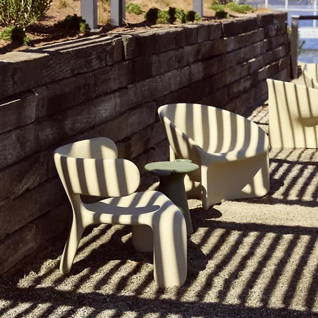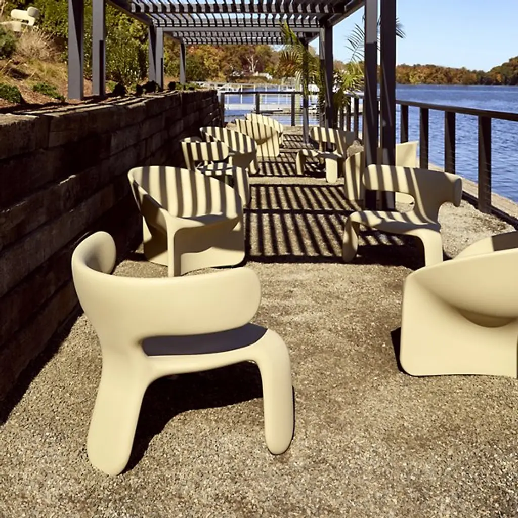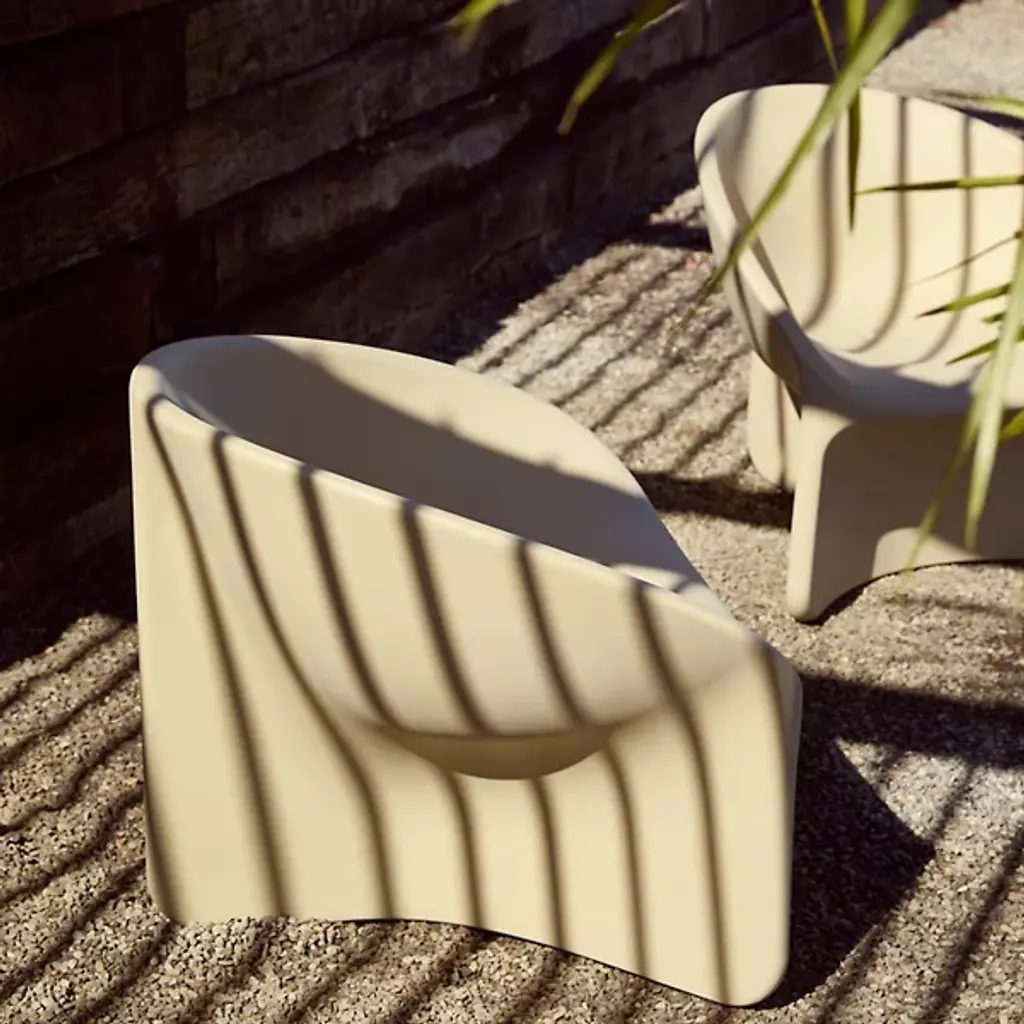 The Bluff Lounge Chair from Heller features an organic and modern design with a comfortable form. The scooped-out design of the seat was inspired by coastal rock formations, where the sea has carved shapes into the rocks. Designer Hlynur Atlason sought to create a chair you'd "no longer [be] aware of when you're seated." The seat also has a drainage hole to prevent pooling, enabling outdoor use. This lounge chair is made in the USA from a high percentage of recycled polyethylene and is 100% recyclable, making it eco-friendly.