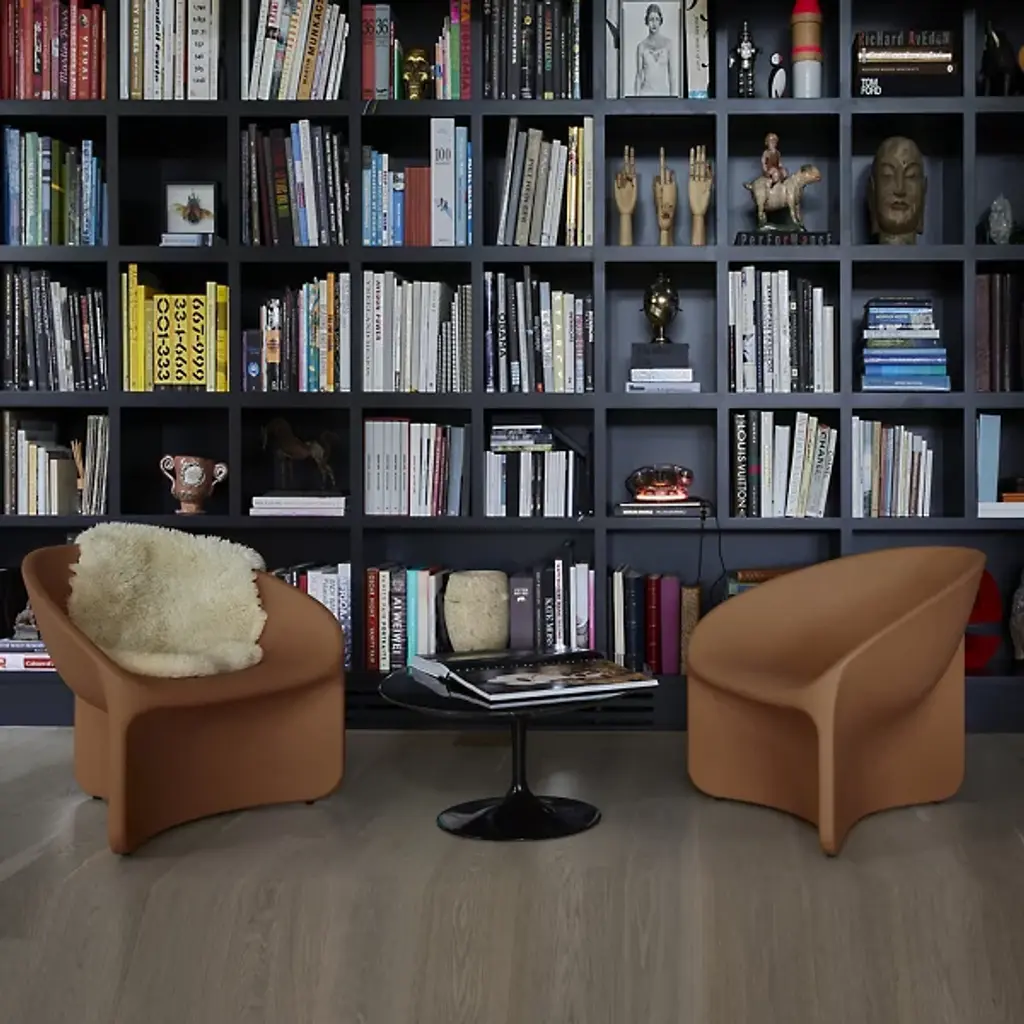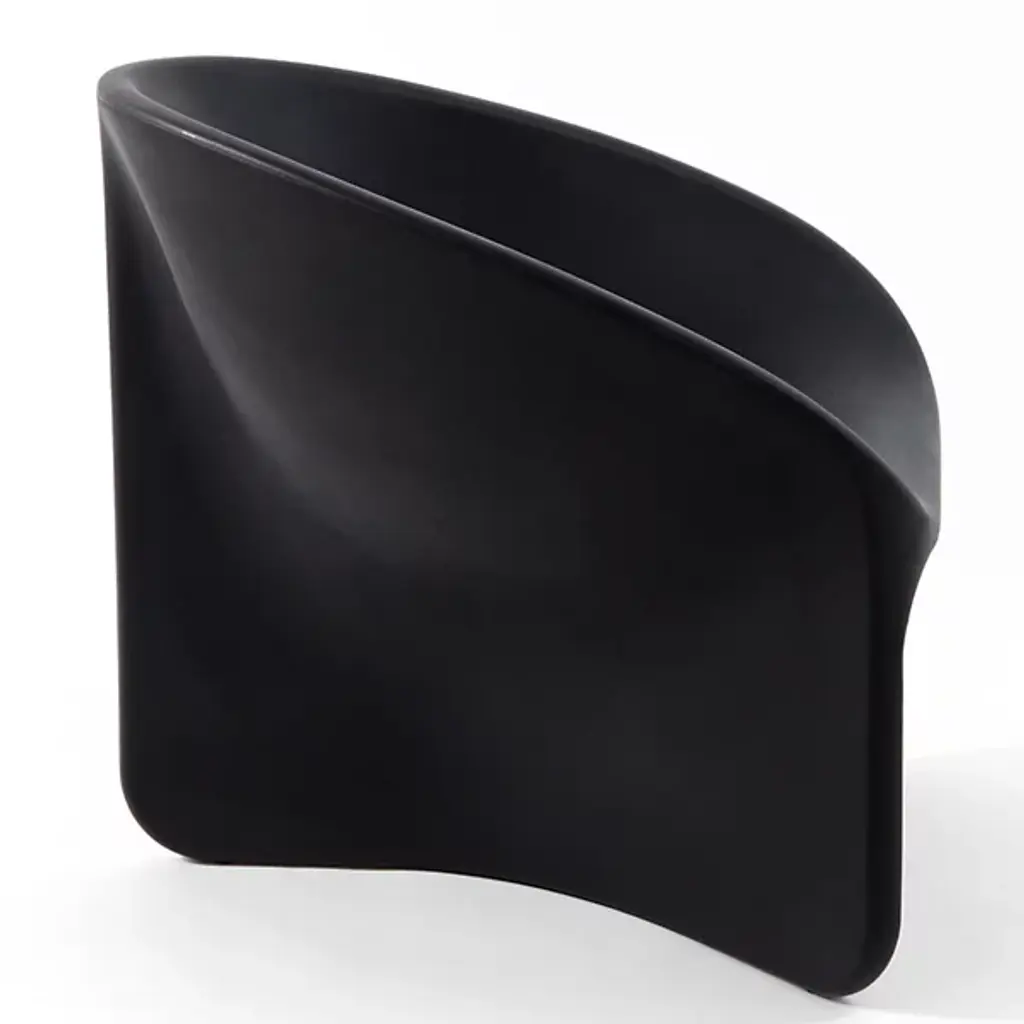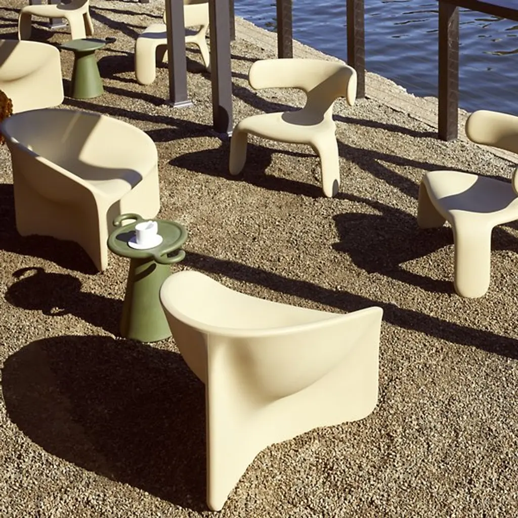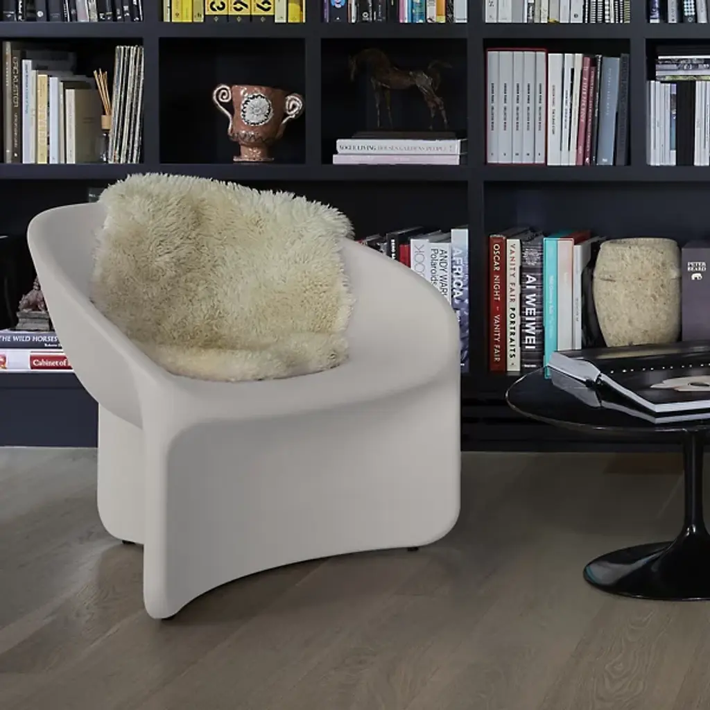 The Bluff Lounge Chair from Heller features an organic and modern design with a comfortable form. The scooped-out design of the seat was inspired by coastal rock formations, where the sea has carved shapes into the rocks. Designer Hlynur Atlason sought to create a chair you'd "no longer [be] aware of when you're seated." The seat also has a drainage hole to prevent pooling, enabling outdoor use. This lounge chair is made in the USA from a high percentage of recycled polyethylene and is 100% recyclable, making it eco-friendly.