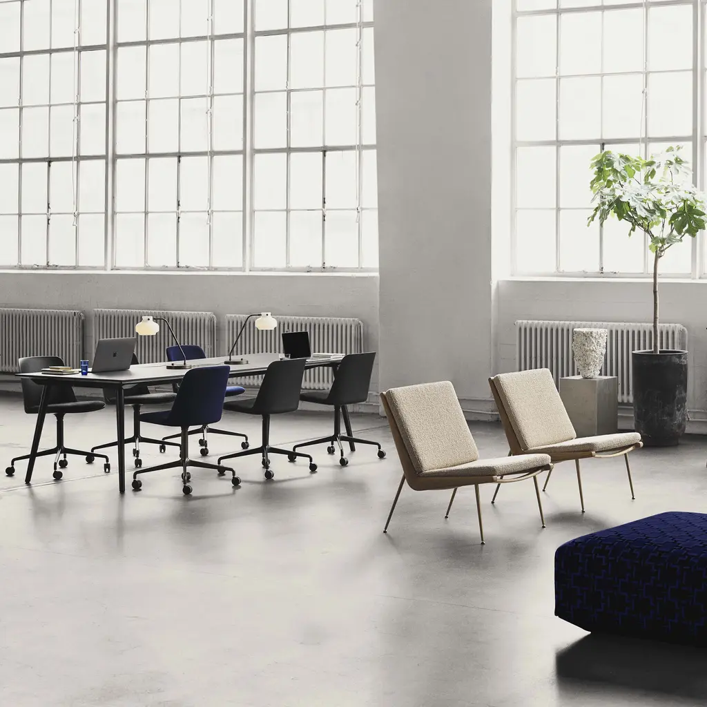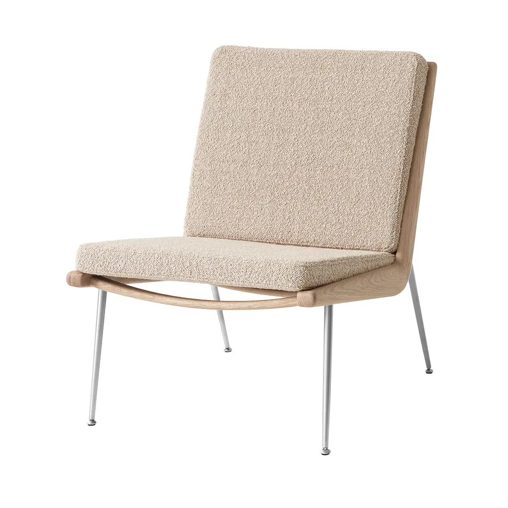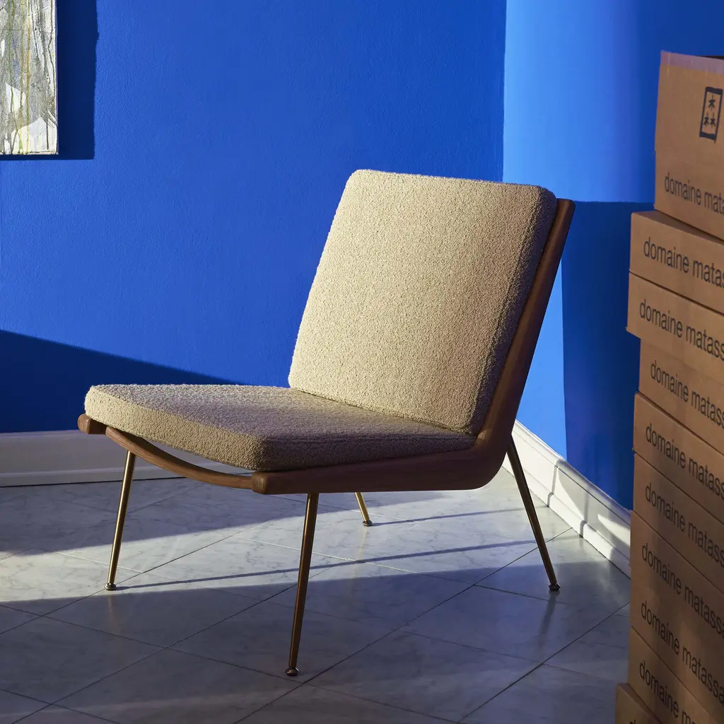 Pioneers of Danish mid-century design Hvidt & Mølgaard first debuted Boomerang in 1956. The lounge chair has an elegantly streamlined form, from its hand-polished wooden frame to its slender conical brass legs. Upholstery in a range of fine textile options complements the available wood finishes in either oiled oak or walnut.