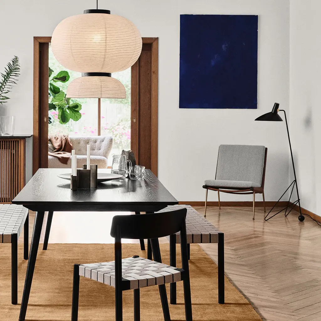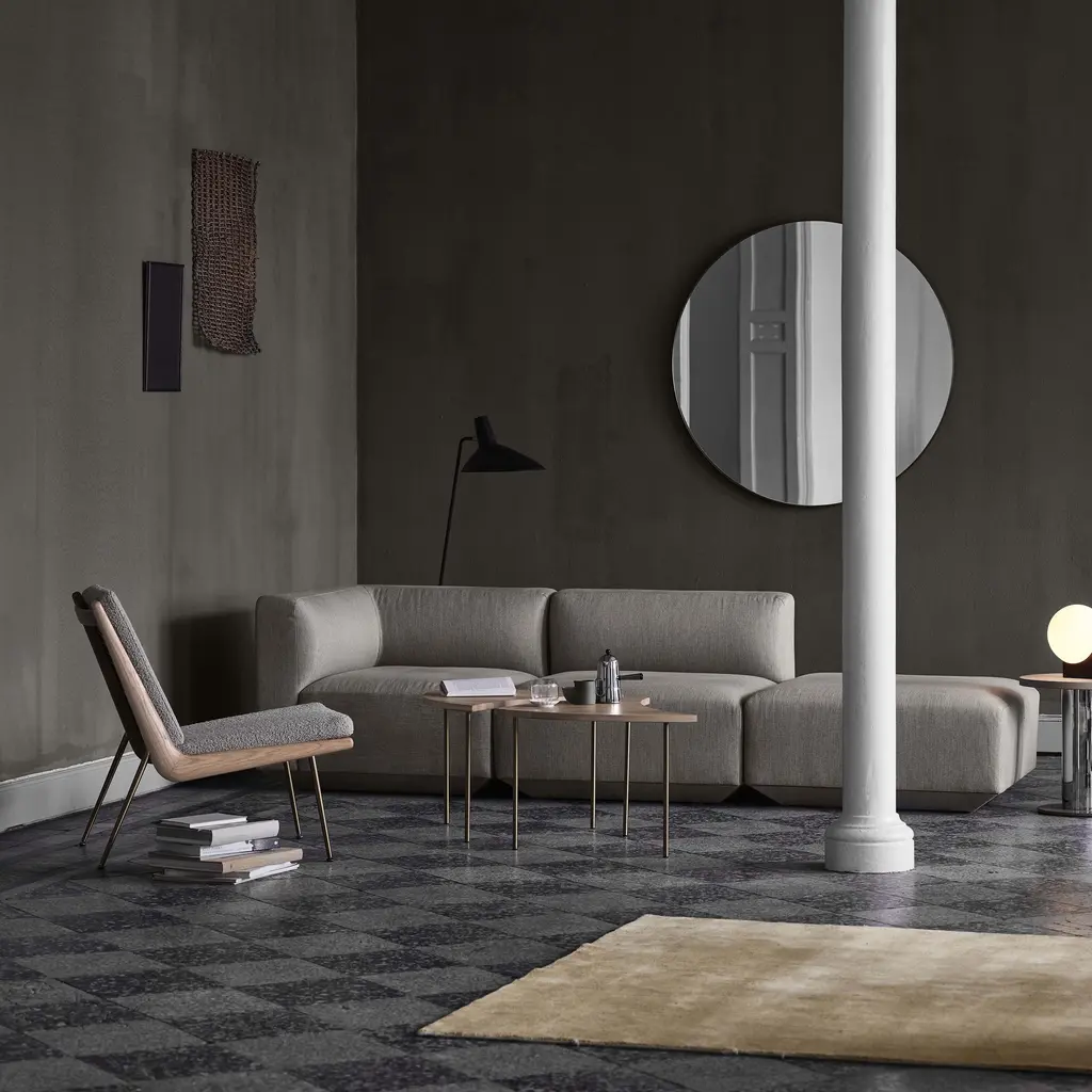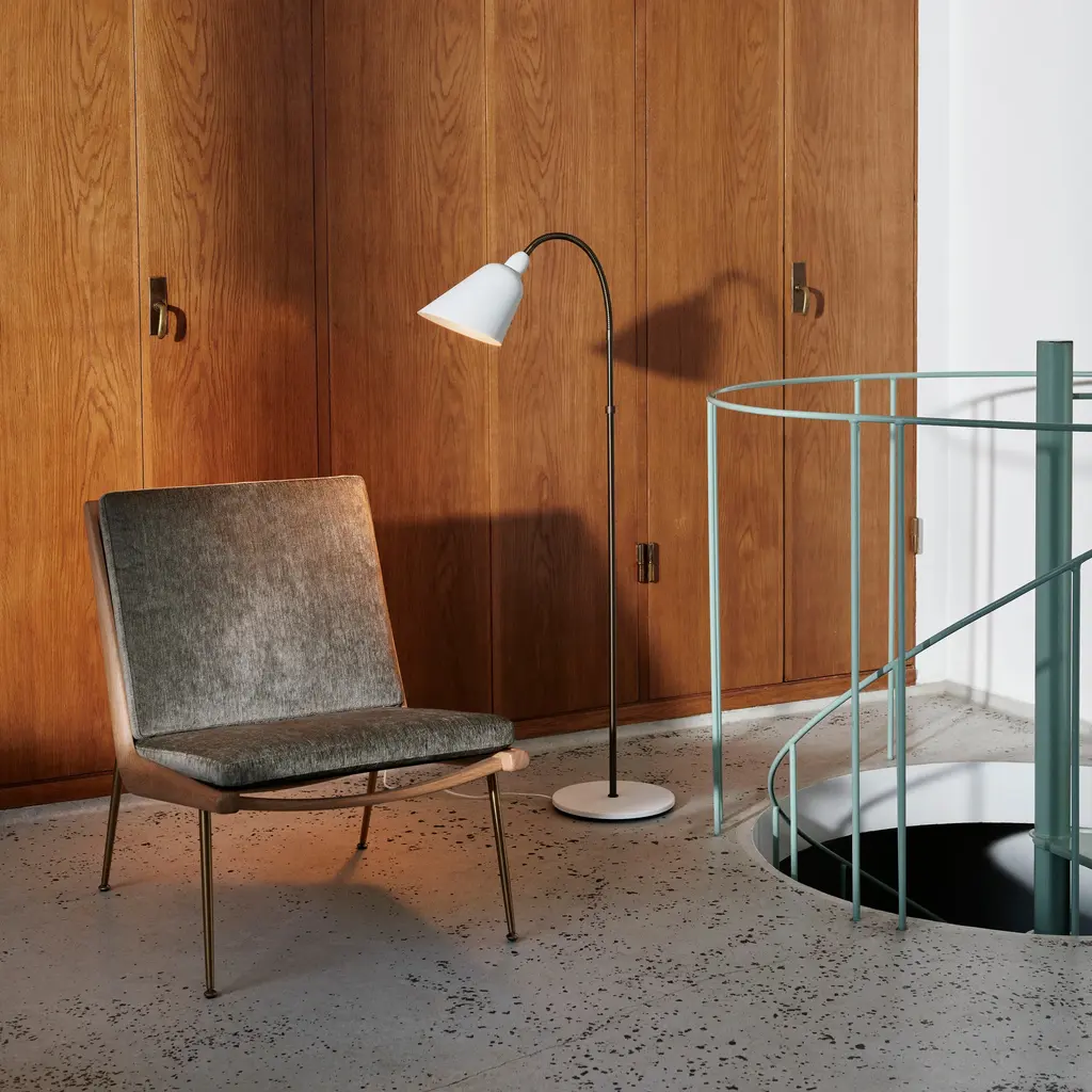 Pioneers of Danish mid-century design Hvidt & Mølgaard first debuted Boomerang in 1956. The lounge chair has an elegantly streamlined form, from its hand-polished wooden frame to its slender conical brass legs. Upholstery in a range of fine textile options complements the available wood finishes in either oiled oak or walnut.