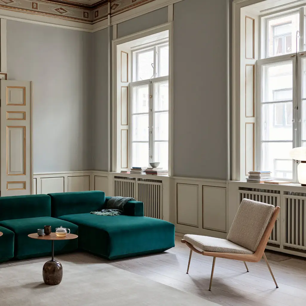 Debuted in 1956, the Boomerang's exacting design continues to delight today. This mid-century classic lounge chair by duo Hvidt & Molgaard has a no-frills form. From a hand-polished wooden frame that echoes the pleasing L-shaped symmetry of its Australian namesake, to the slender brass legs that splay out an angle, the Boomerang endures as a masterpiece. While Hvidt & Molgaard stripped the frame of any superfluous detail, they also employed their superior technical skills to maximize comfort. Its appearance is contemporary, but the Boomerang prioritizes another principle of modern Danish design: that of function. The relaxed slant of the back ensures that one sits with ease, as does the option of a version with arm rests. Reversible pillows with removable covers add further support. "The Boomerang's appeal lies in its stark simplicity, but this streamlined form is deceptive," explains &Tradition CEO and founder Martin Kornbek Hansen. "This is a chair that was made to be enjoyed, with the inclusion of clever details that bolster the body." Renowned for their rigorous approach, Hvidt & Molgaard were pioneers in the shift towards industrialized furniture production. After founding the firm in 1944, the duo combined their understanding of traditional craftsmanship techniques with the desire to craft pieces that were easy to assemble and produce on a mass scale. Many decades after Hvidt & Molgaard first debuted the Boomerang, &Tradition is proud to resume its production in Denmark.