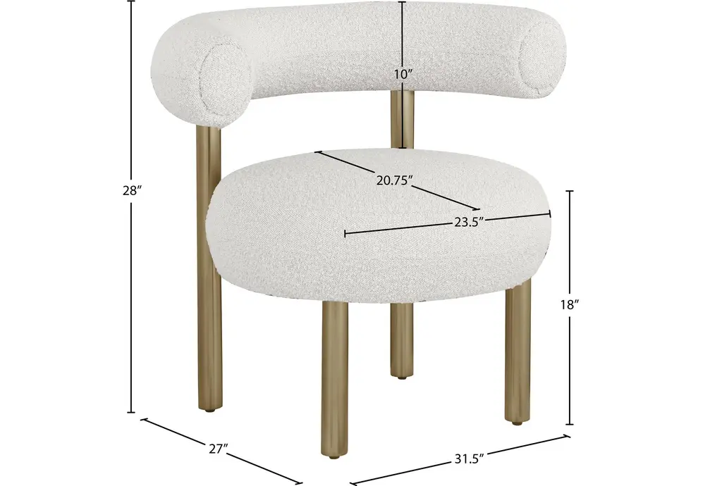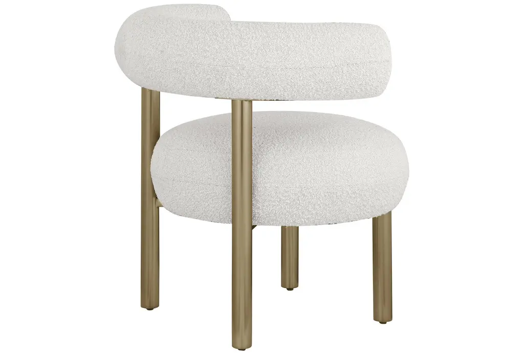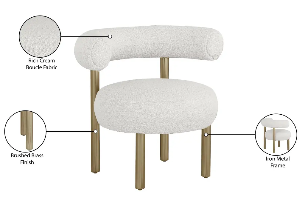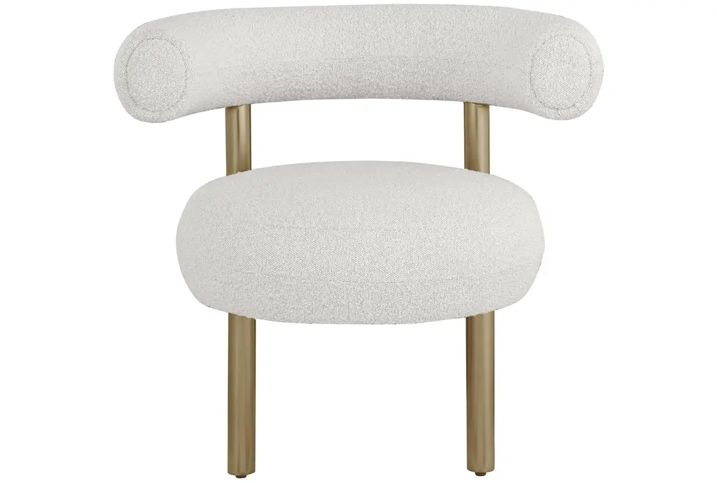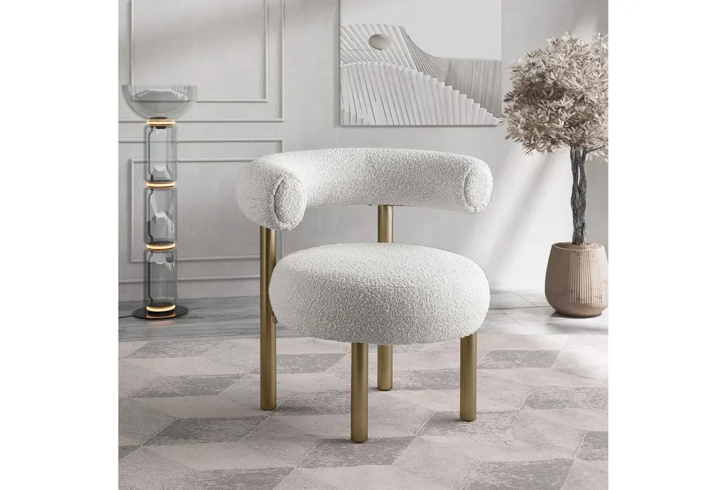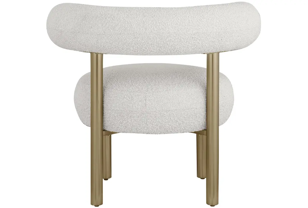 Bordeaux Cream White Boucle Accent Chair adds luxurious texture and modern elegance to your living room space. Its plush cream boucle upholstery pairs beautifully with a brushed brass frame, creating a stylish accent chair and decorative element for any room.