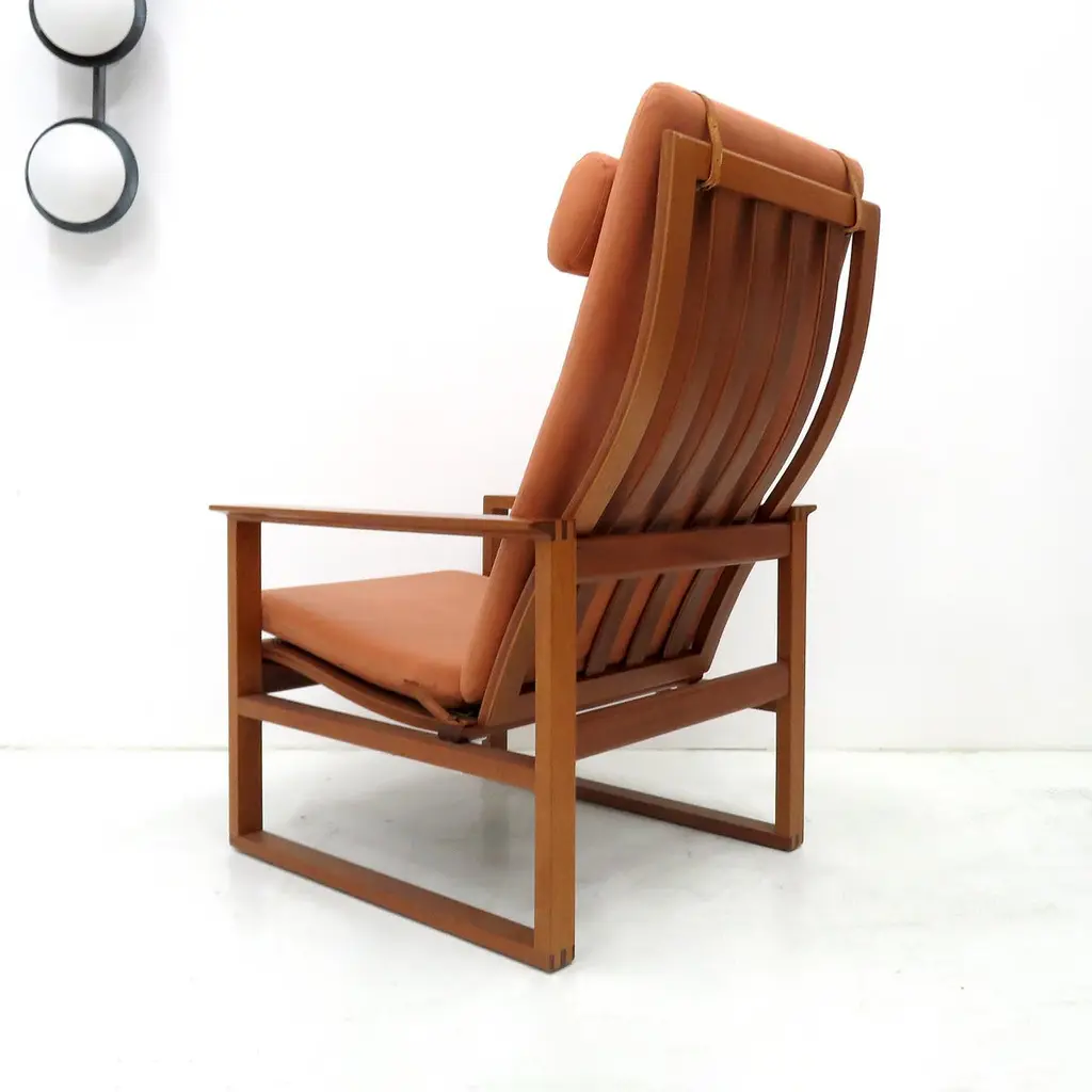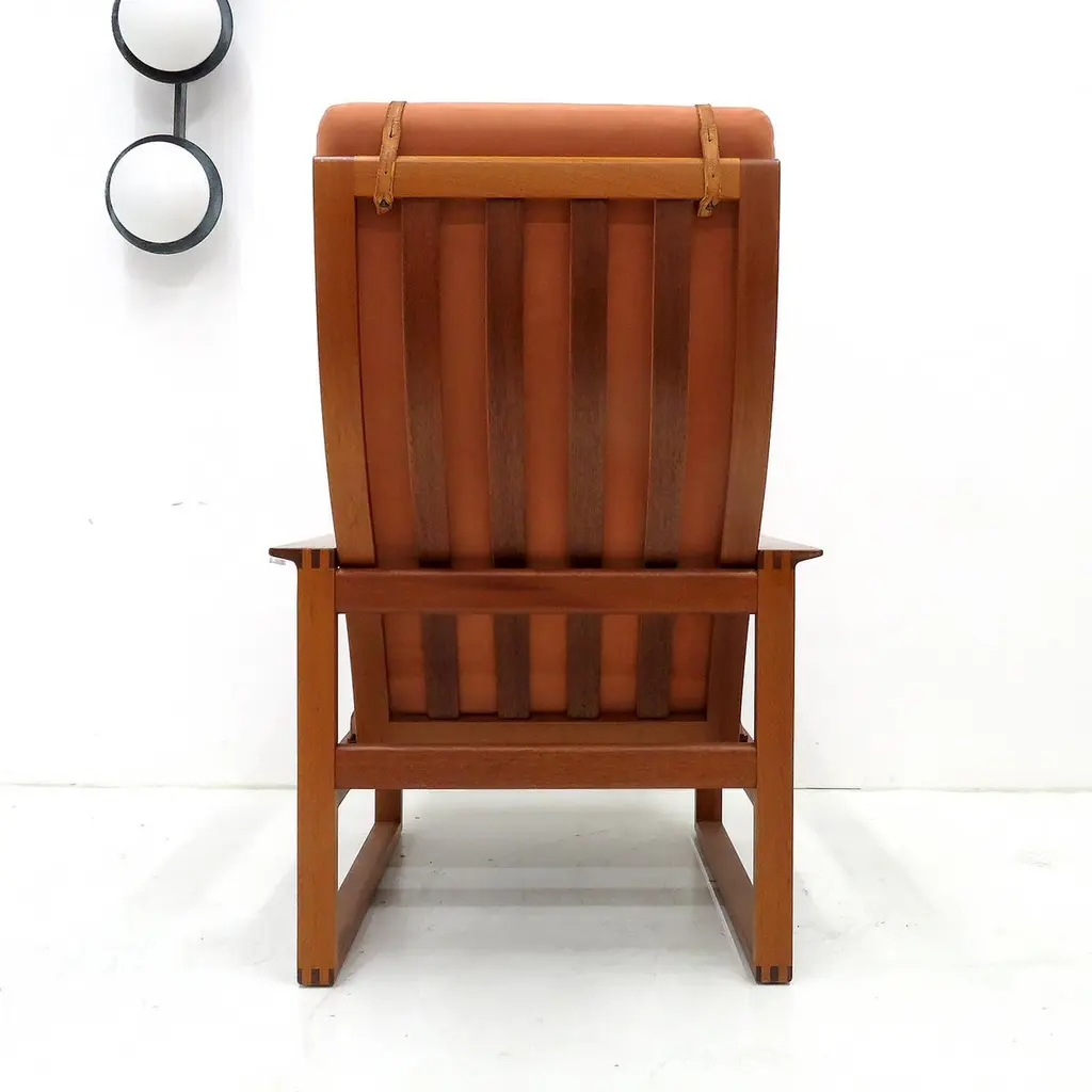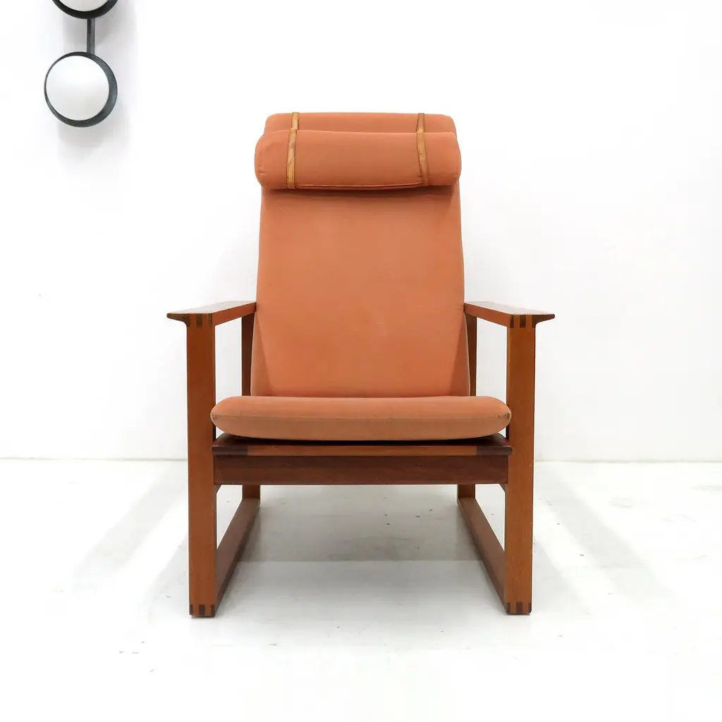 Wonderful highback lounge chairs 'BM-2254/ Slædestolen' designed by Børge Mogensen in 1956 and produced by Fredericia Stolefabrik, Sweden, mahogany frame with adjustable seat and back, original coral-coloured alcantara upholstery and full grain leather straps for the seat cushion and headrest, labeled. Two chairs available.Priced individually.