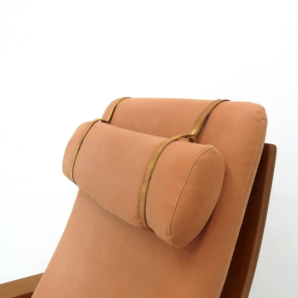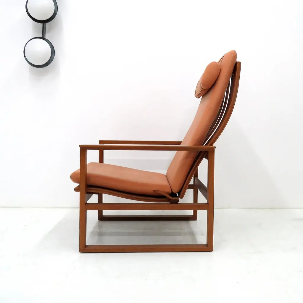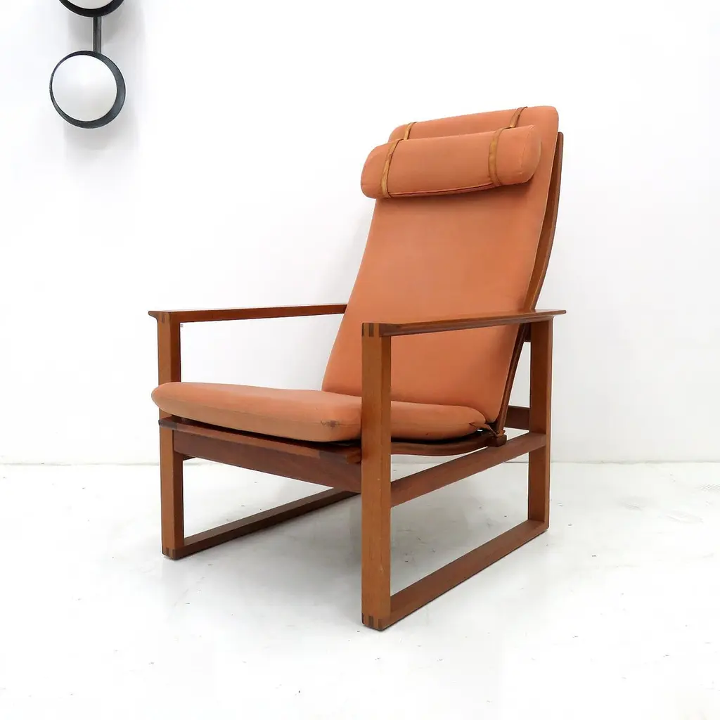 Wonderful highback lounge chairs 'BM-2254/ Slædestolen' designed by Børge Mogensen in 1956 and produced by Fredericia Stolefabrik, Sweden, mahogany frame with adjustable seat and back, original coral-coloured alcantara upholstery and full grain leather straps for the seat cushion and headrest, labeled. Two chairs available.Priced individually.